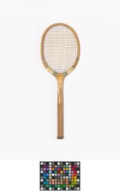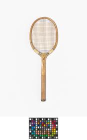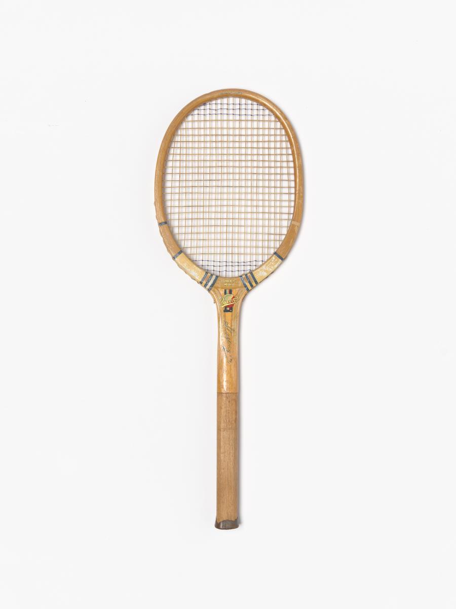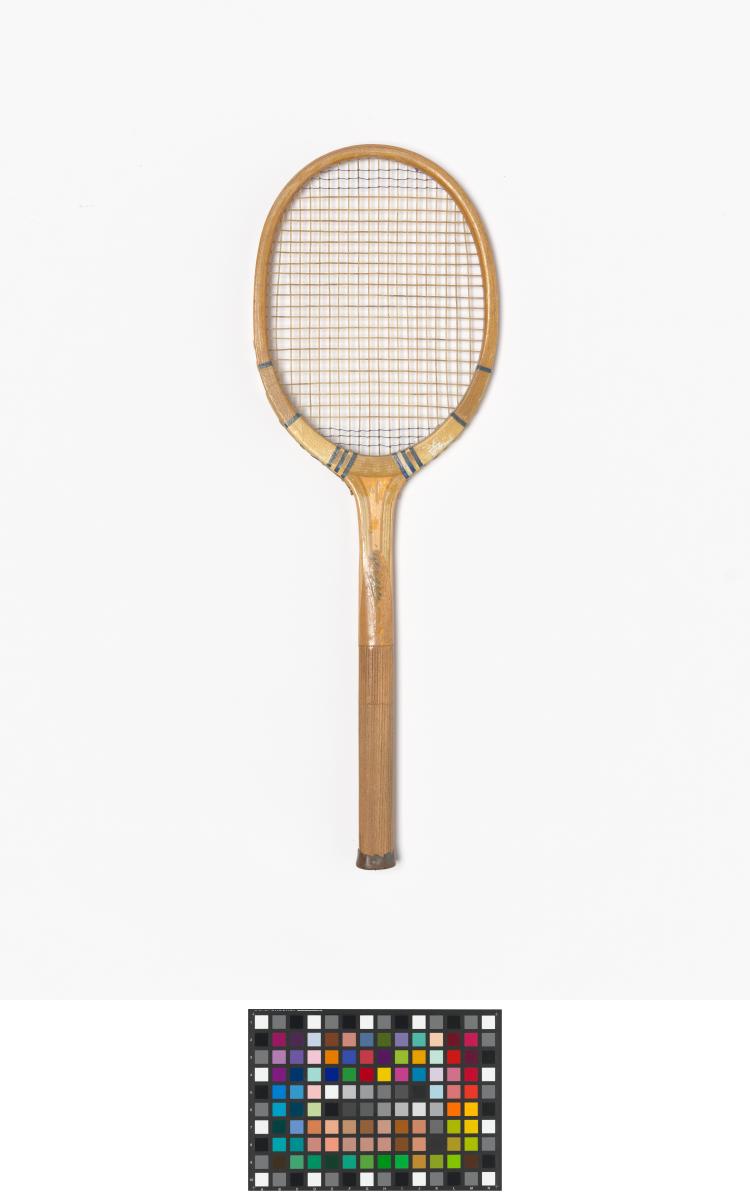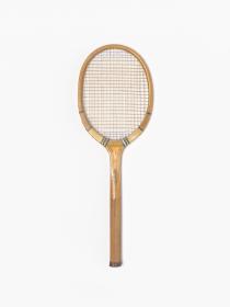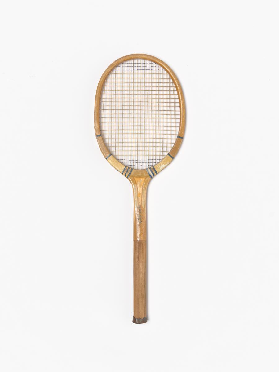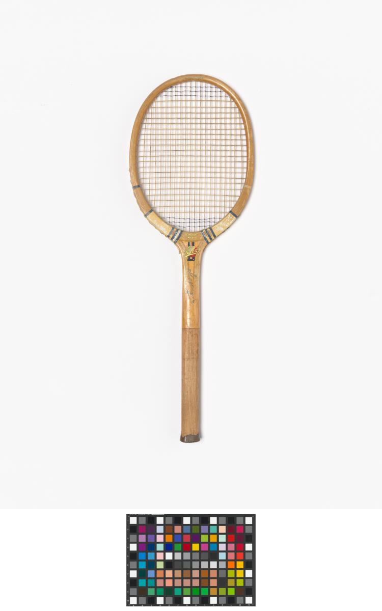 Ovale (but slightly flat top-headed) frame with concave wedge. Horizontal stringing. Octogonal handle with grooves. Leather butt cap. English ash.