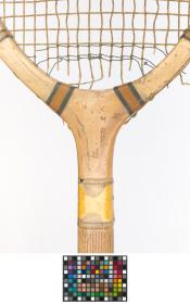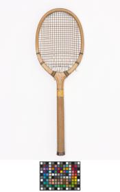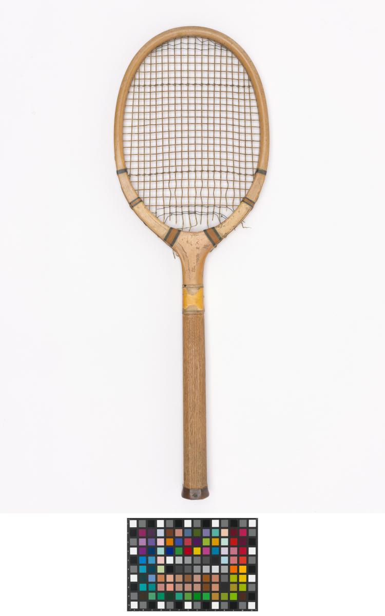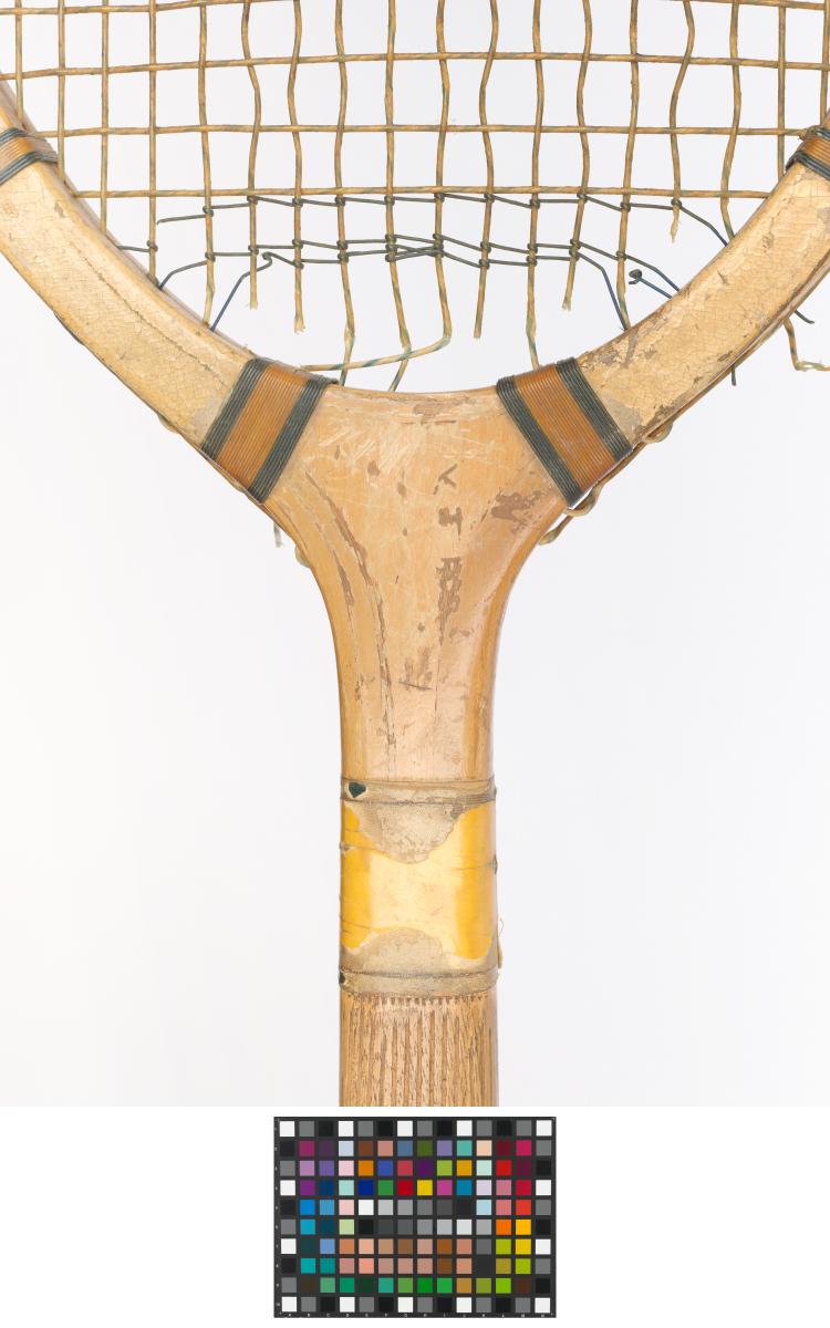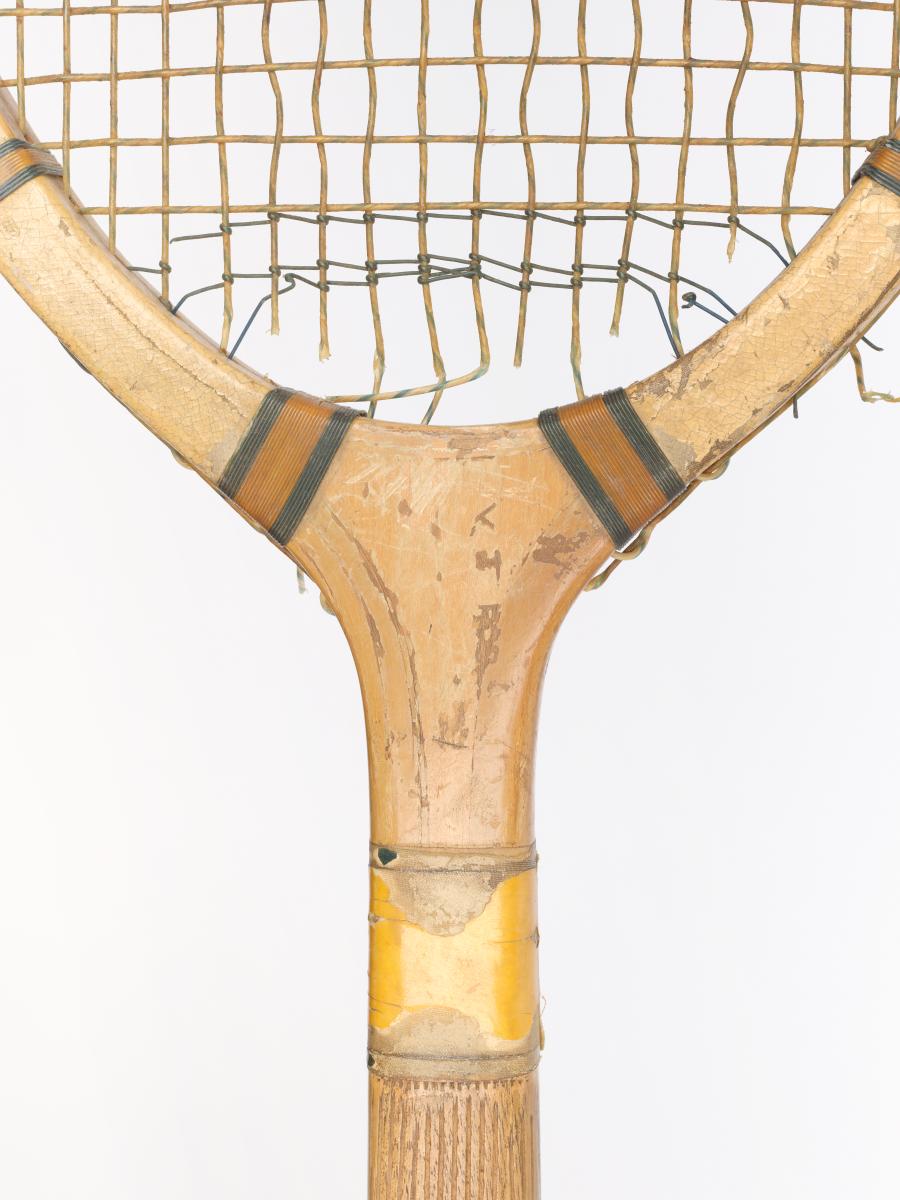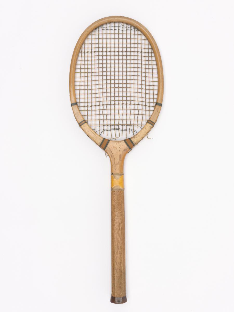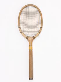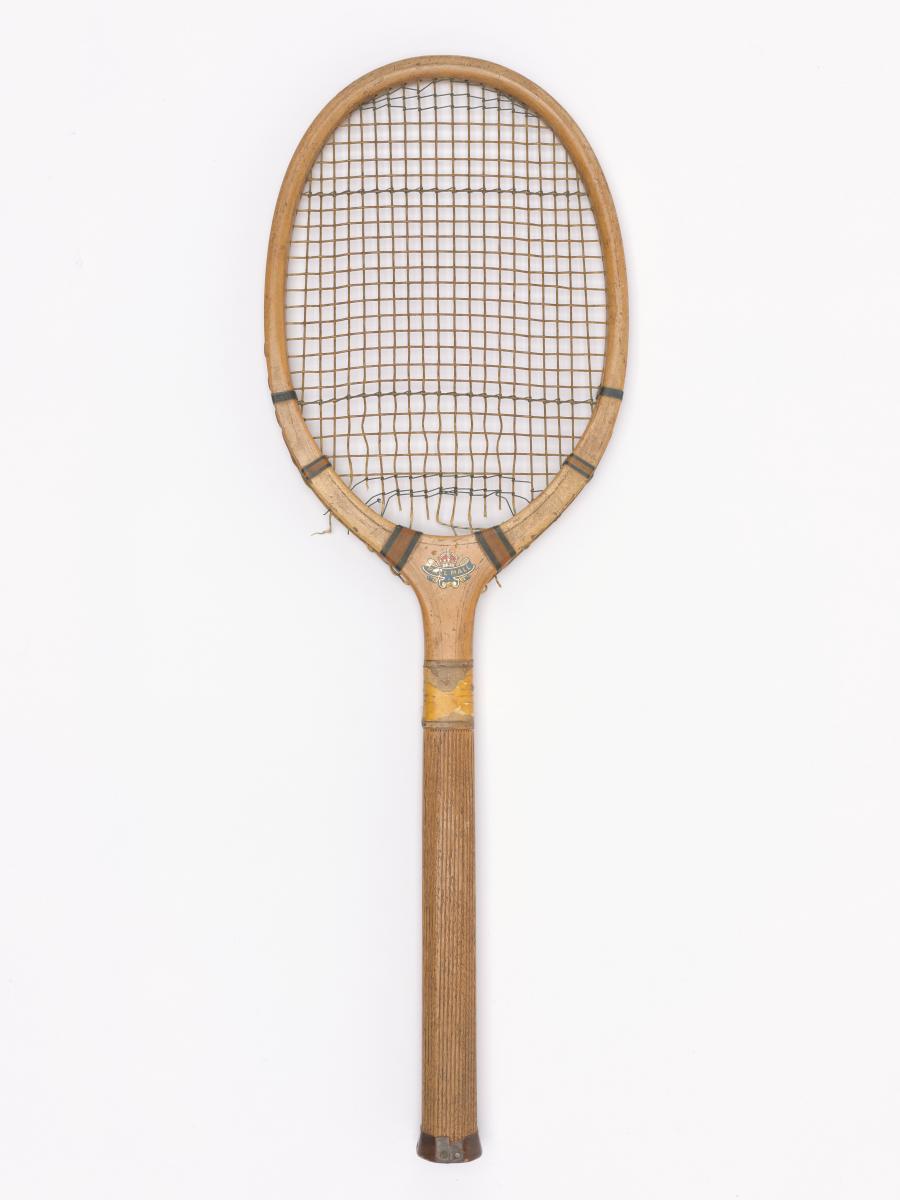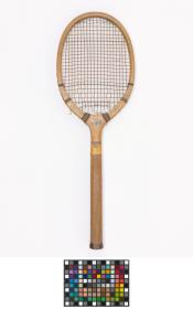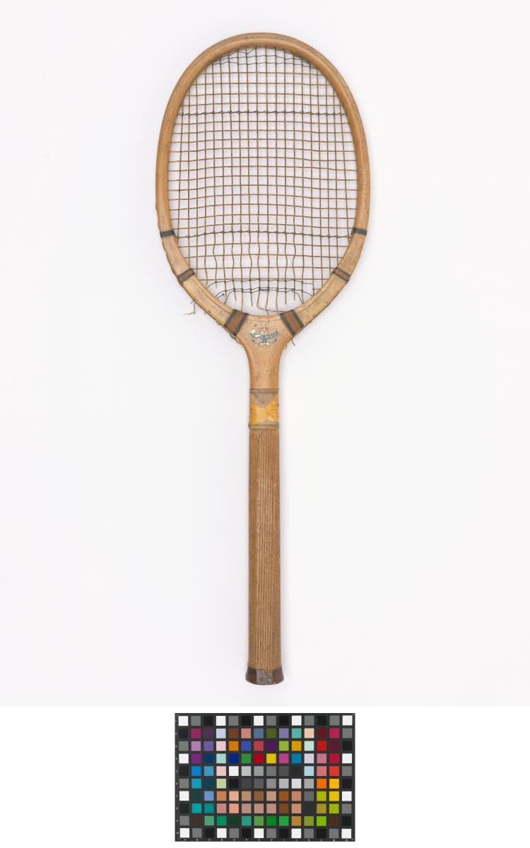 Ovale frame with concave wedge. Horizontal stringing. Octogonal handle with deep fine grooves. Leather butt cap. Transfer with a crown.