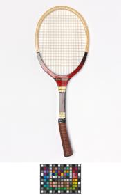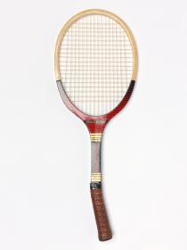Ovale frame with concave wedge. Horizontal plastic stringing. Excentered and octogonal handle with leather (synthetic ?) grip. Plastic butt cap.