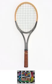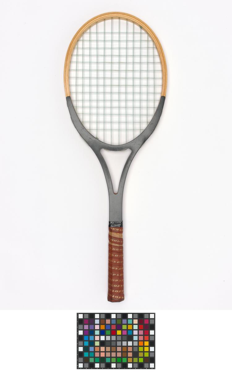 Ovale frame with concave wedge. Horizontal plastic stringing. Open-heart, twin-shaft construction. Octogonal handle with leather grip. Plastic butt cap.