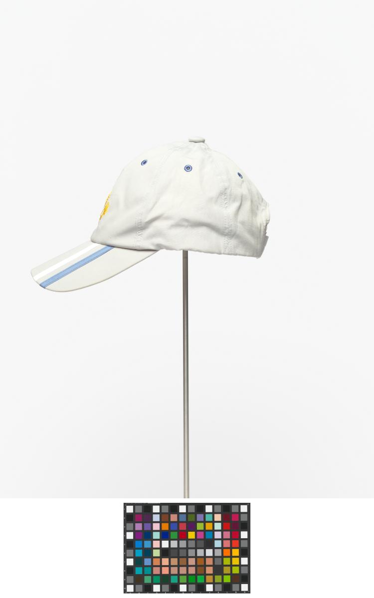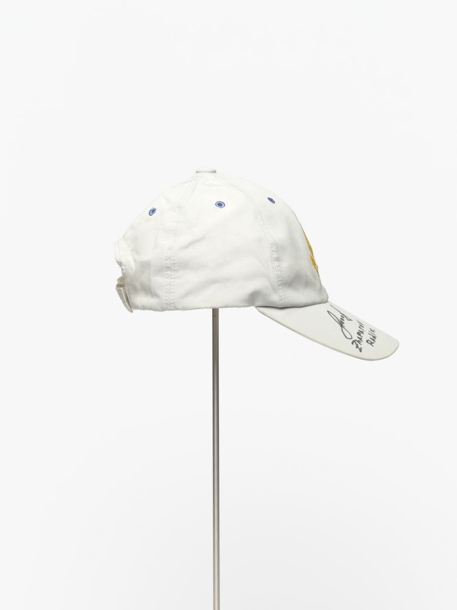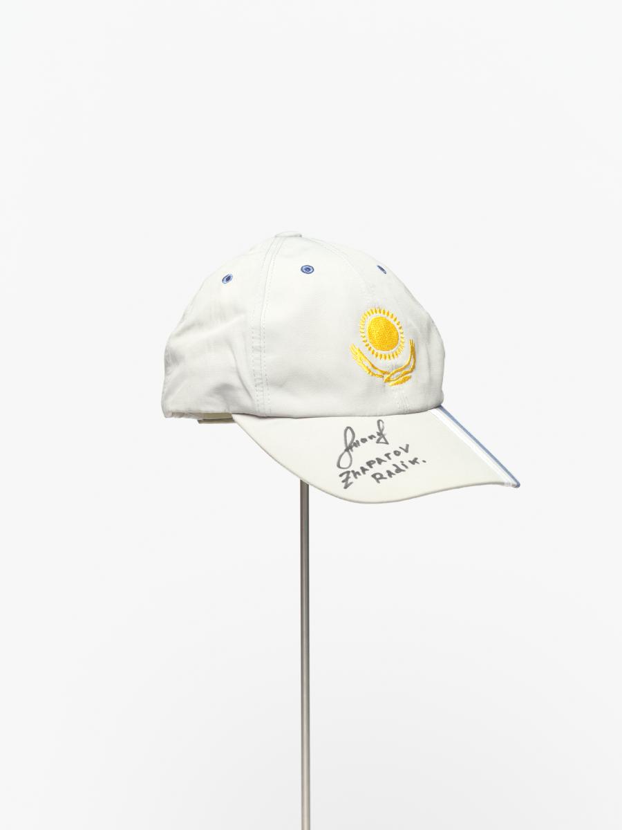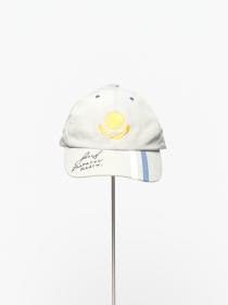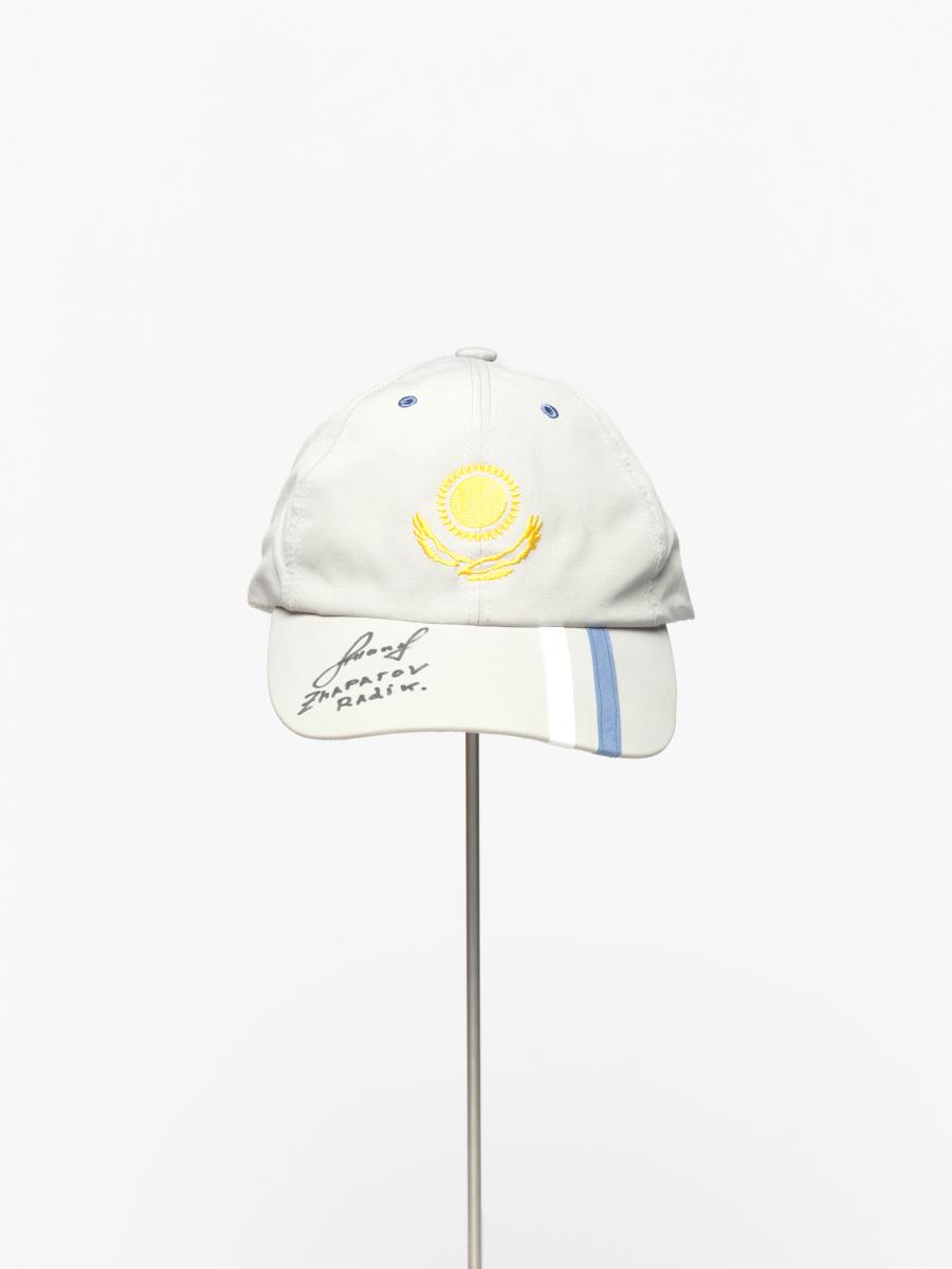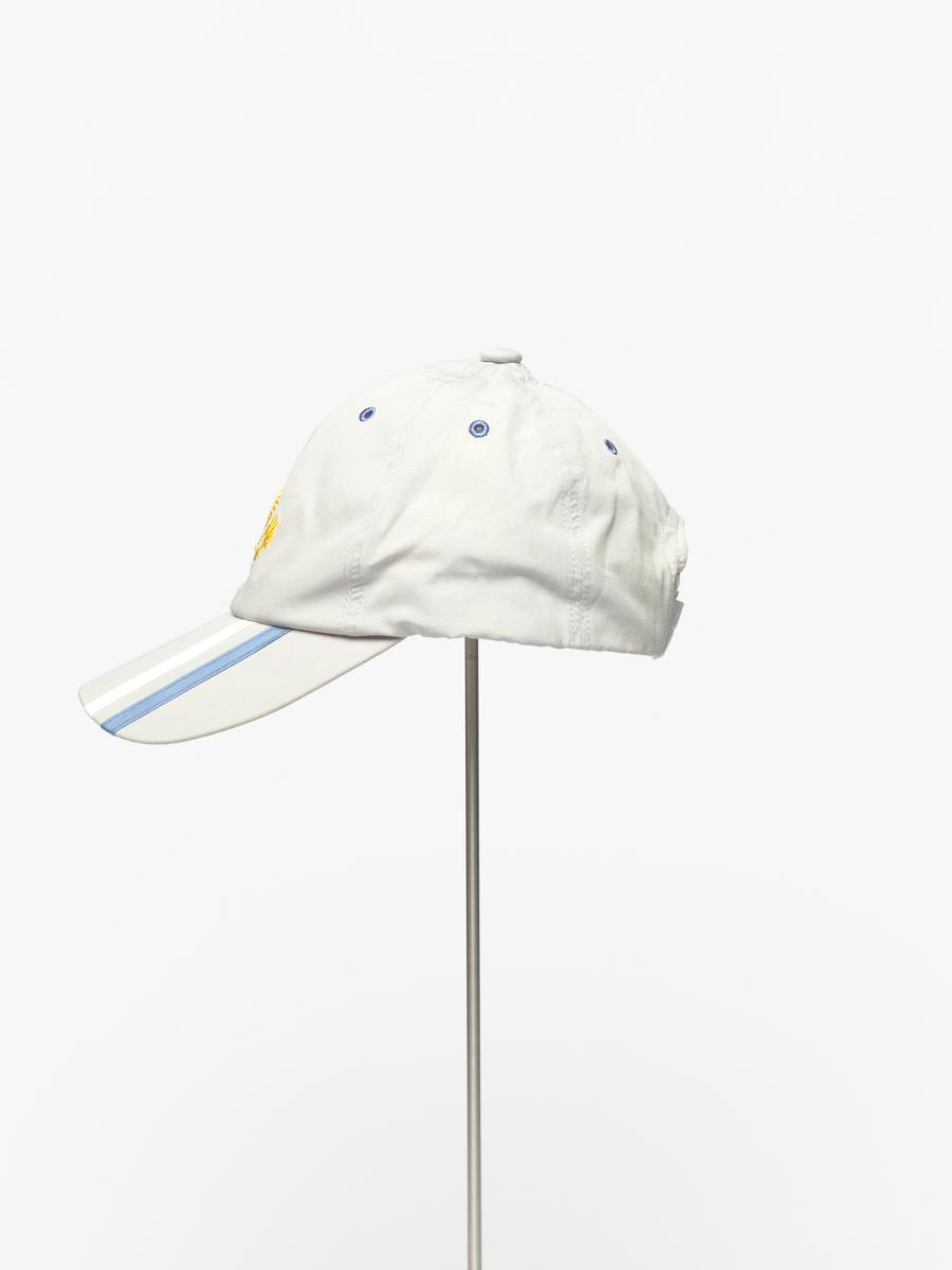 Gray cap with the sun and the eagle of the national flag. Two stripes, one white and the other blue on the visor with the signature of the athlete. One size.
