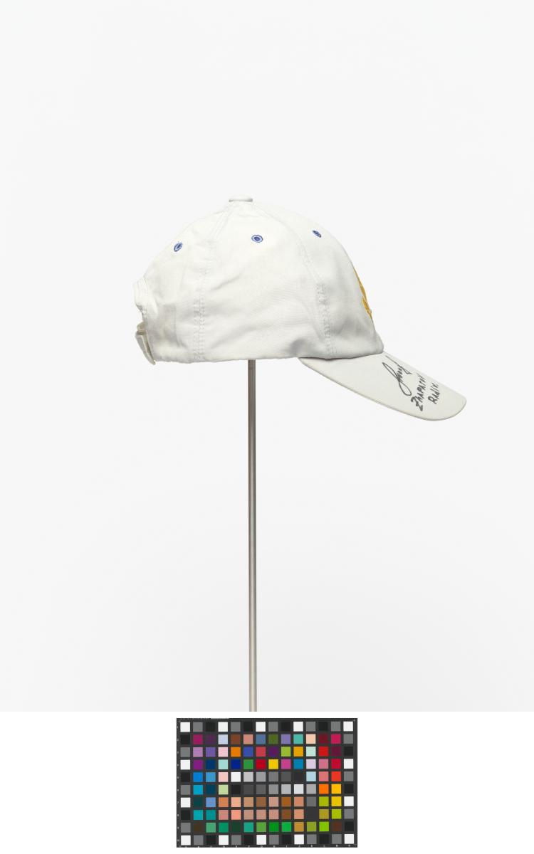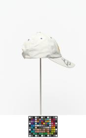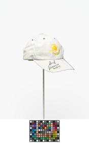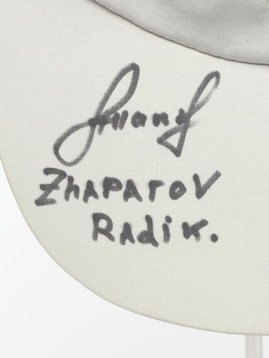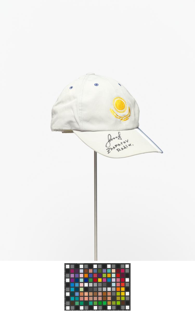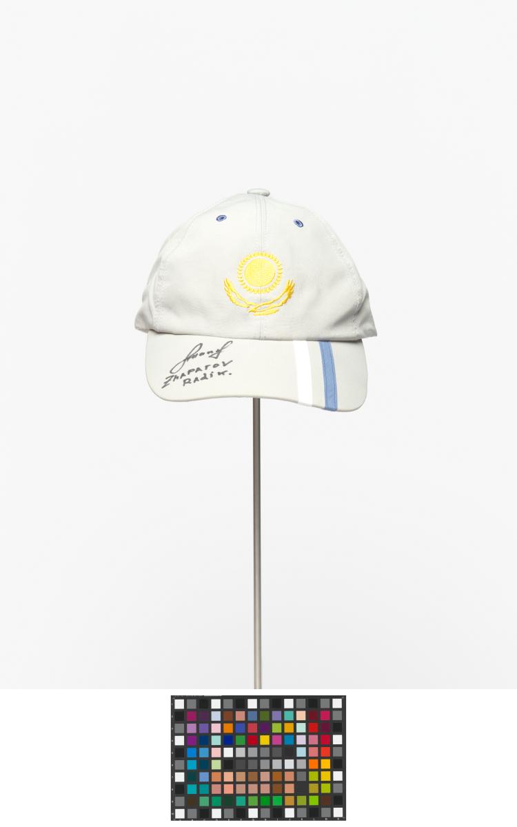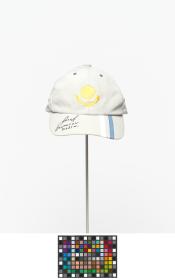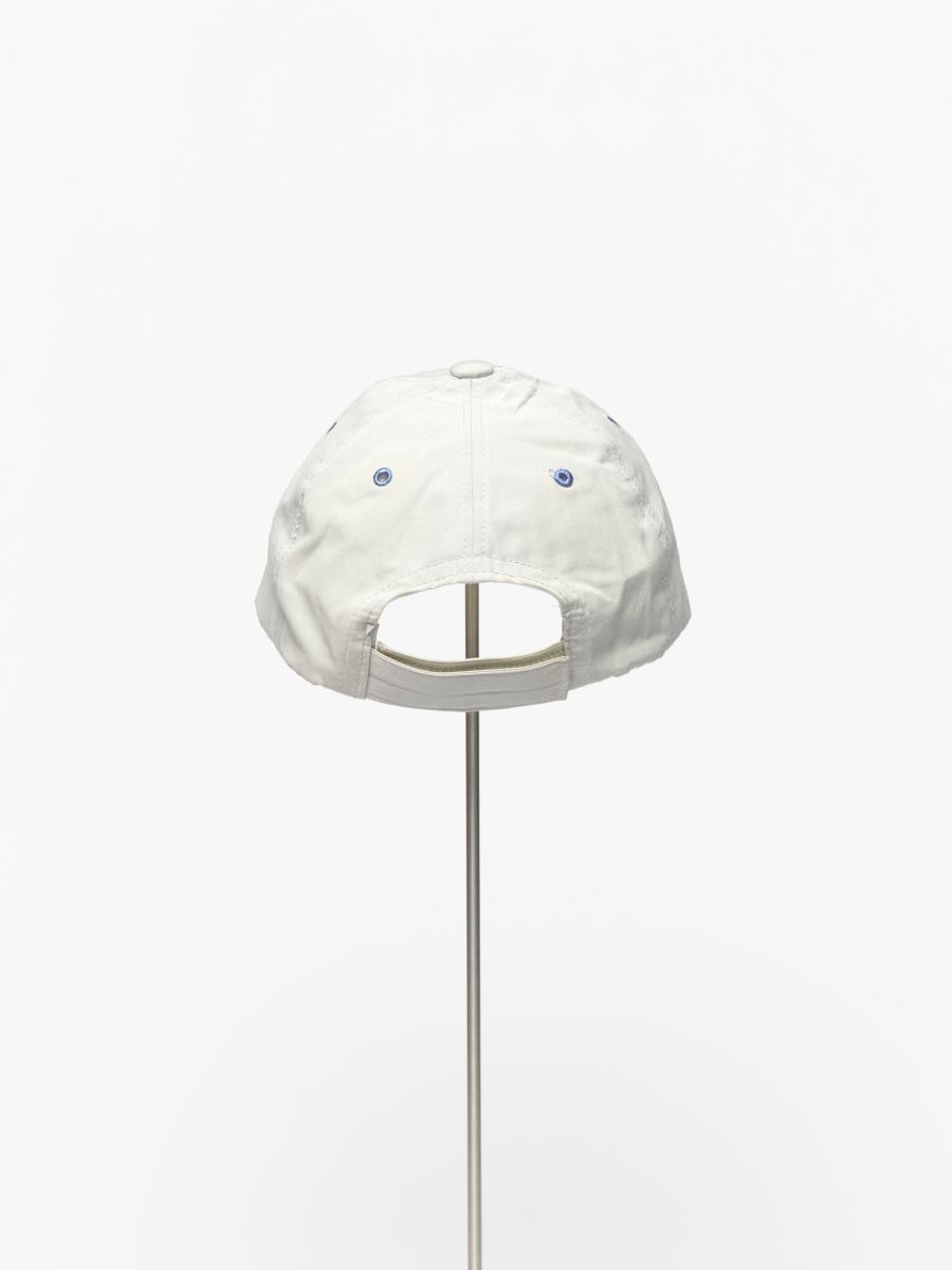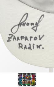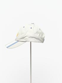 Gray cap with the sun and the eagle of the national flag. Two stripes, one white and the other blue on the visor with the signature of the athlete. One size.