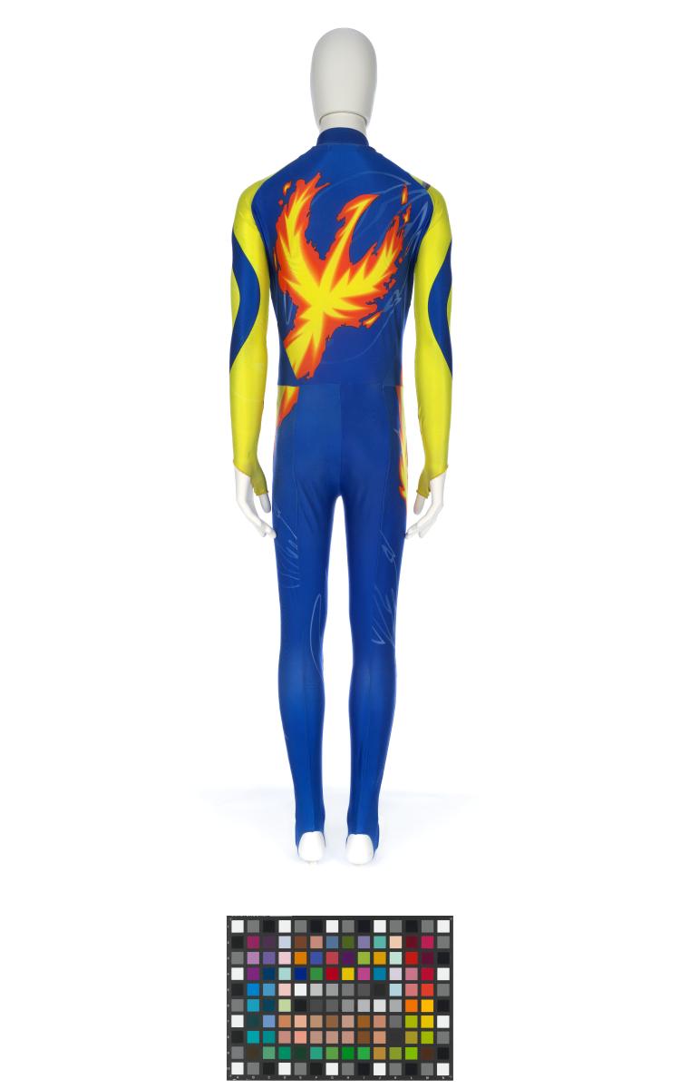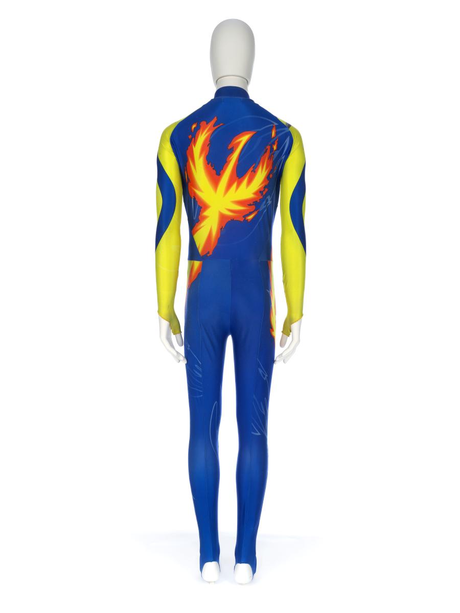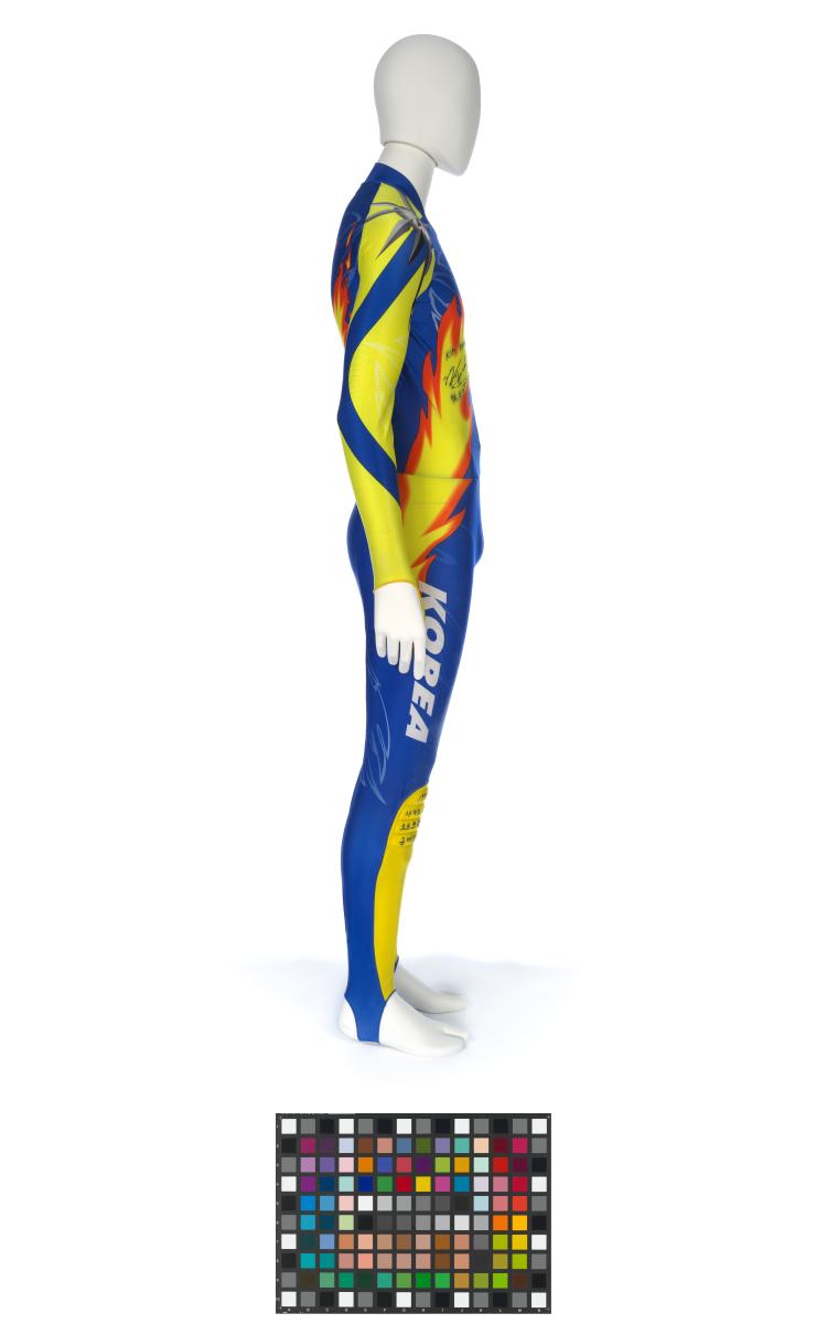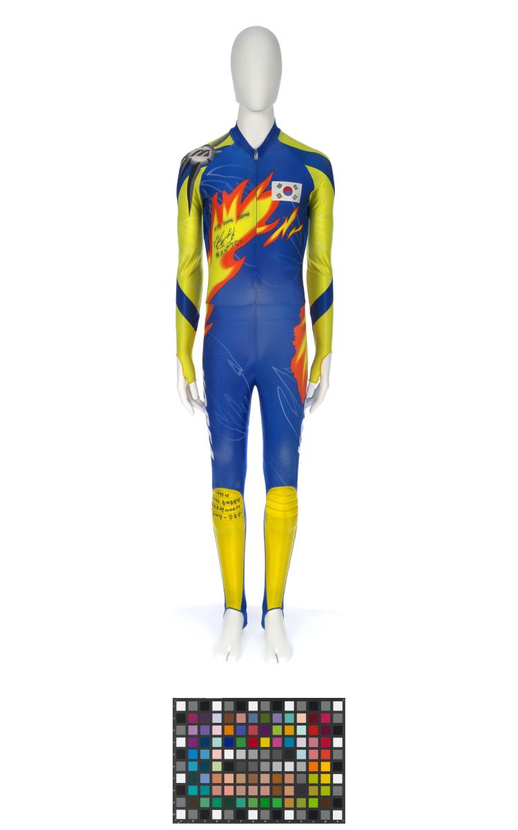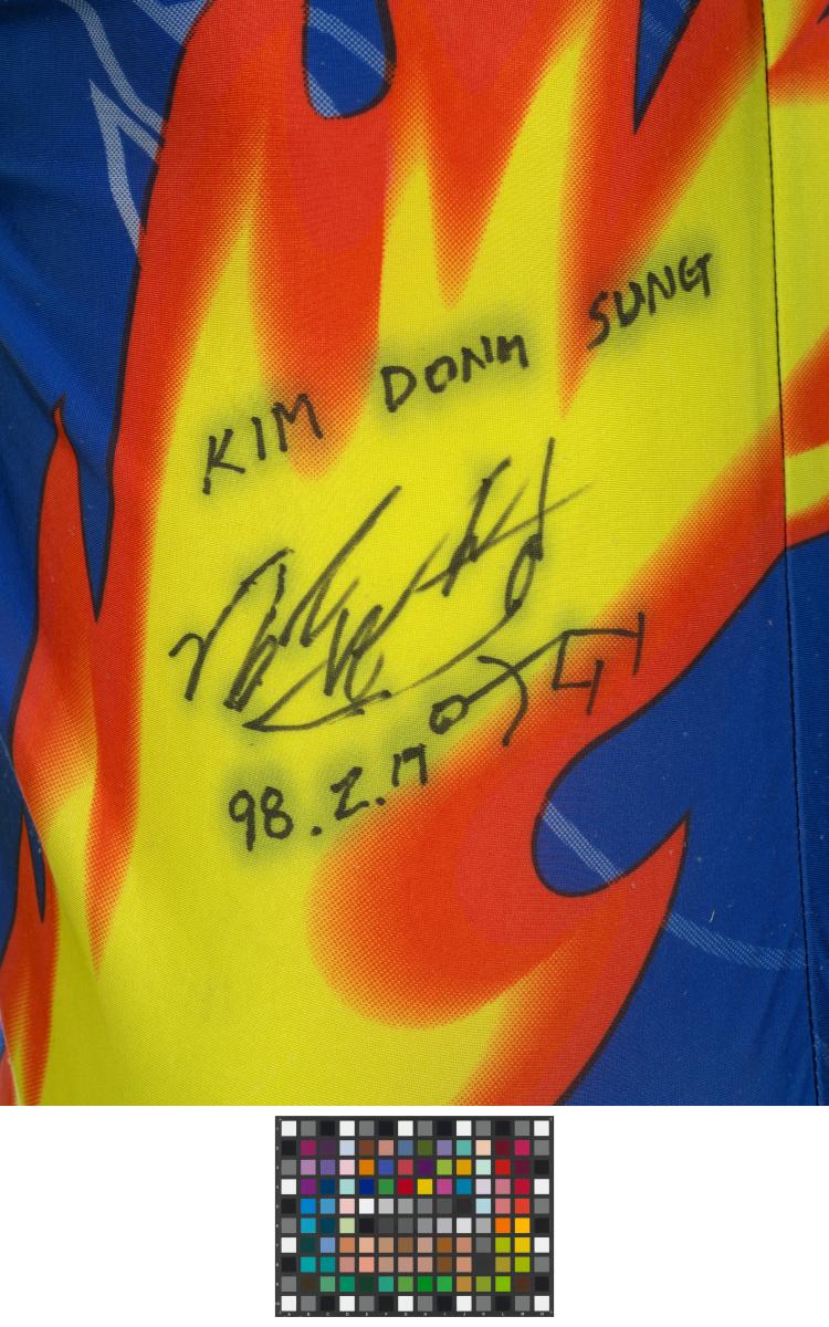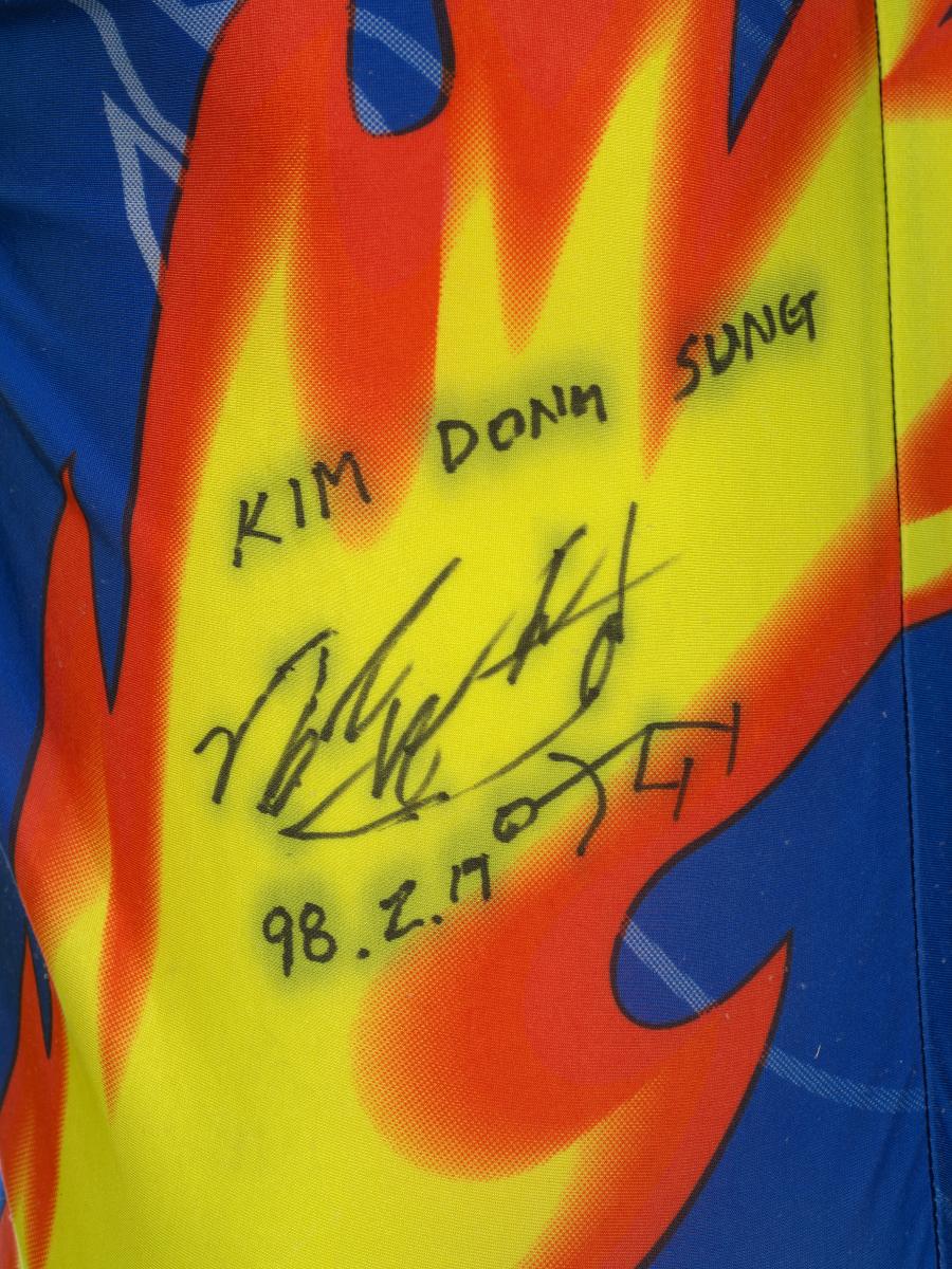 Blue and yellow suit with featured flames and patches on the knee. Korean flag on the front with dedication: "Kim Dong Sung 98.2.19" with signature and a drwn skater. Phoenix on the back.