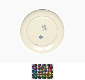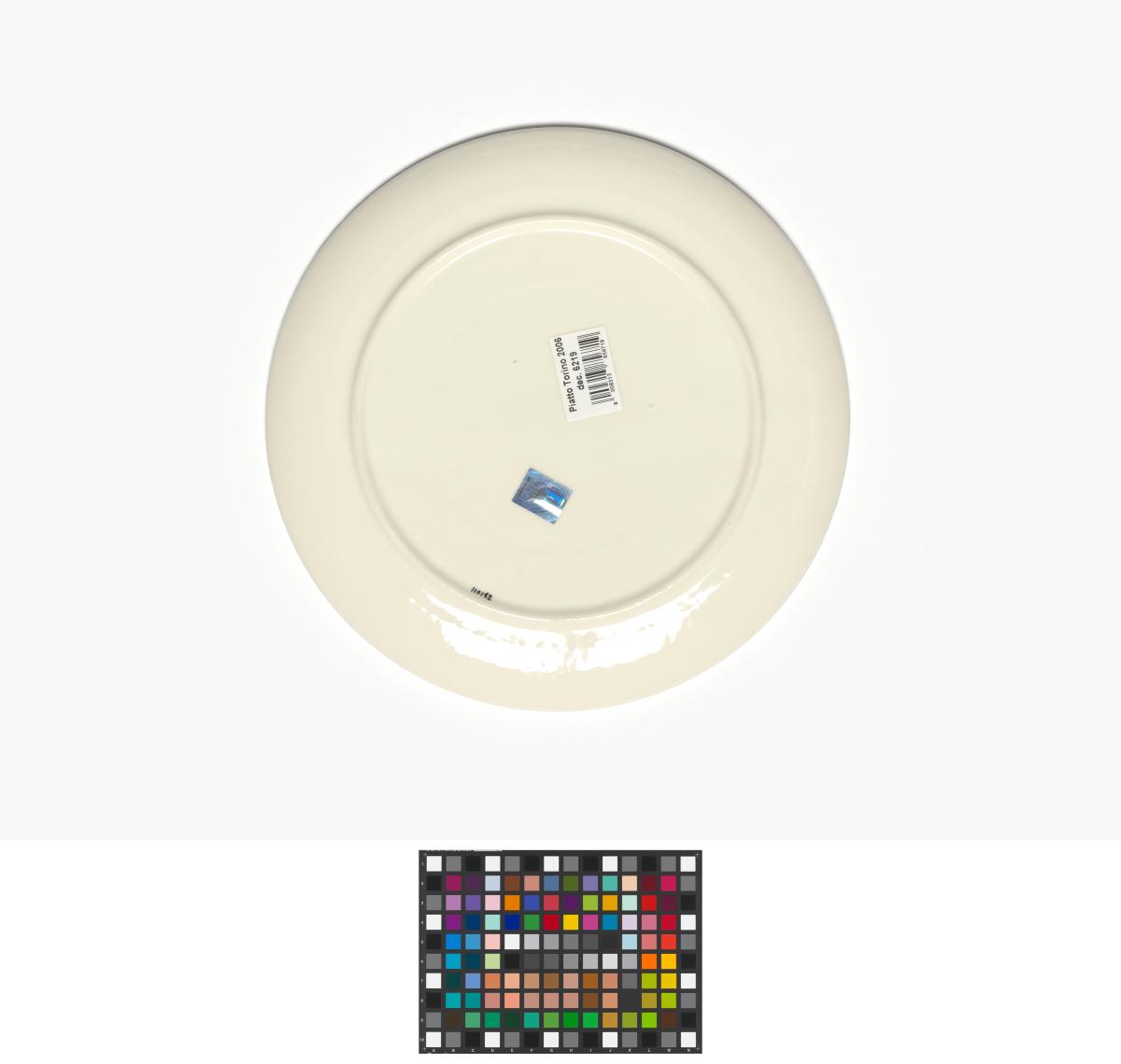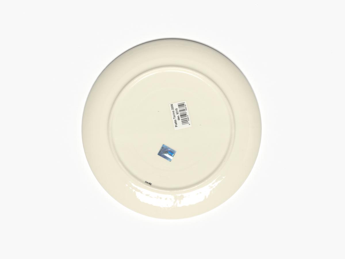 Pizza plate with Neve, a Games' mascot as a cross country skier. At the top, stylized snowflakes. Caption: "torino 2006".