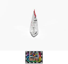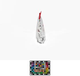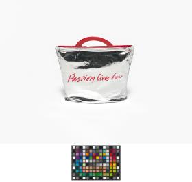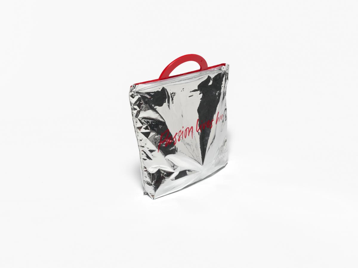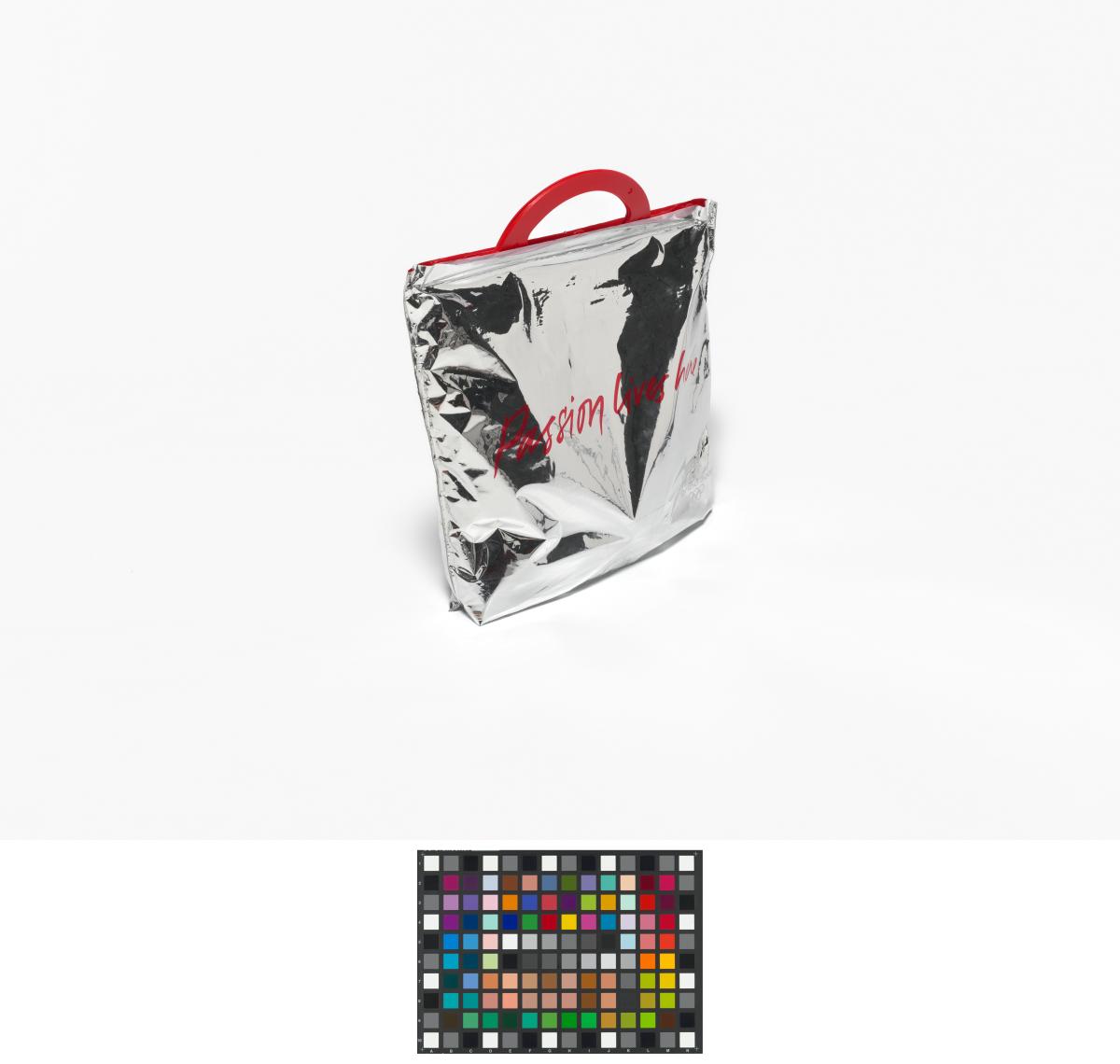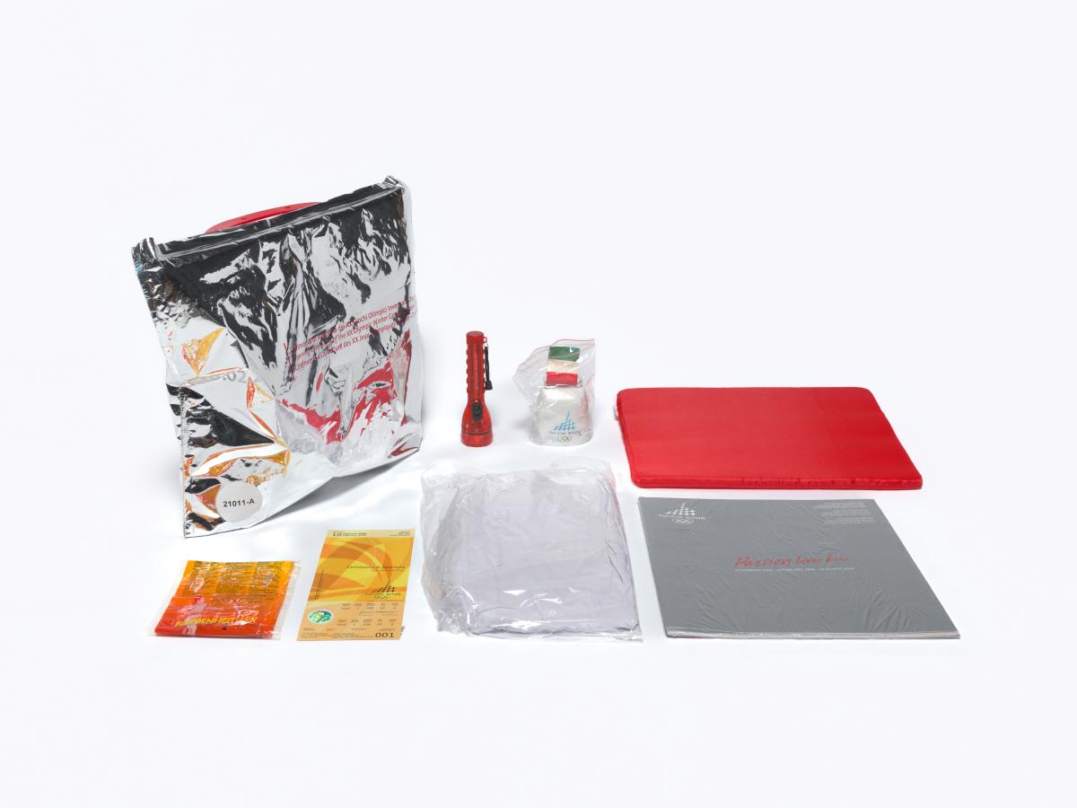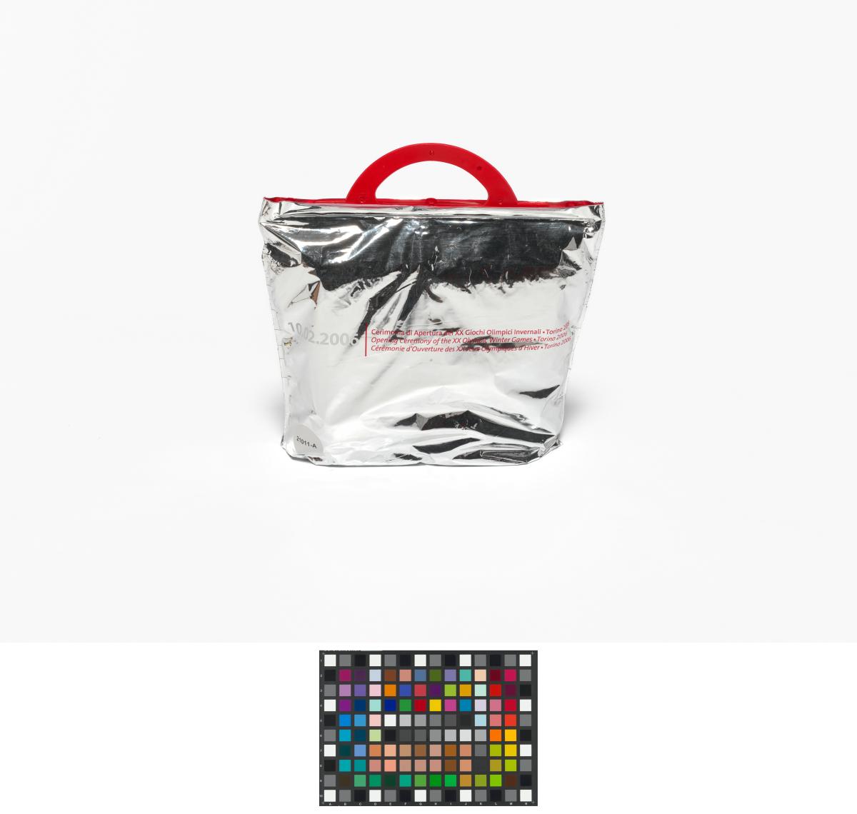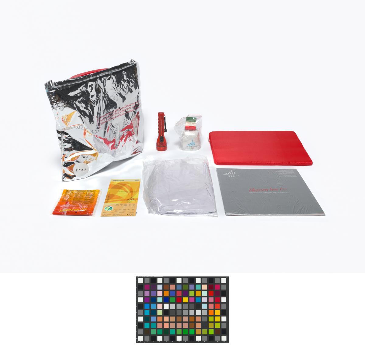 Silvered bag with a bell (N° 110615-001), a place mat (N° 110615-002), a torch lamp (N° 110615-003), a booklet (N° 110615-004), an hand warmer (N° 110615-005) and a cape (N° 110615-006).