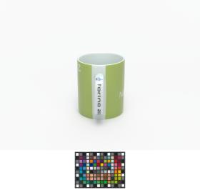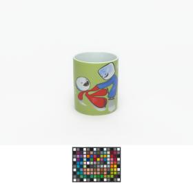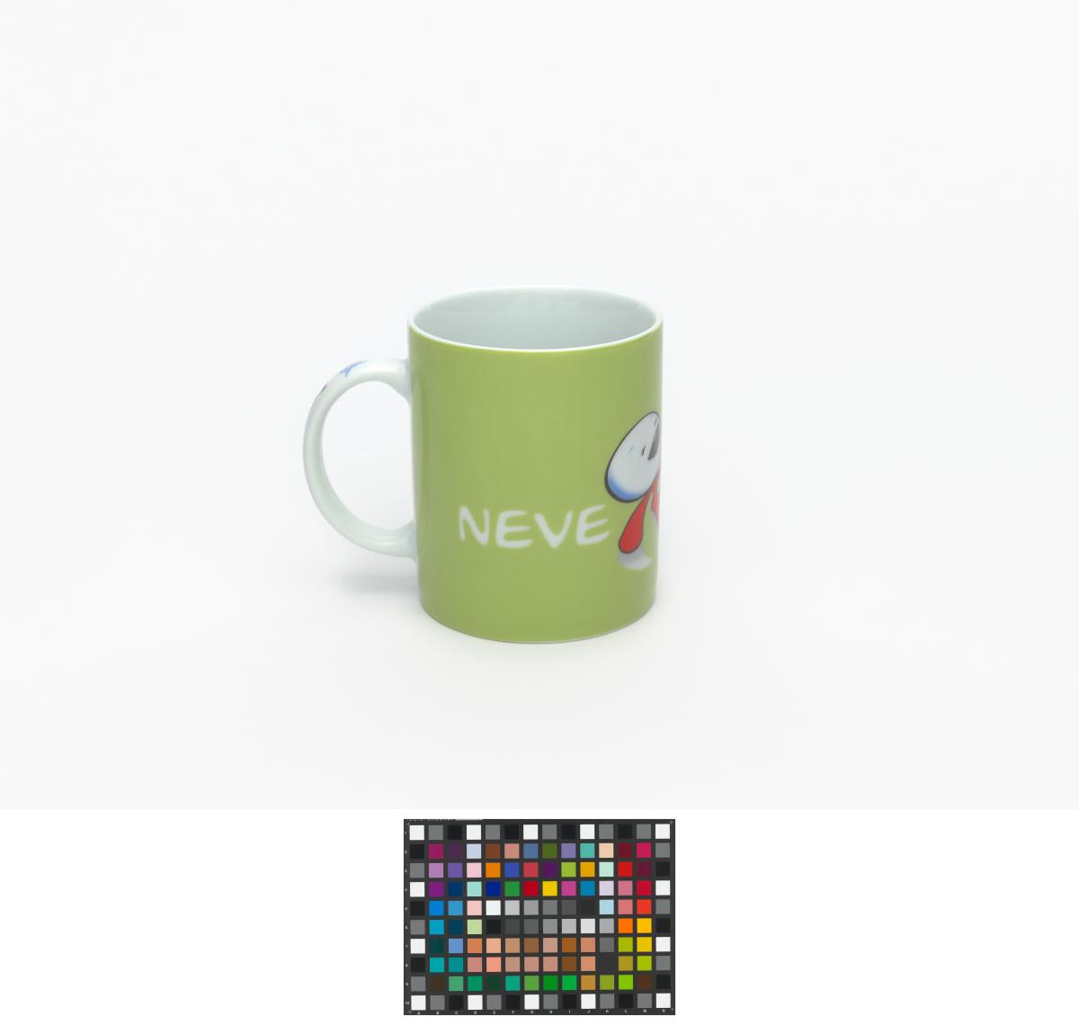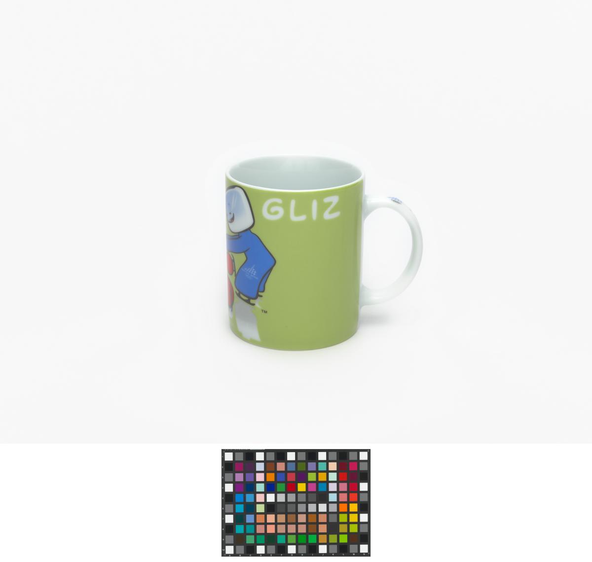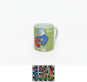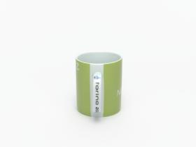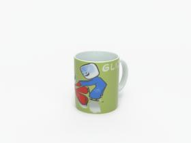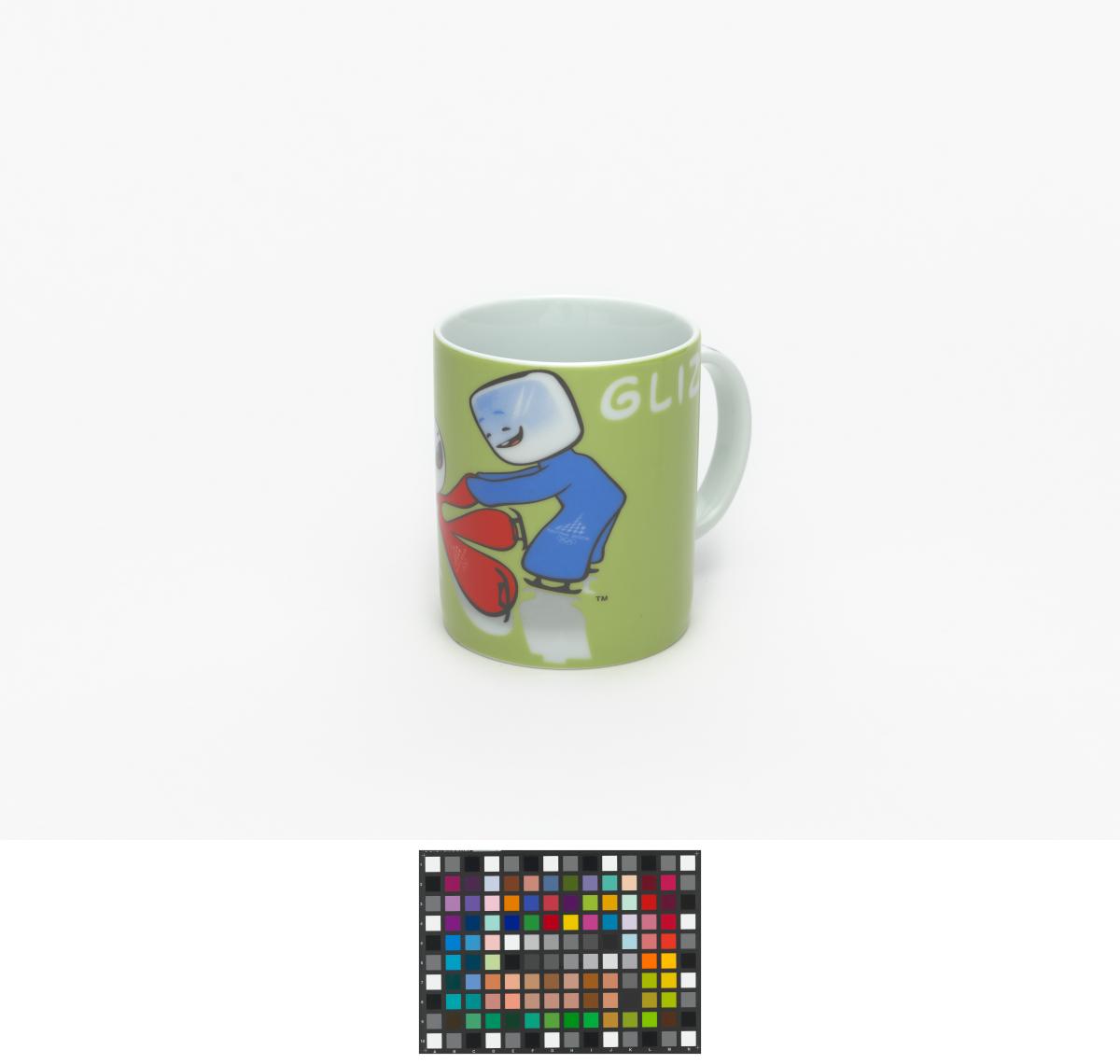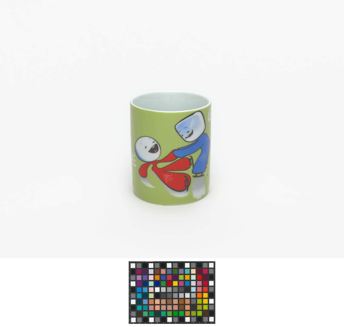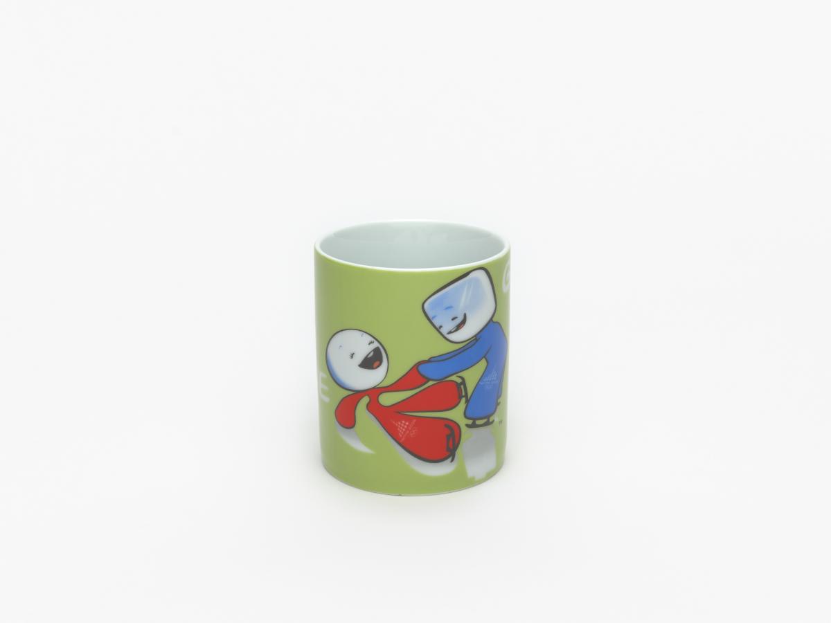 Green mug with the Games' mascots skating. Original plastic wrapping with a hologramme label.