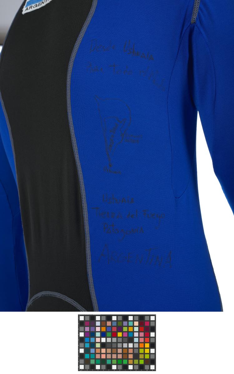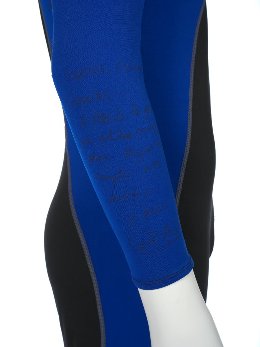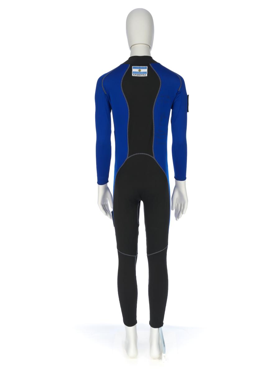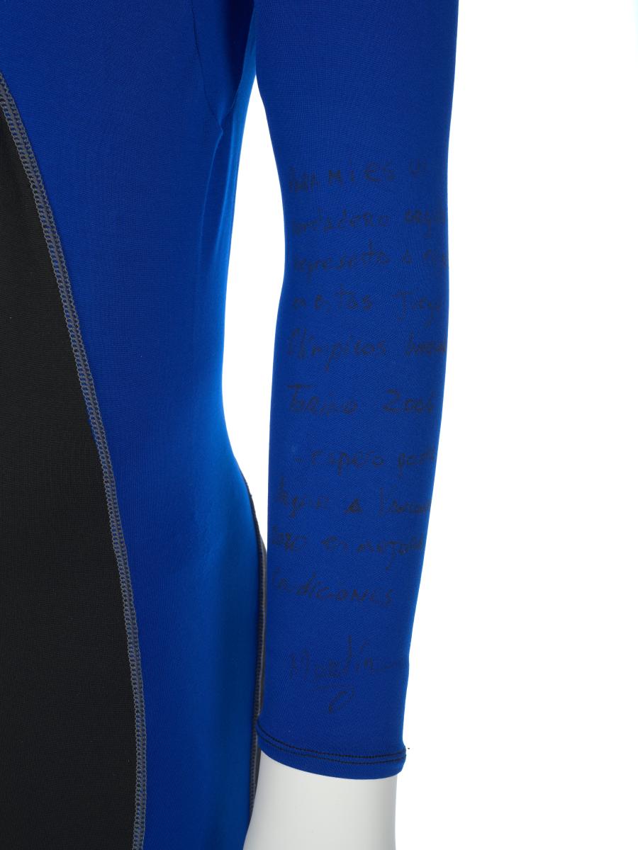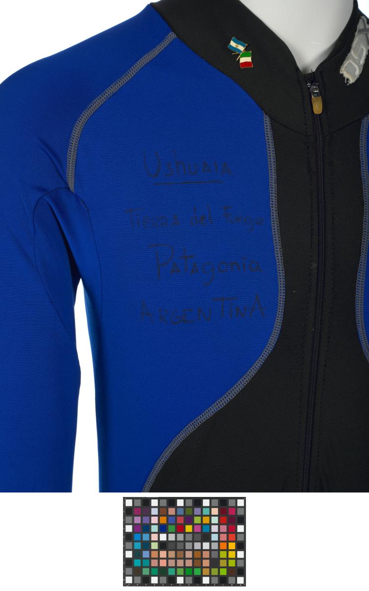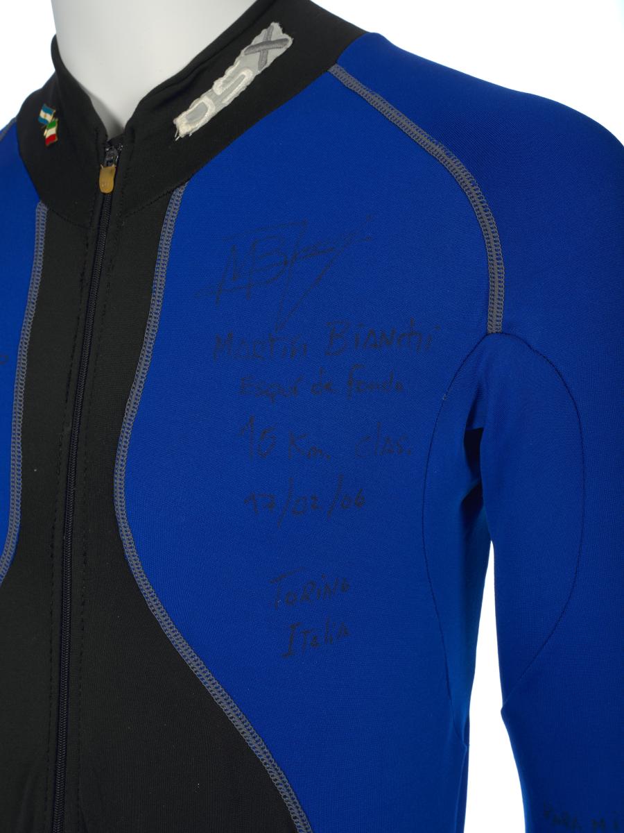 Black and blue suit. Emblem of the Argentinian NOC on the right shoulder and left tight. Argentine flag on the back. Dedications on the front: "Ushuaia / Tierra del Fuego / Patagonia / Argentina" and "Martin Bianchi / Esquí de fondo / 15km. clas. / 17.02.06 / Torino / Italia" with the athlete's signature. Dedication on the left arm: "Para mies un / verdadero orgullo / represents a mi país / in estos Juego / Olimpicos Invernale / Torino 2006 / [-] espero goder / llegar a Vancouver / 2010 en mejores / condiciones" with the athlete's signature. Dedication on the back: "Desde Ushuaia / Para todo el Mundo / Ushuaia / Tierra del Fuego / Patagonia / Argentina" with a drawing of South America and Argentina and the cities of Buenos Aires and Ushuaia. Pin displaying the Argentinian and Italian flags on the collar. One size.