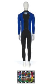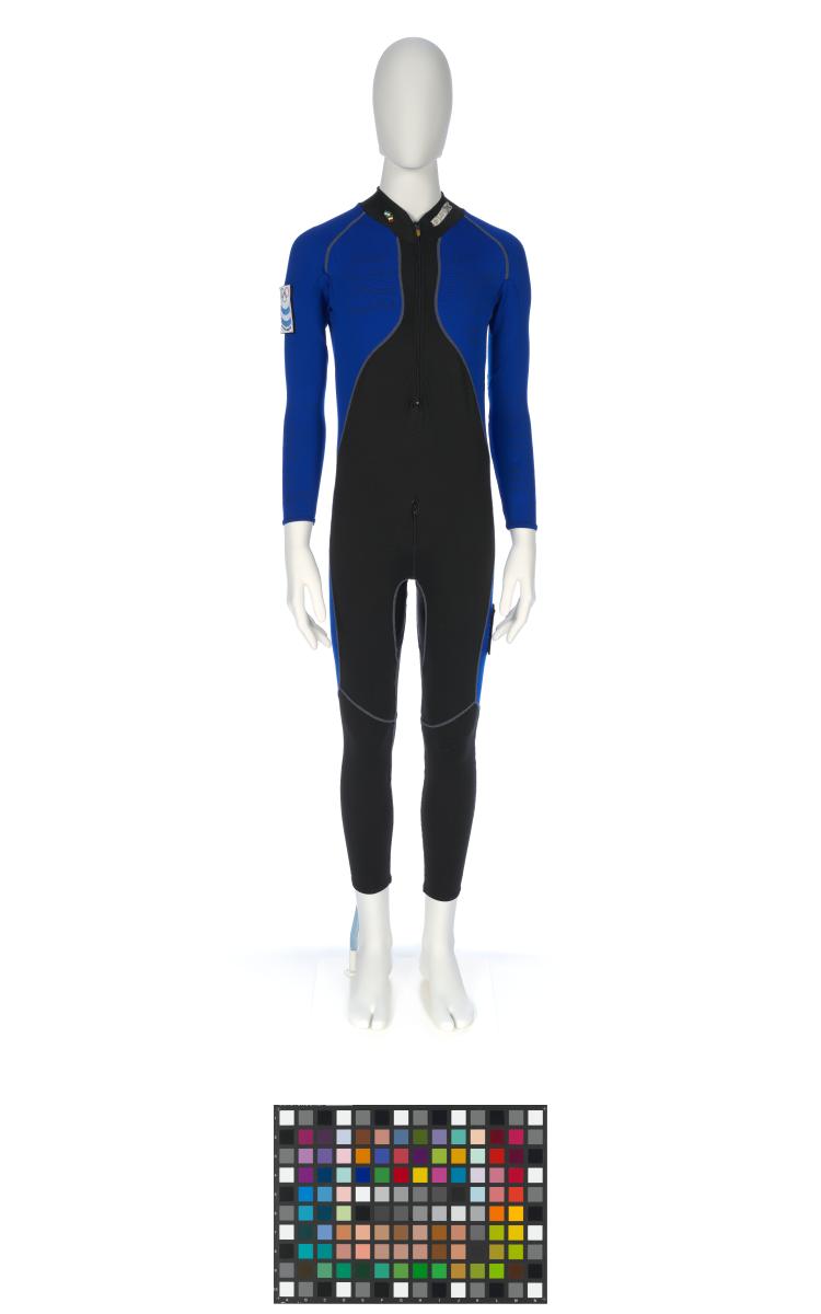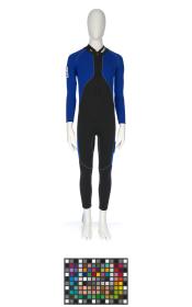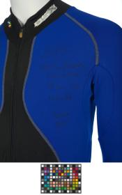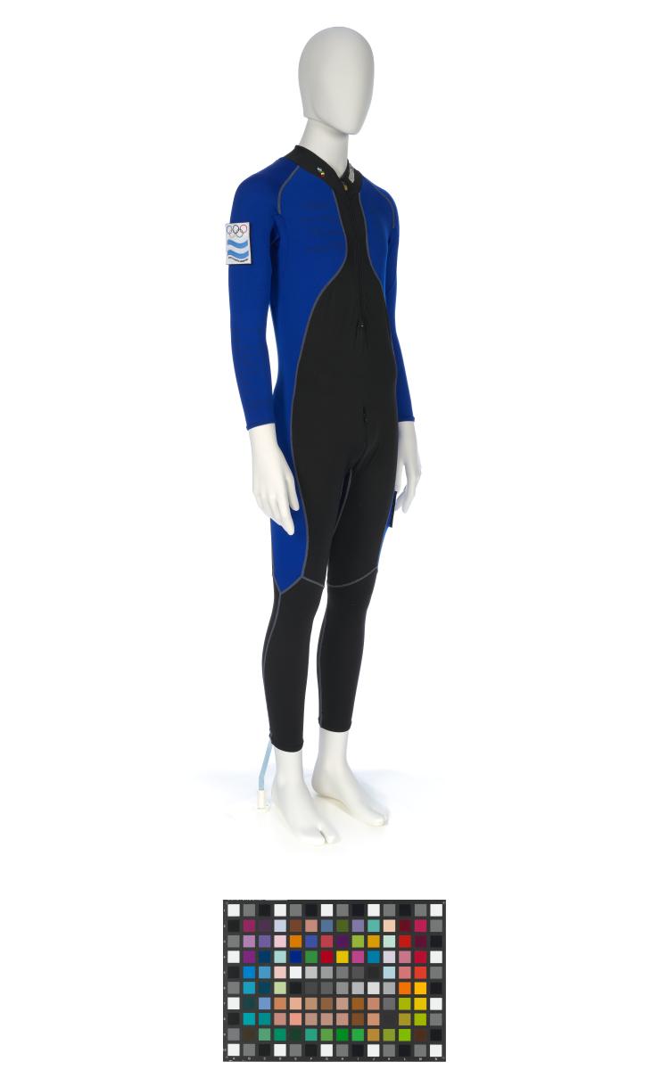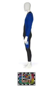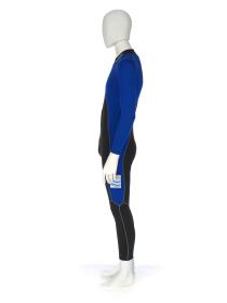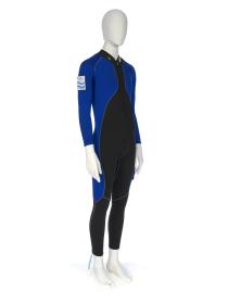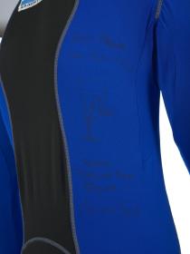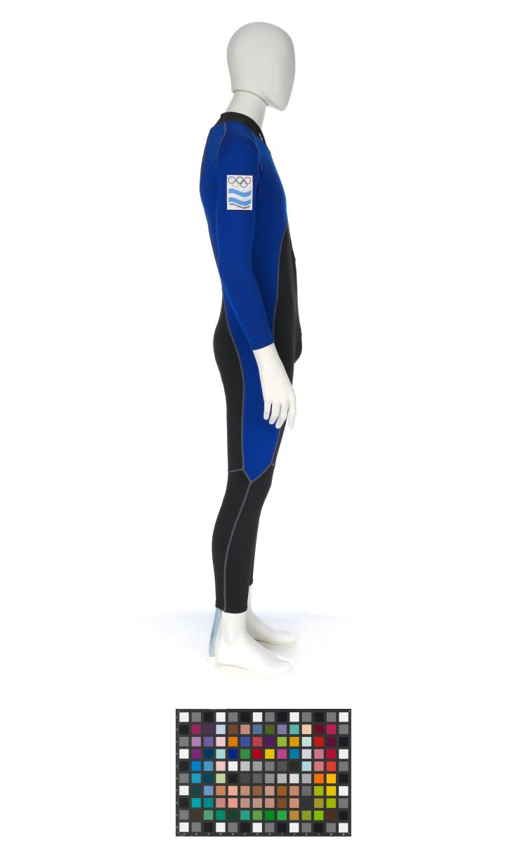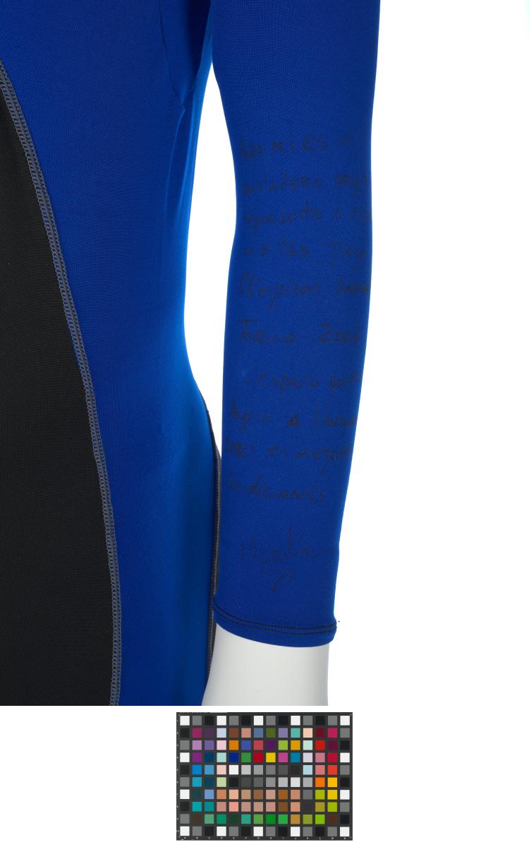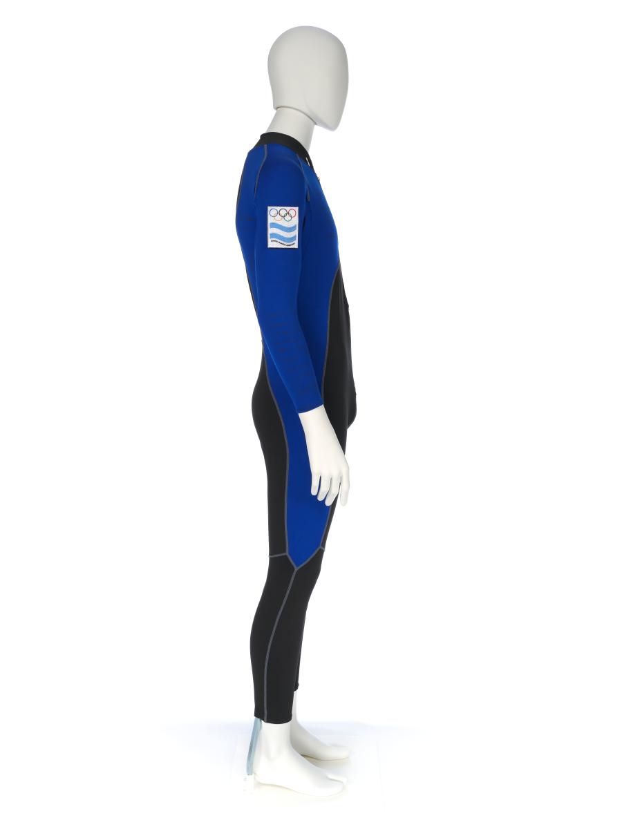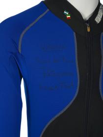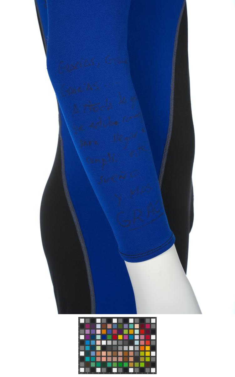 Black and blue suit. Emblem of the Argentinian NOC on the right shoulder and left tight. Argentine flag on the back. Dedications on the front: "Ushuaia / Tierra del Fuego / Patagonia / Argentina" and "Martin Bianchi / Esquí de fondo / 15km. clas. / 17.02.06 / Torino / Italia" with the athlete's signature. Dedication on the left arm: "Para mies un / verdadero orgullo / represents a mi país / in estos Juego / Olimpicos Invernale / Torino 2006 / [-] espero goder / llegar a Vancouver / 2010 en mejores / condiciones" with the athlete's signature. Dedication on the back: "Desde Ushuaia / Para todo el Mundo / Ushuaia / Tierra del Fuego / Patagonia / Argentina" with a drawing of South America and Argentina and the cities of Buenos Aires and Ushuaia. Pin displaying the Argentinian and Italian flags on the collar. One size.