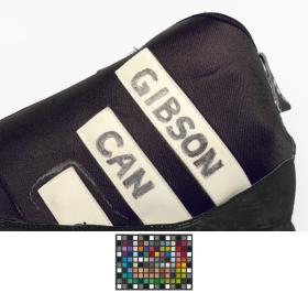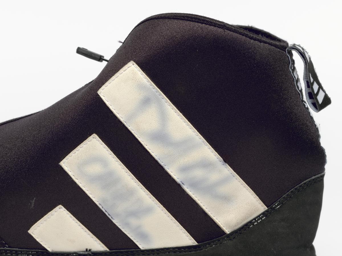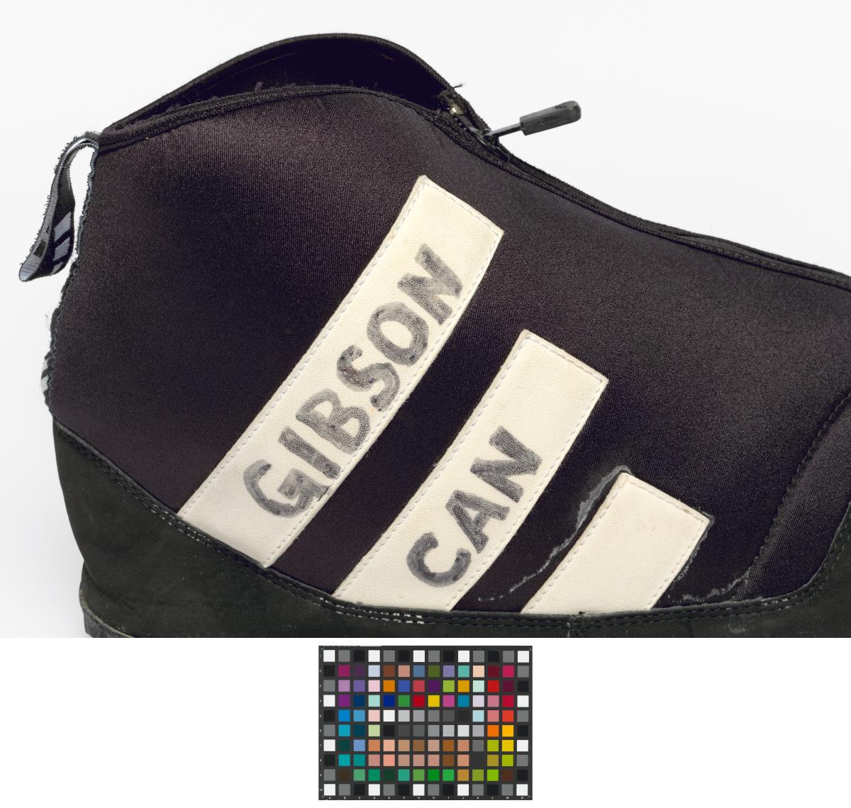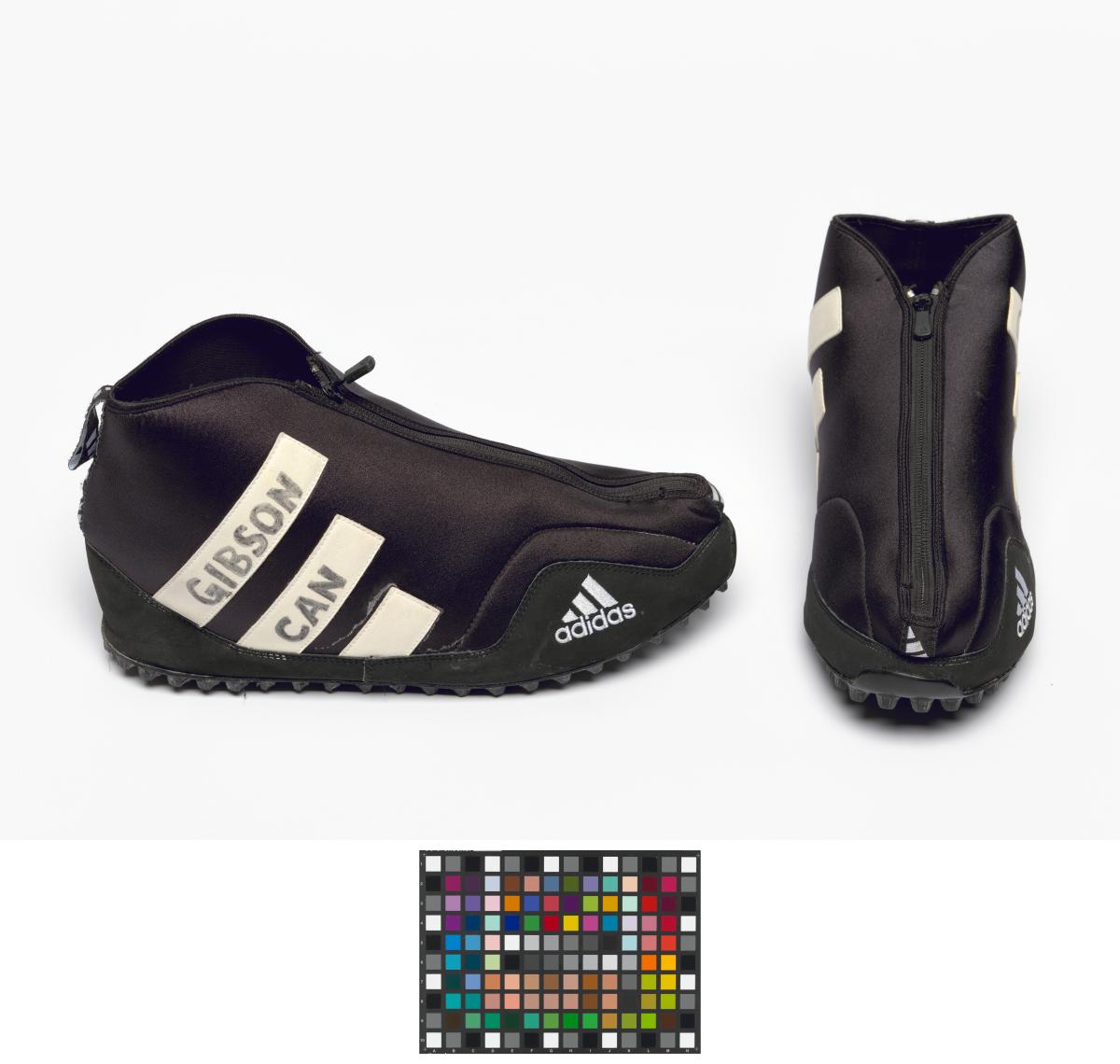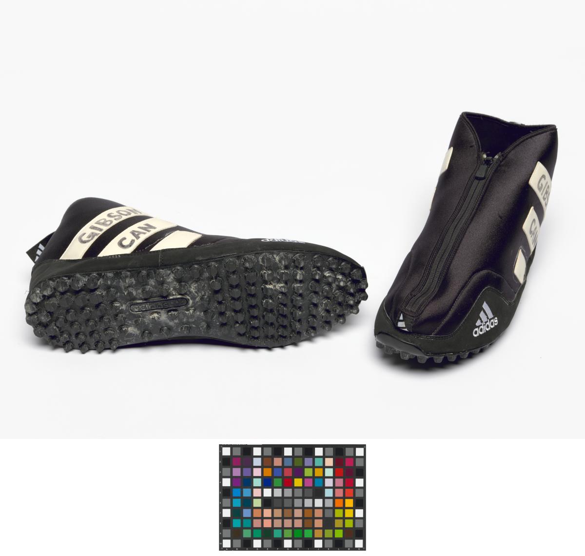 Black Adidas protection boots with zip. Dedication on both shoes: "GIBSON / CAN" and the athlete's signature on the right shoe.