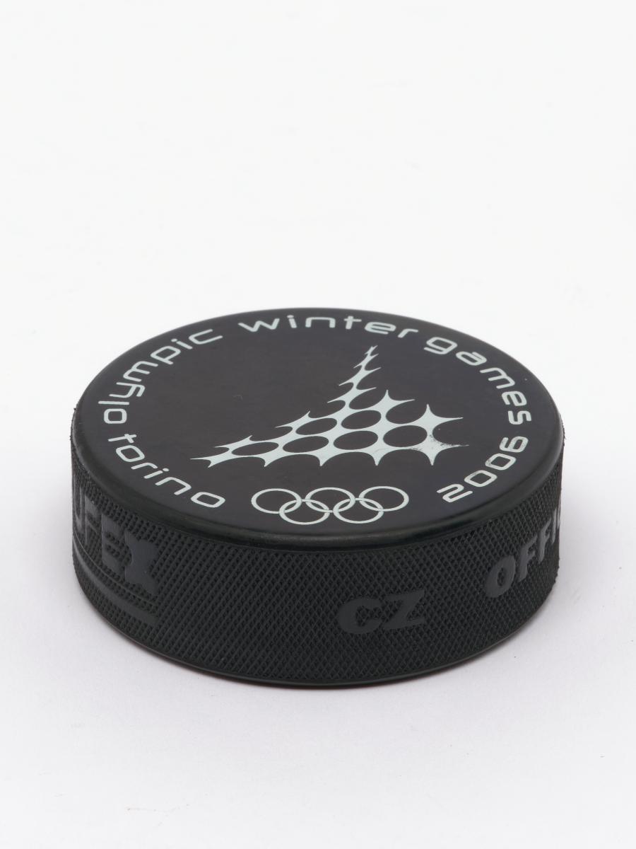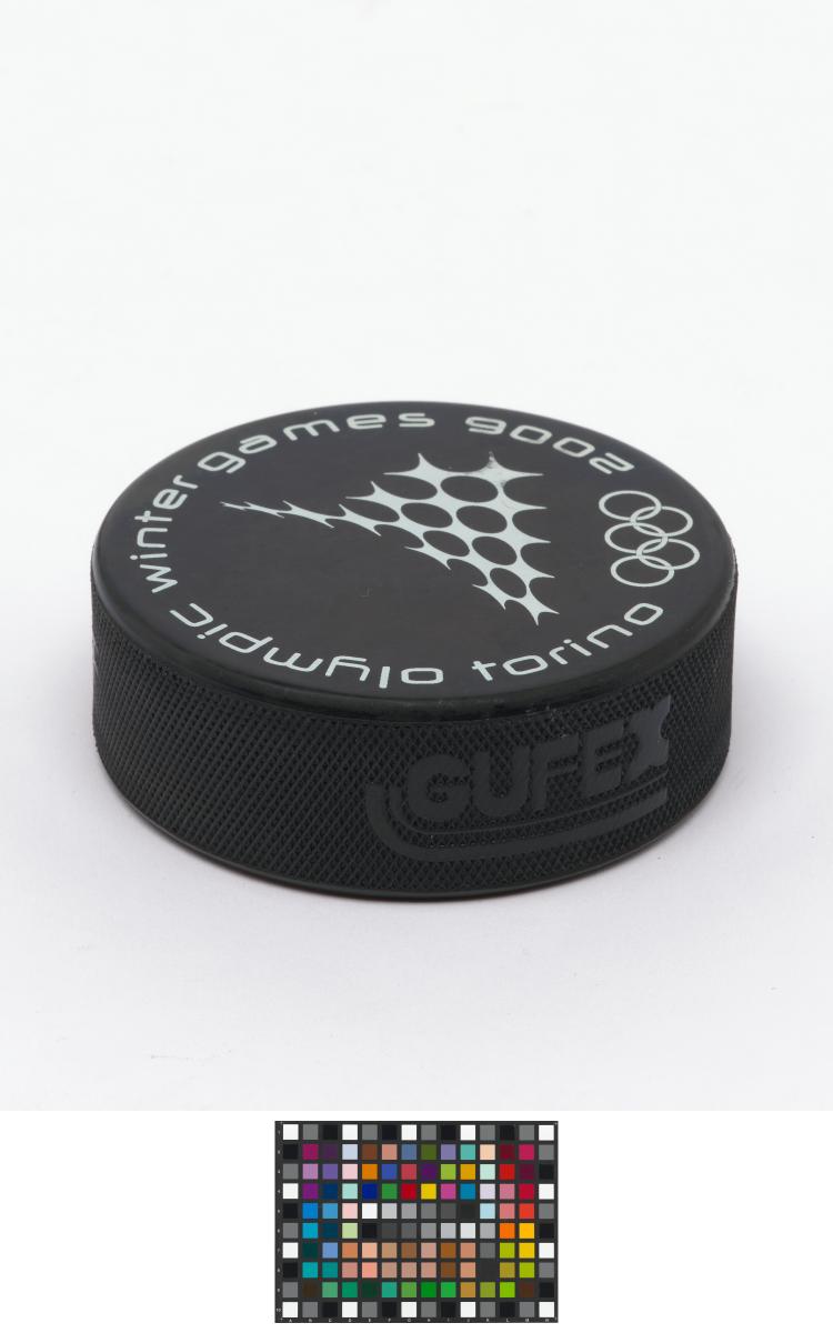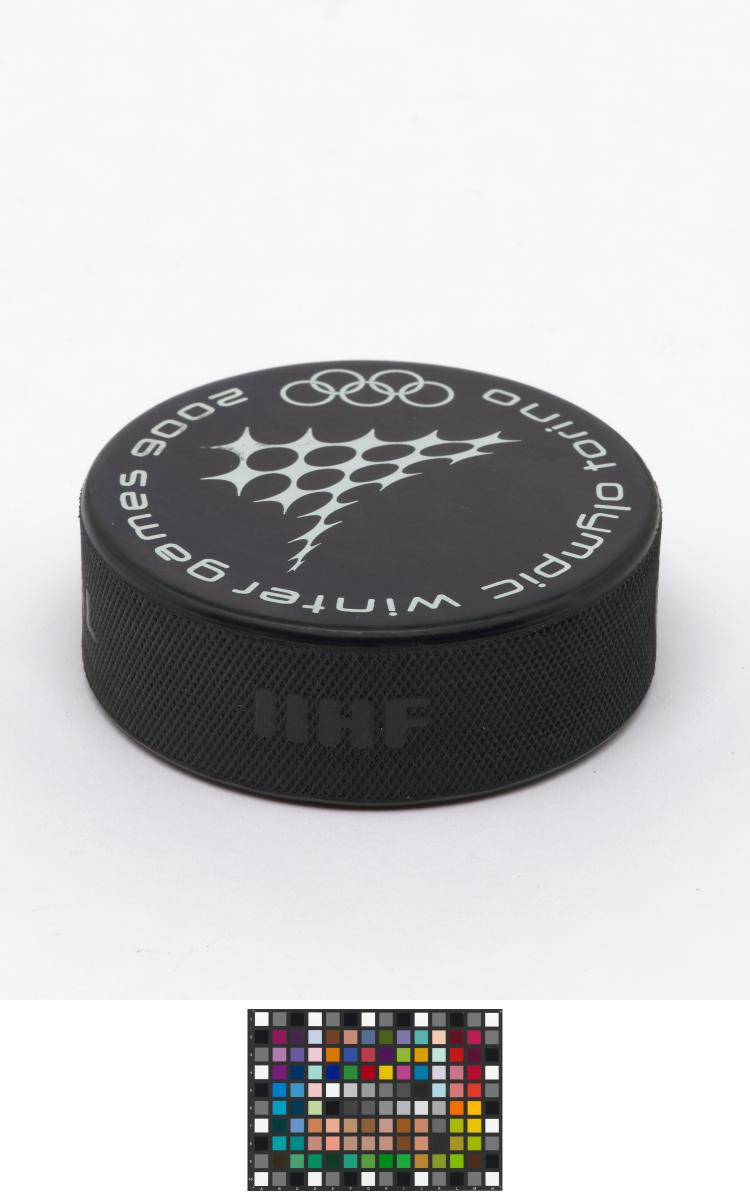 Torino 2006, ice hockey puck with the sport pictogram.