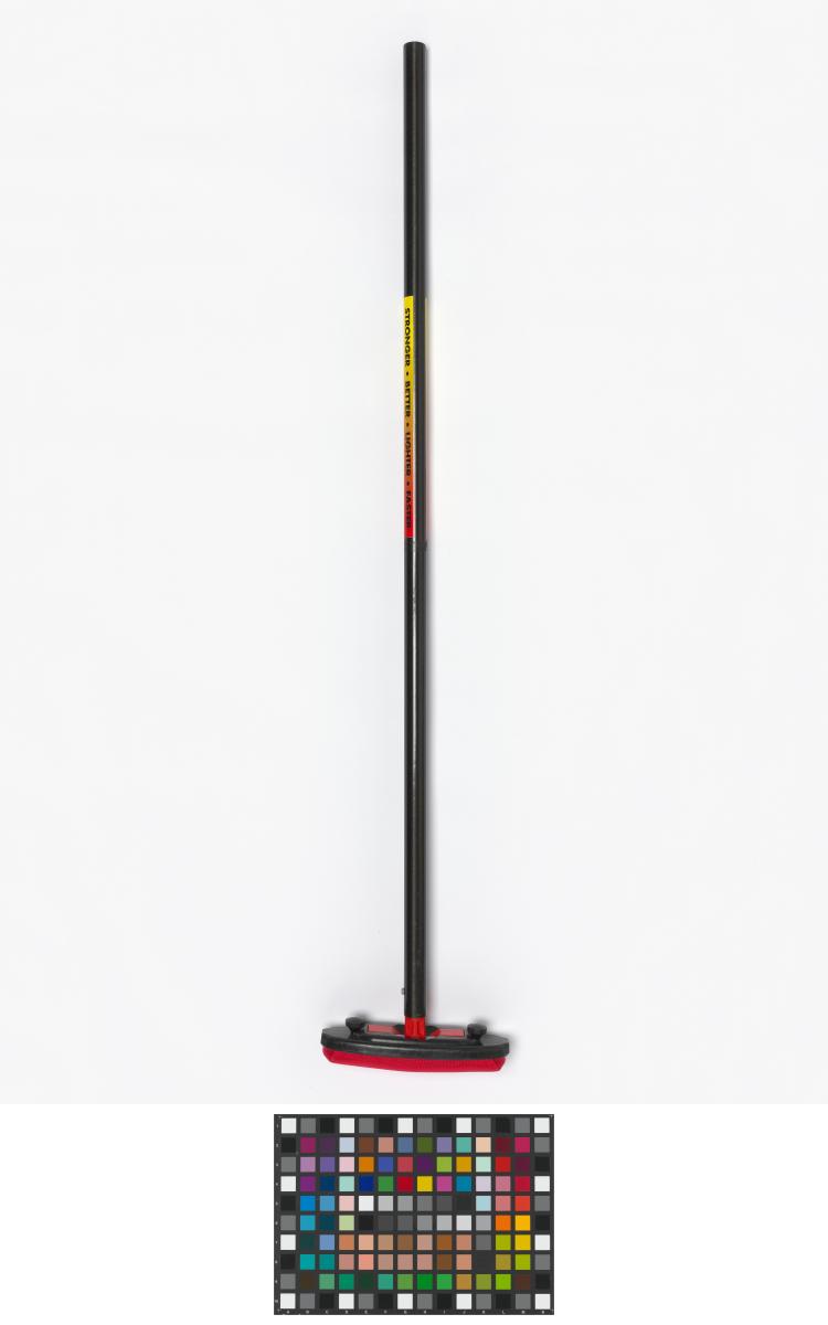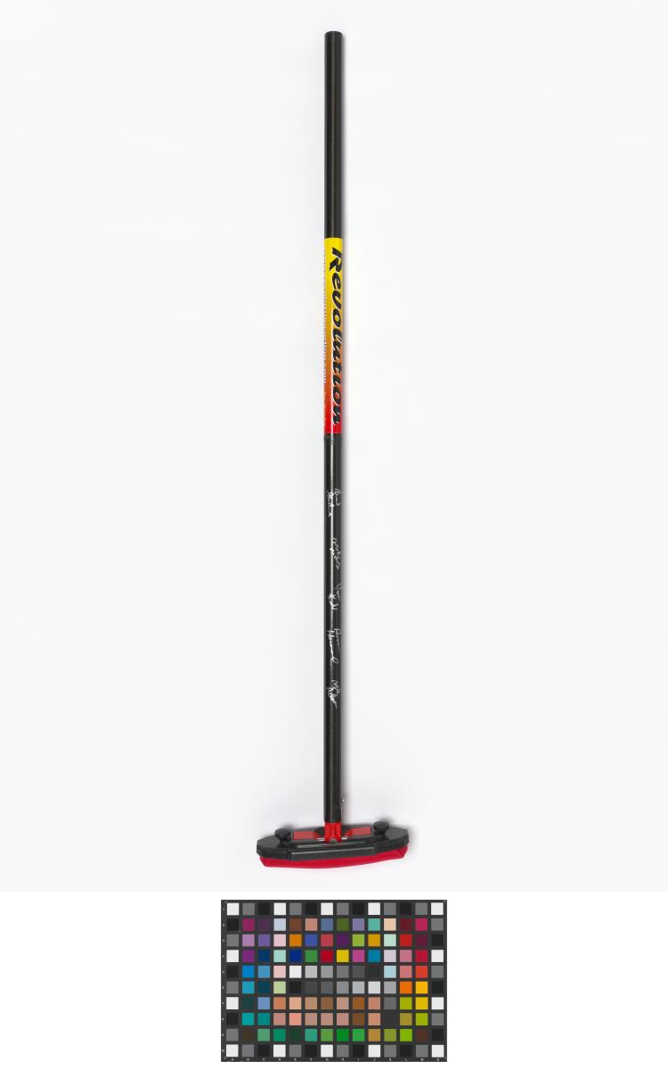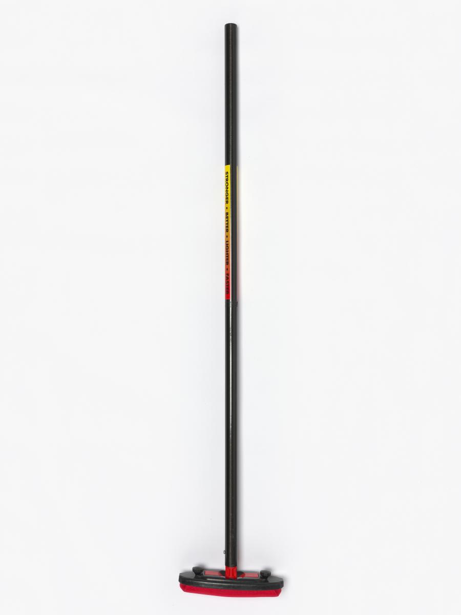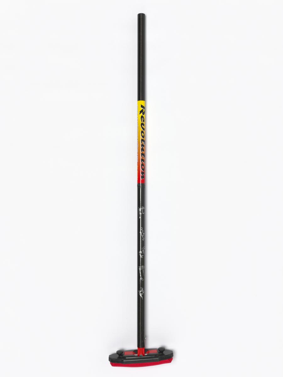 Red and black broom. Caption: "Stronger, Better, Lighter, Faster". Signed by the athletes.