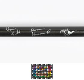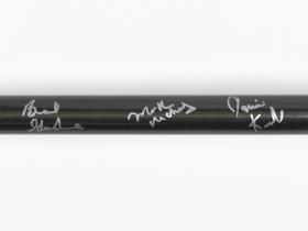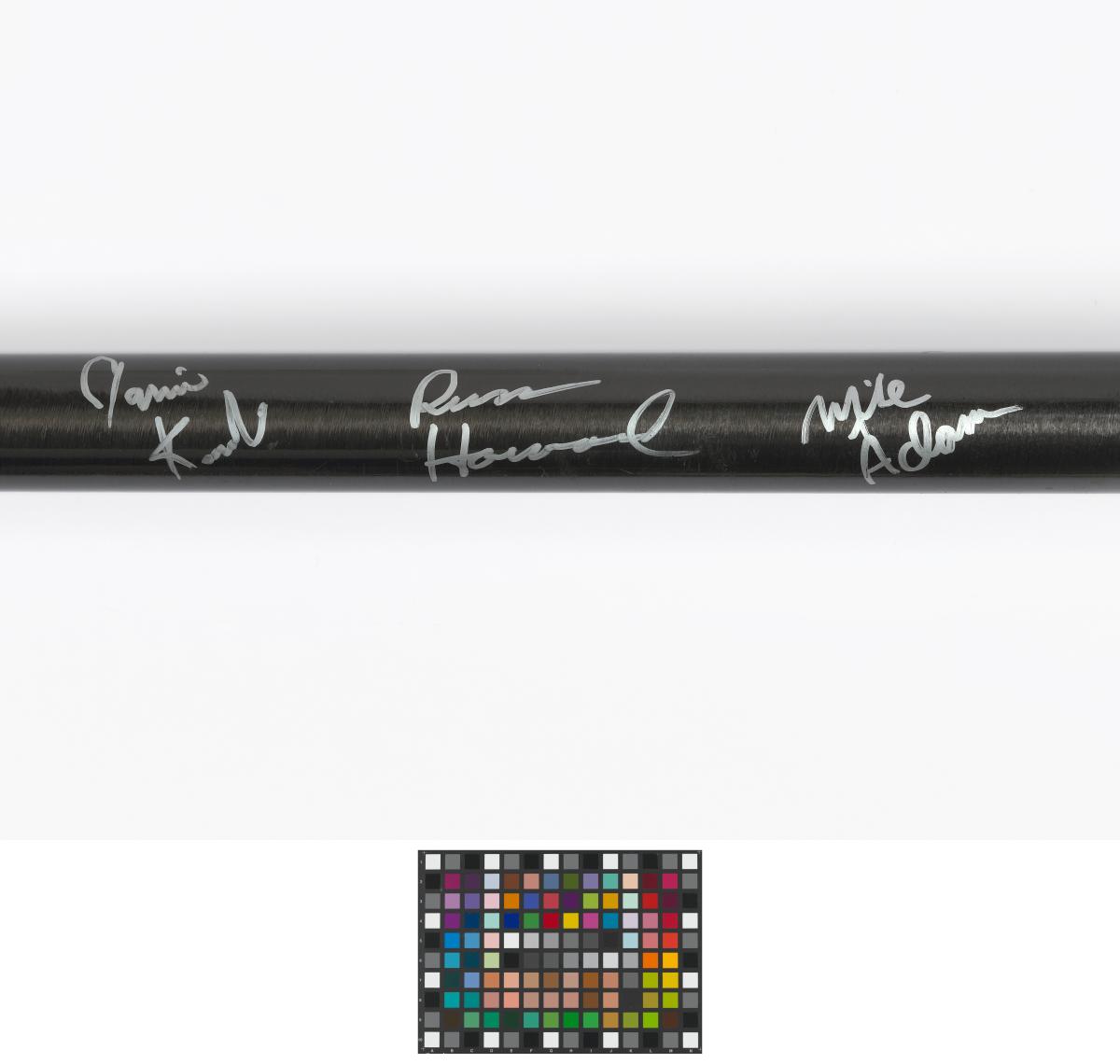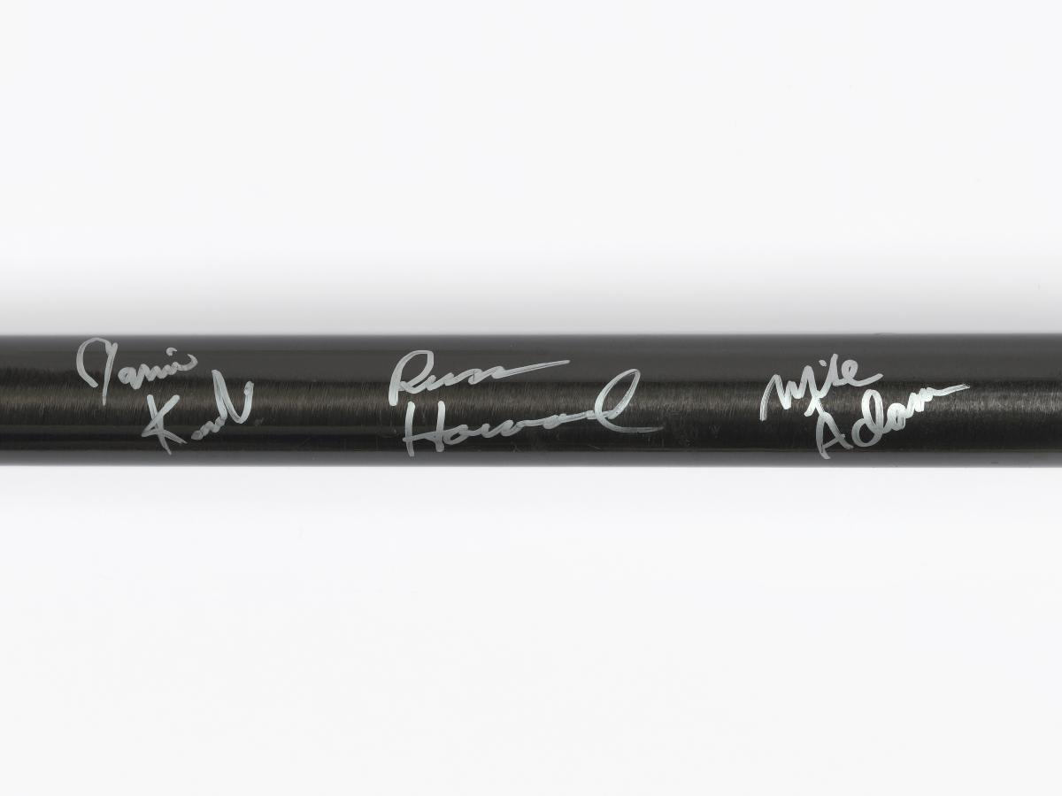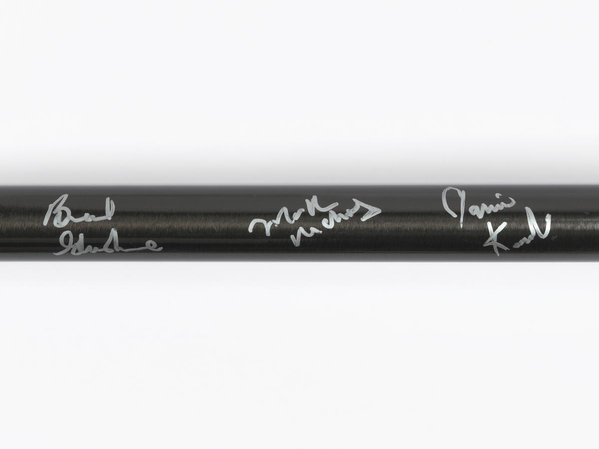 Red and black broom. Caption: "Stronger, Better, Lighter, Faster". Signed by the athletes.