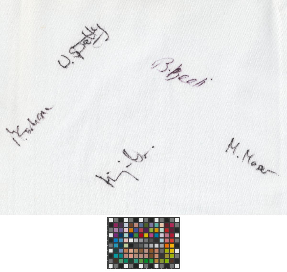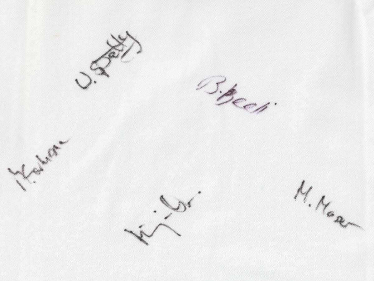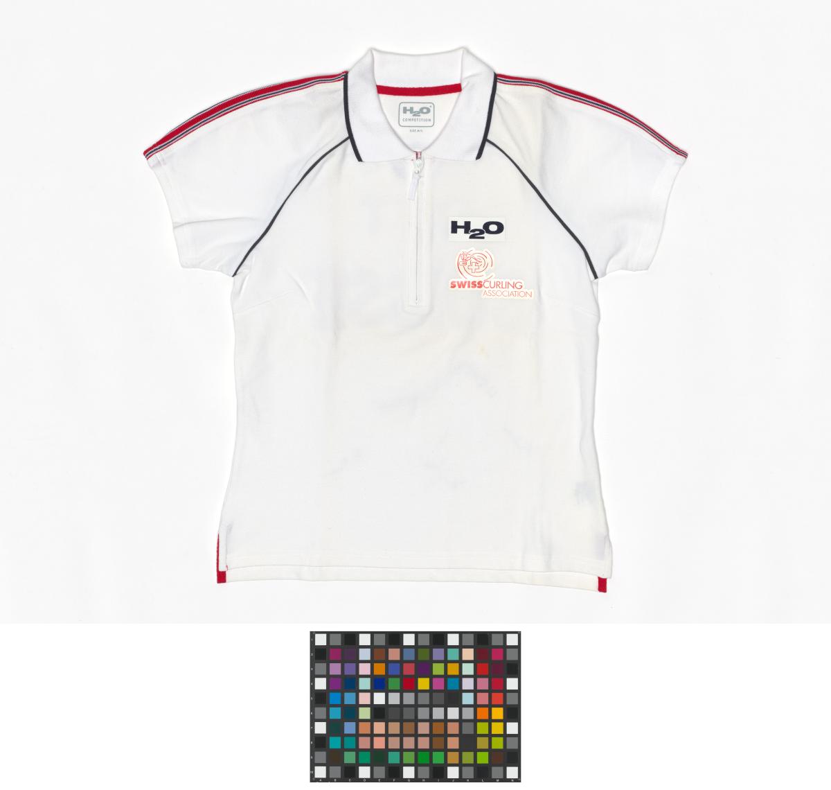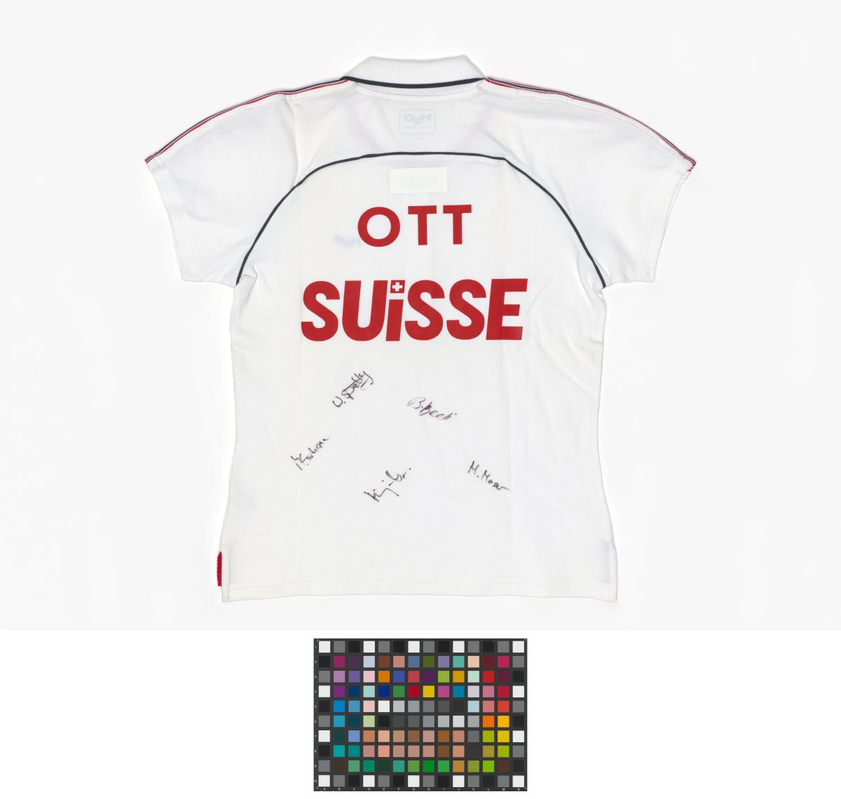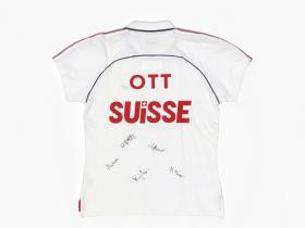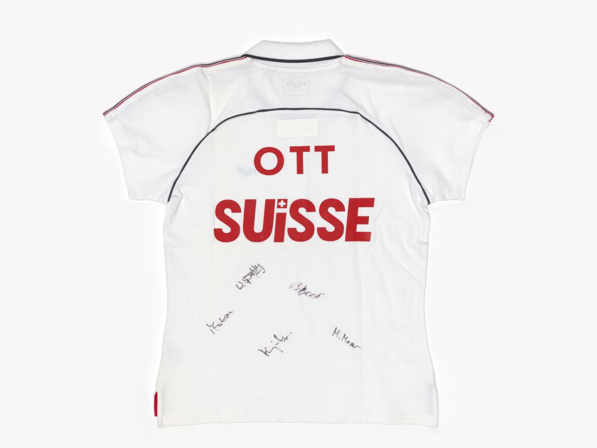 Short sleeves sweater. Emblem of the Swiss Curling Association on the chest. Name of the athlete and the country on the back, signatures by every member of the team. Size XL.