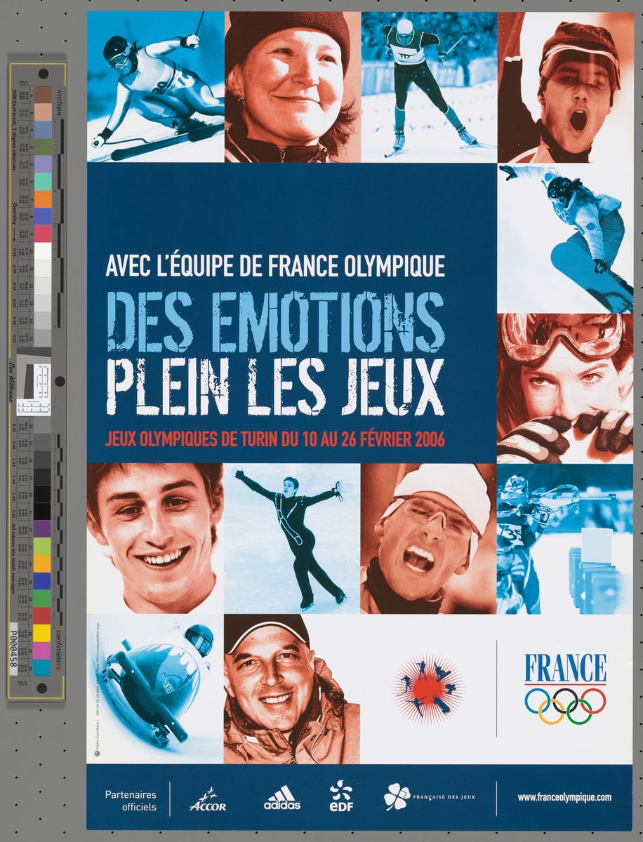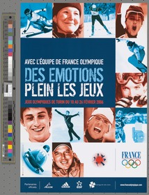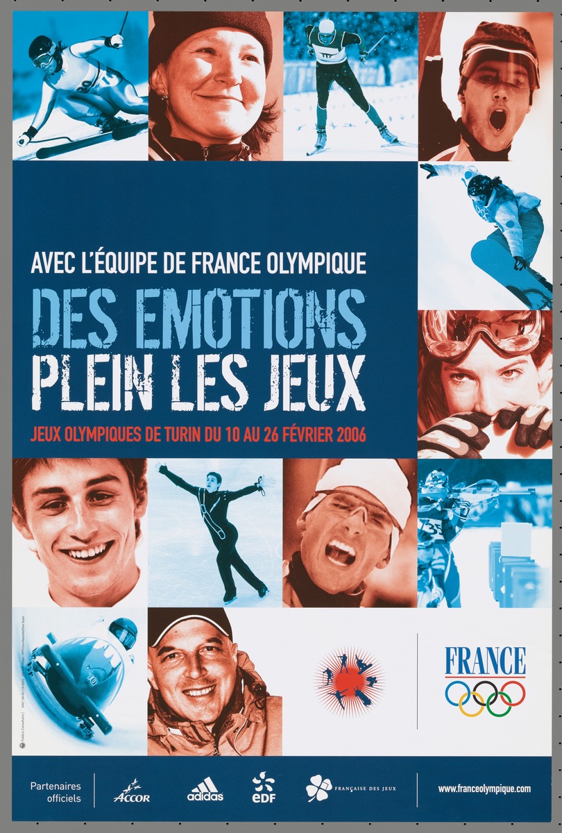 Photographs of athletes with the emblem of the French NOC. Caption: "Avec l'équipe de France olympique / Des émotions / plein les Jeux / Jeux de Turin du 10 au 26 février 2006". Logos partners of the team of France.