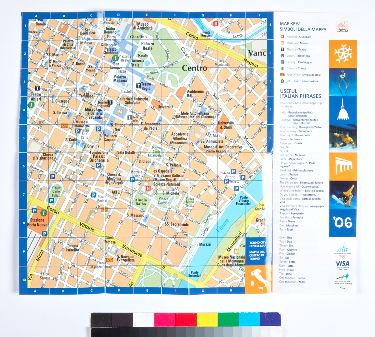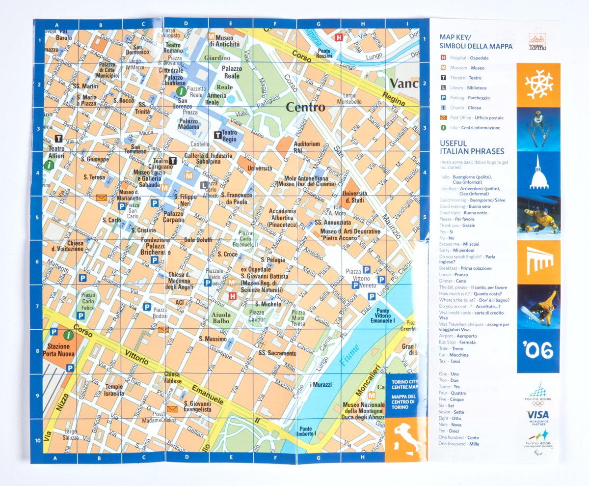 Map of the center of Torino, events calendar, Olympic and Paralympics Games emblem, and tourist information.