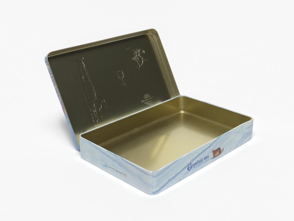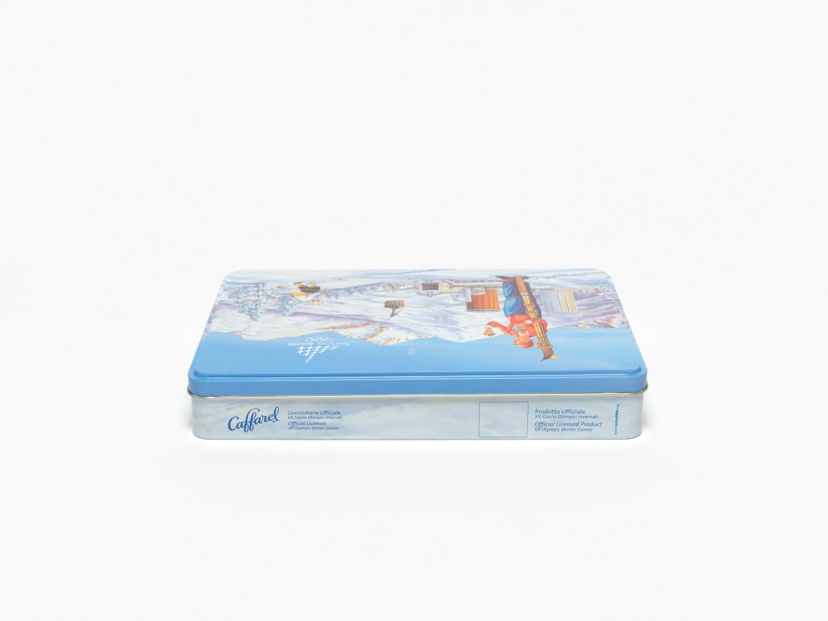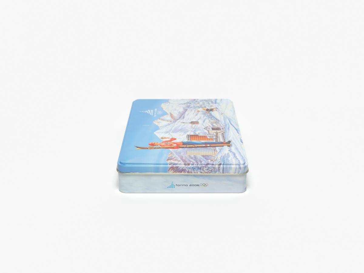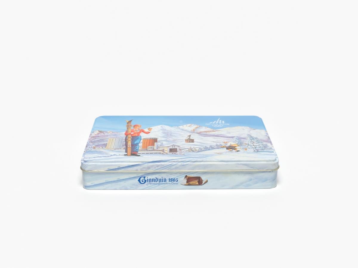 In the foreground of the box, picture of a skier lady with a piece of chocolate. In the background, mountain landscape, skier and cabin lift. At the top, games' Emblem. Caption: "Gianduia 1865 / L'autentico gianduiotto di Torino".