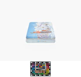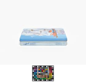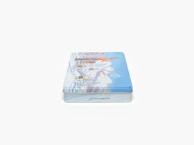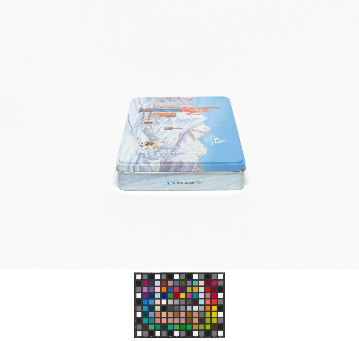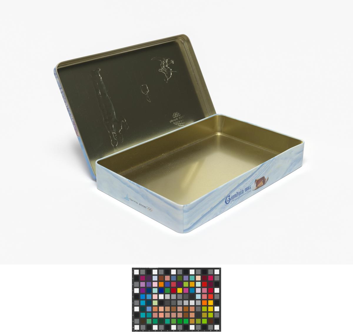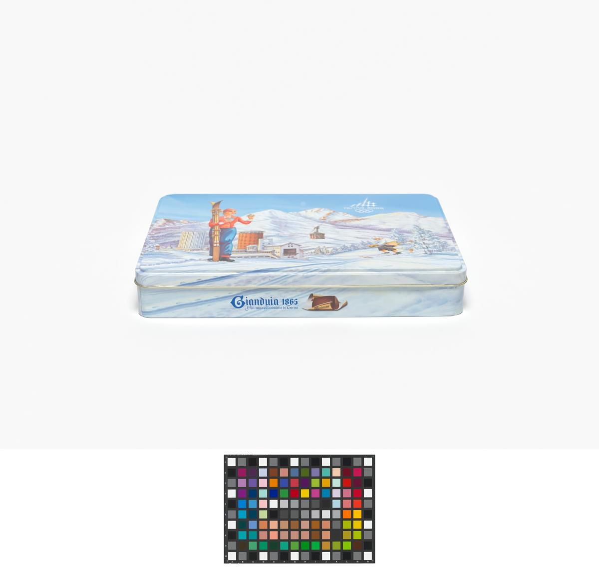 In the foreground of the box, picture of a skier lady with a piece of chocolate. In the background, mountain landscape, skier and cabin lift. At the top, games' Emblem. Caption: "Gianduia 1865 / L'autentico gianduiotto di Torino".