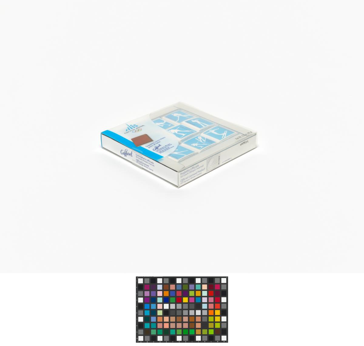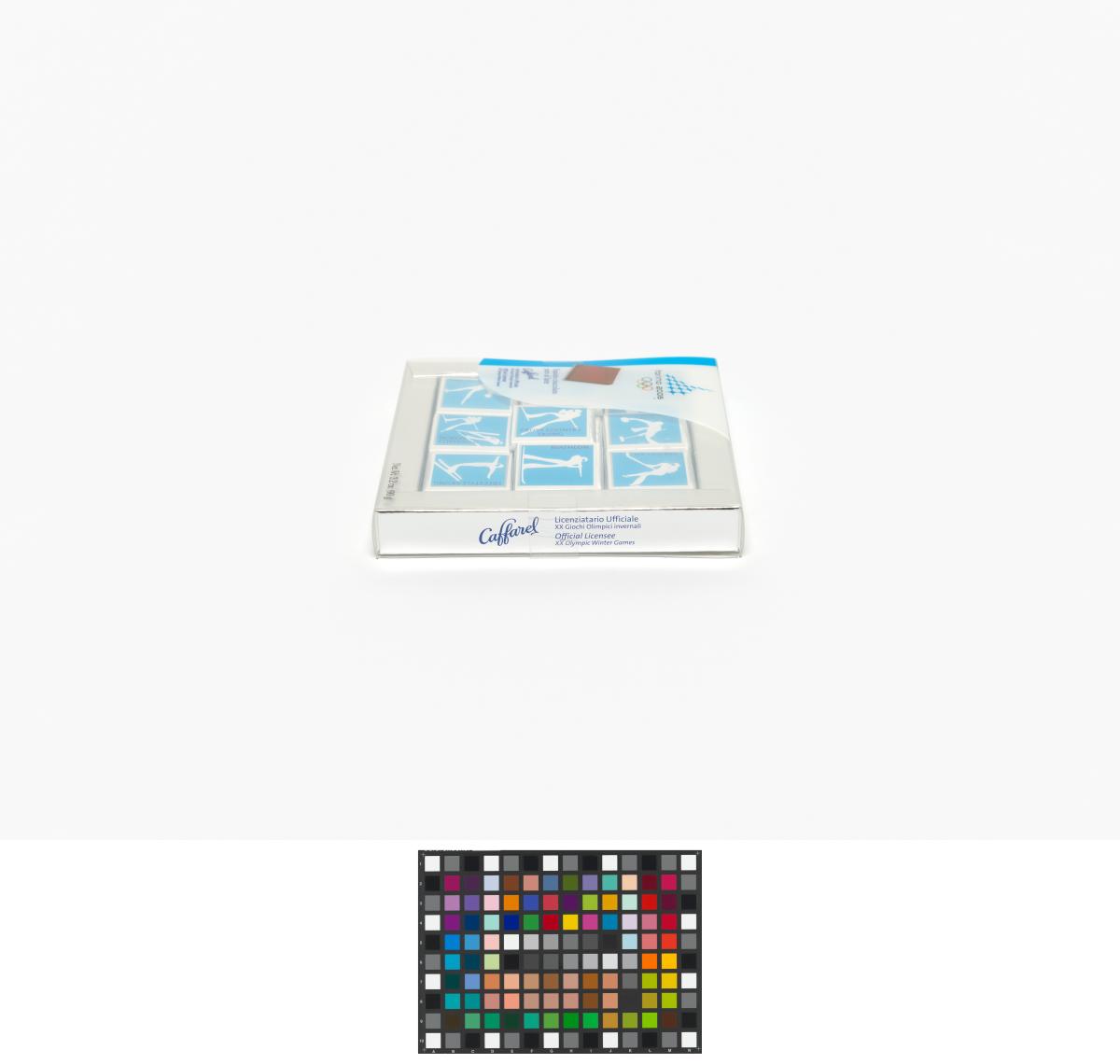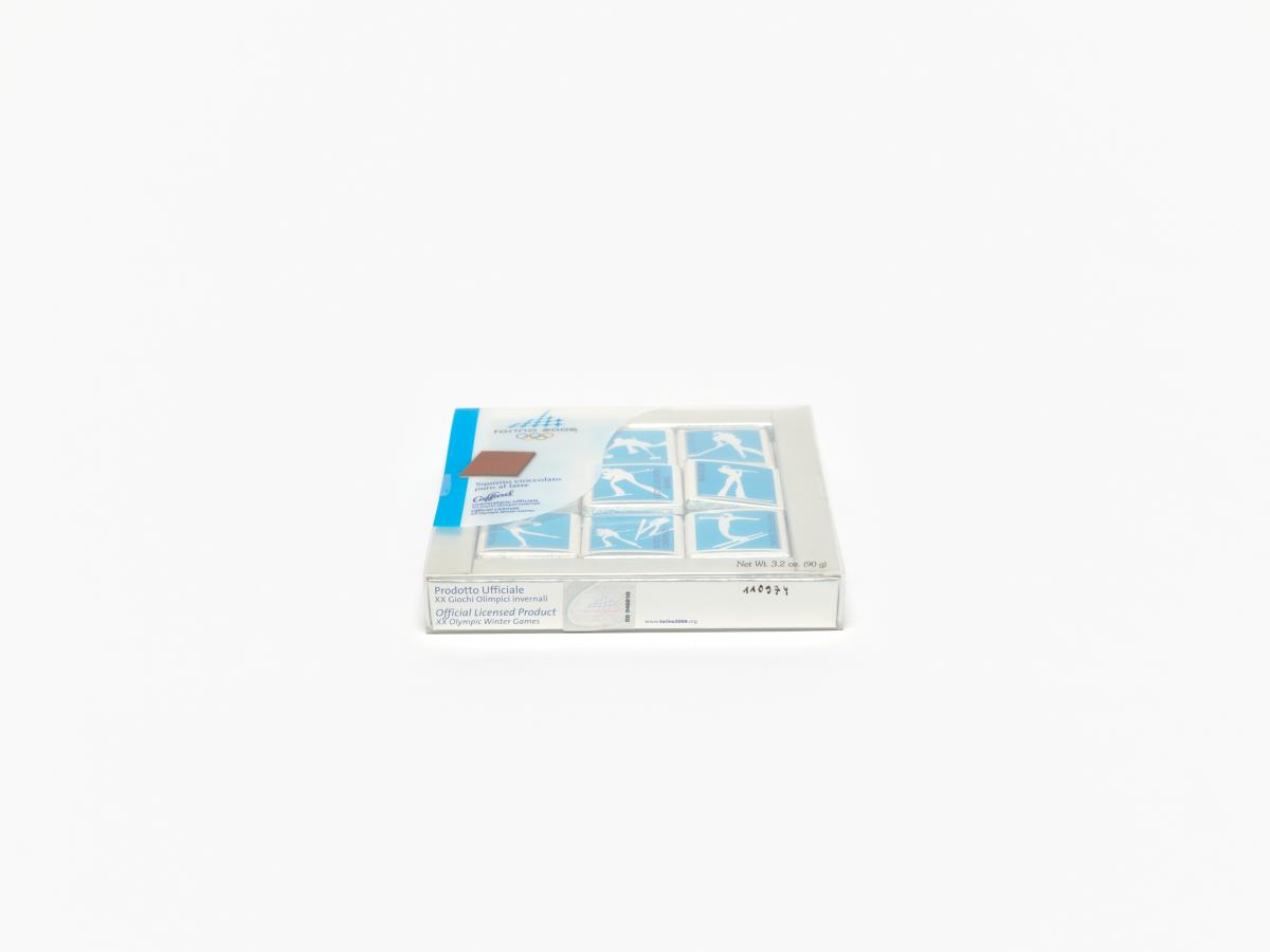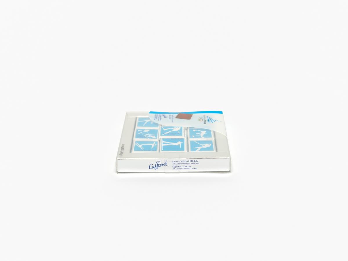 In a squared box, little chocolates with the sports pictograms in white on blue bottom. Games Emblem and caption: "Squisito cioccolato / puro al latte".