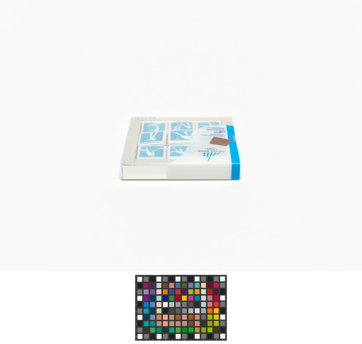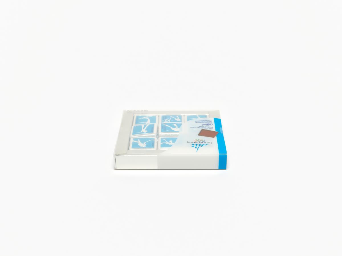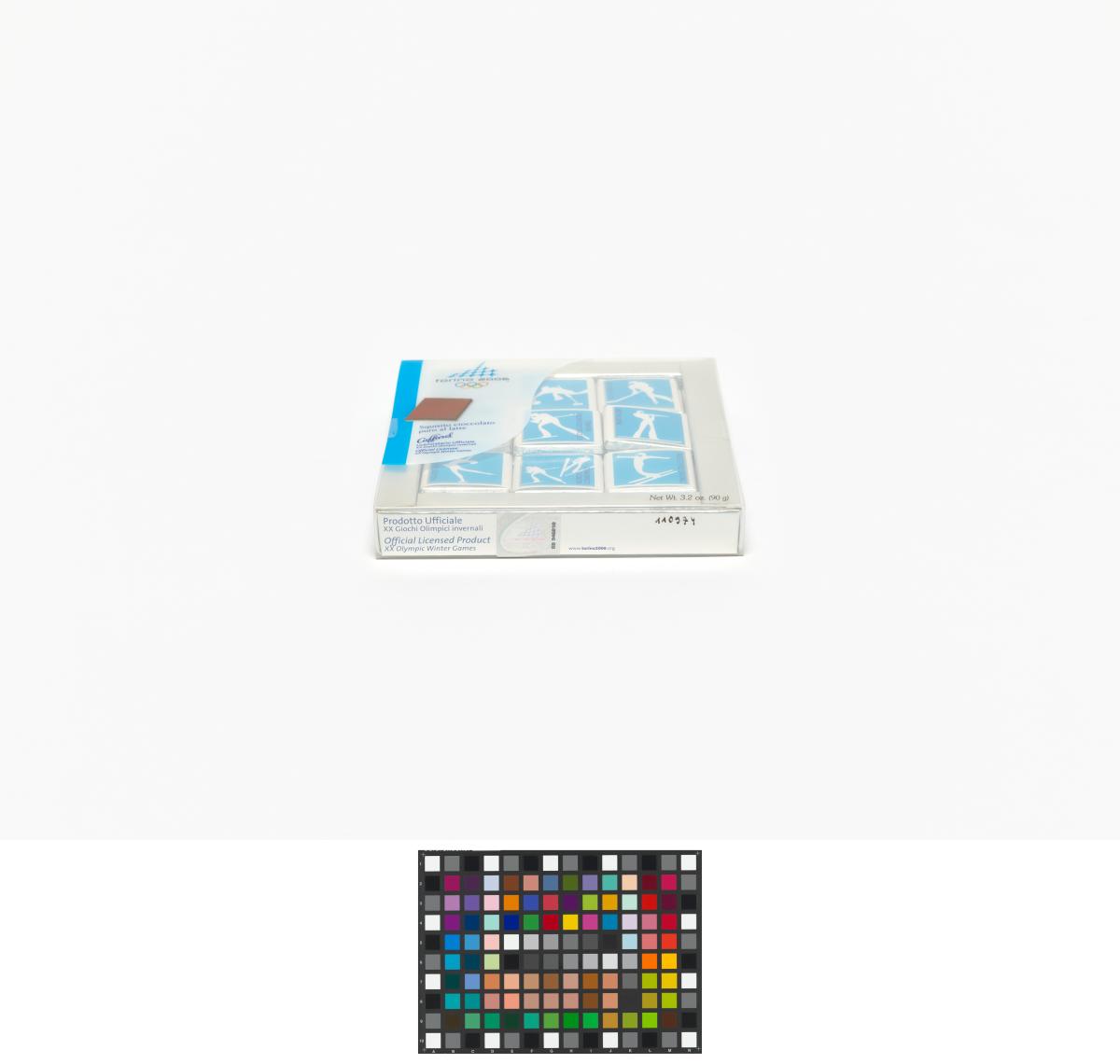 In a squared box, little chocolates with the sports pictograms in white on blue bottom. Games Emblem and caption: "Squisito cioccolato / puro al latte".