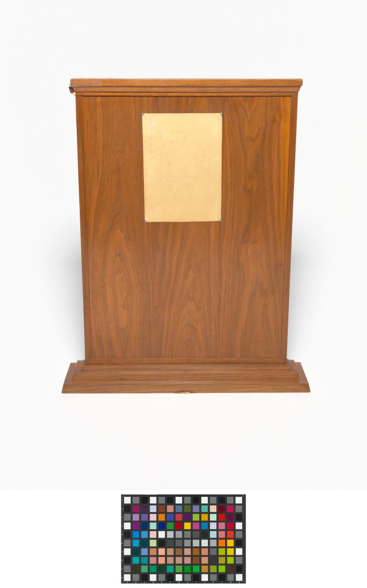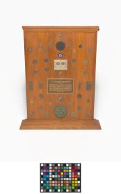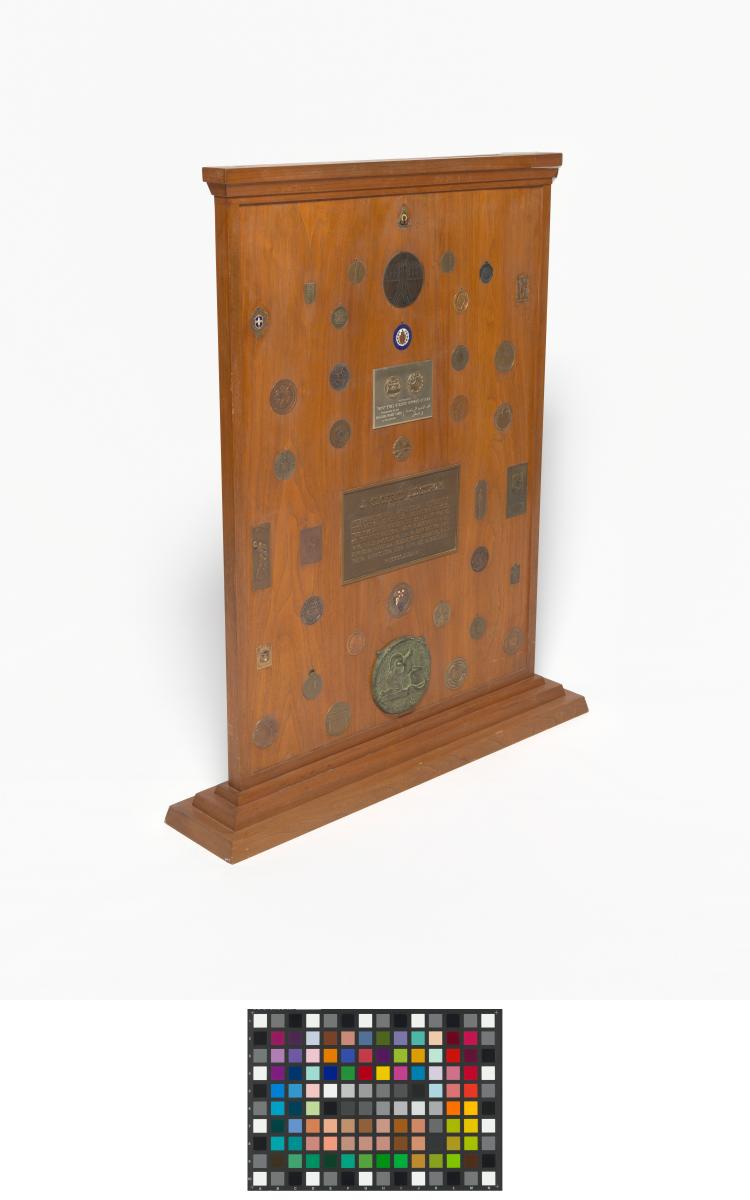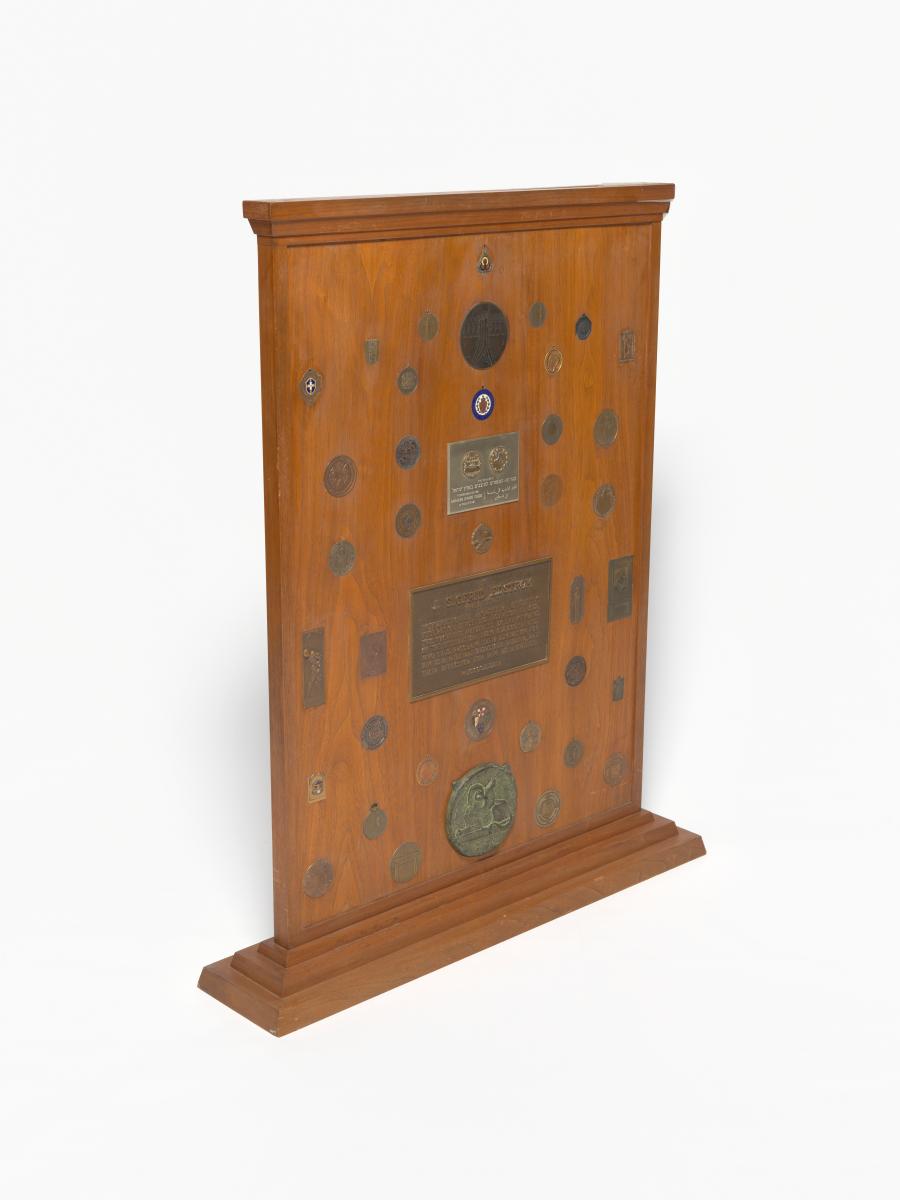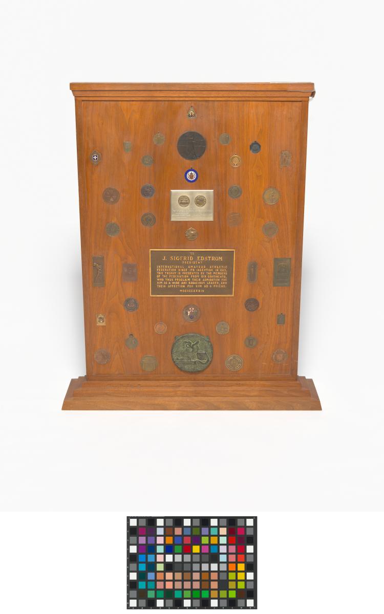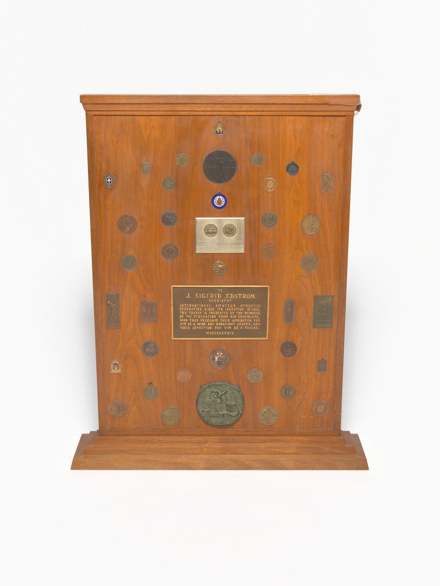 Wooden plaque on a piedestal with 39 medals and a bronze plaque with the caption: "TO / J. SIGFRID EDSTRÖM / PRESIDENT / INTERNATIONAL AMATEUR ATHLETIC / FEDERATION SINCE ITS INCEPTION IN 1912, / THIS TROPHY IS PRESENTED BY THE MEMBERS / OF THE FEDERATION FROM SIX CONTINENTS, / WHO THUS PROCLAIM THEIR ADMIRATION FOR / HIM AS A WISE AND SAGACIOUS LEADER, AND / THEIR AFFECTION FOR HIM AS A FRIEND. / MDCCCCXXXIV".