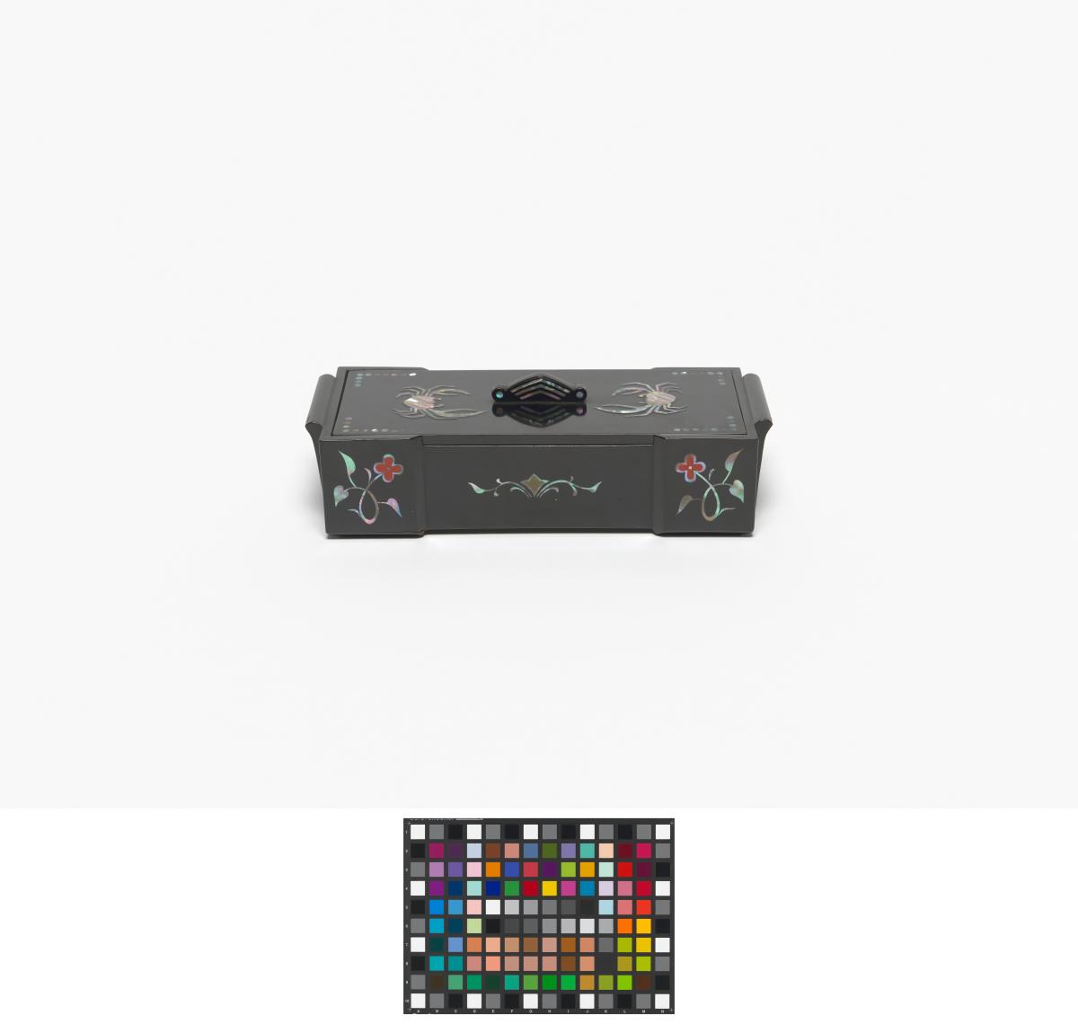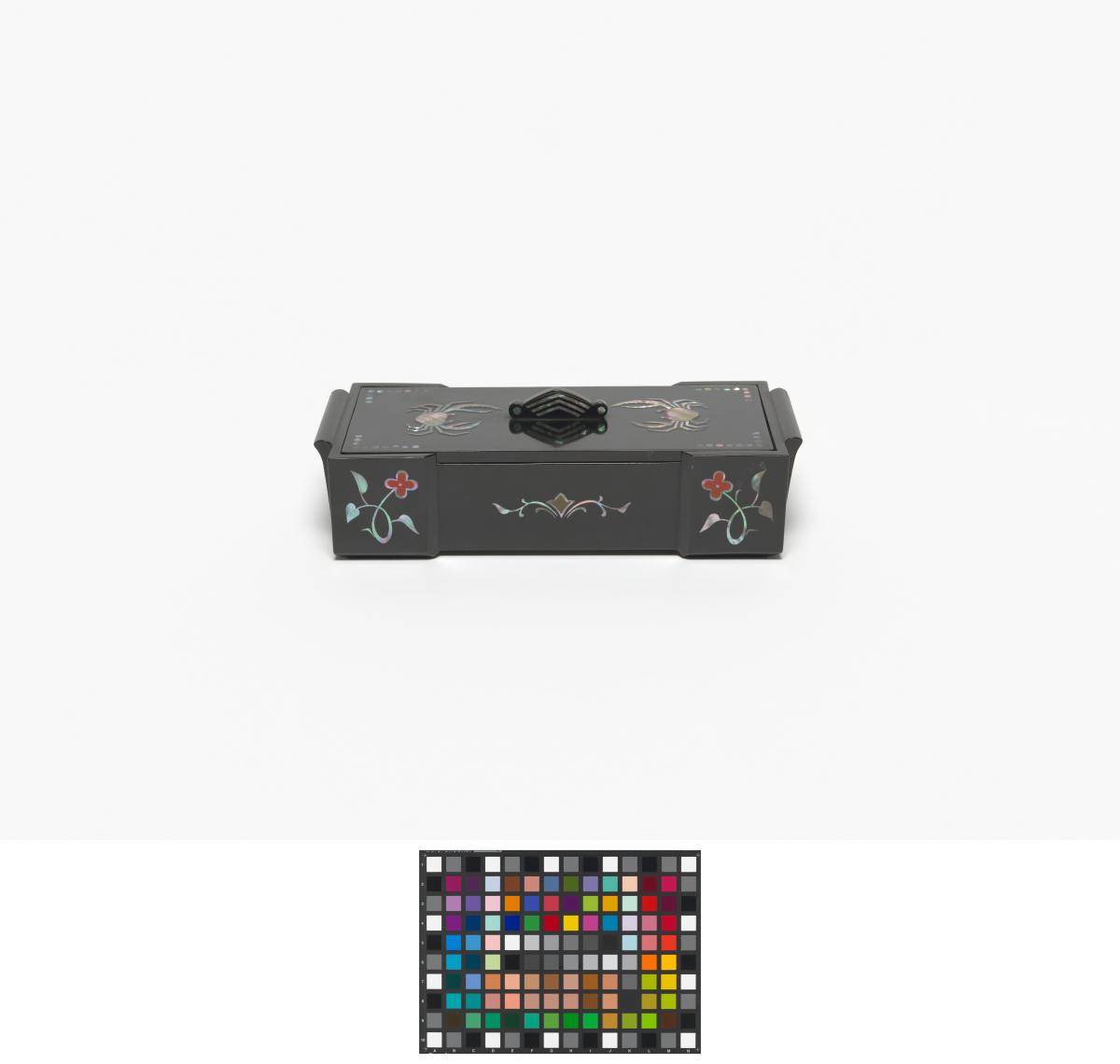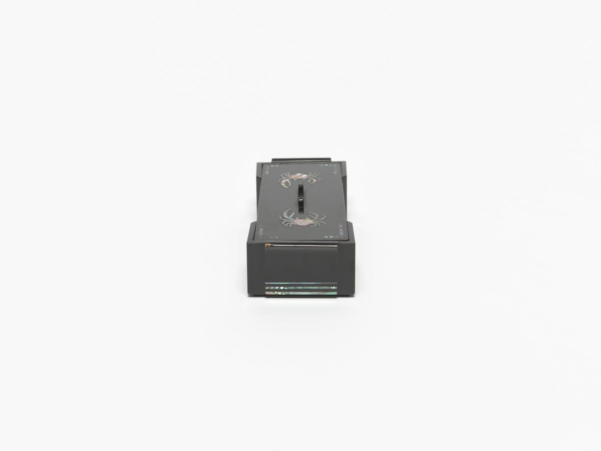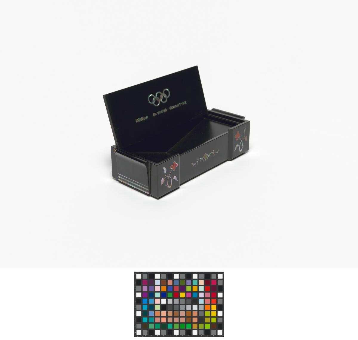 Box in black lacquer with mother-of-pearl inlays representing crabs and floral motives. Olympic Symbol and caption: "KOREAN OLYMPIC COMMITTEE" on the back of the cover.