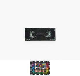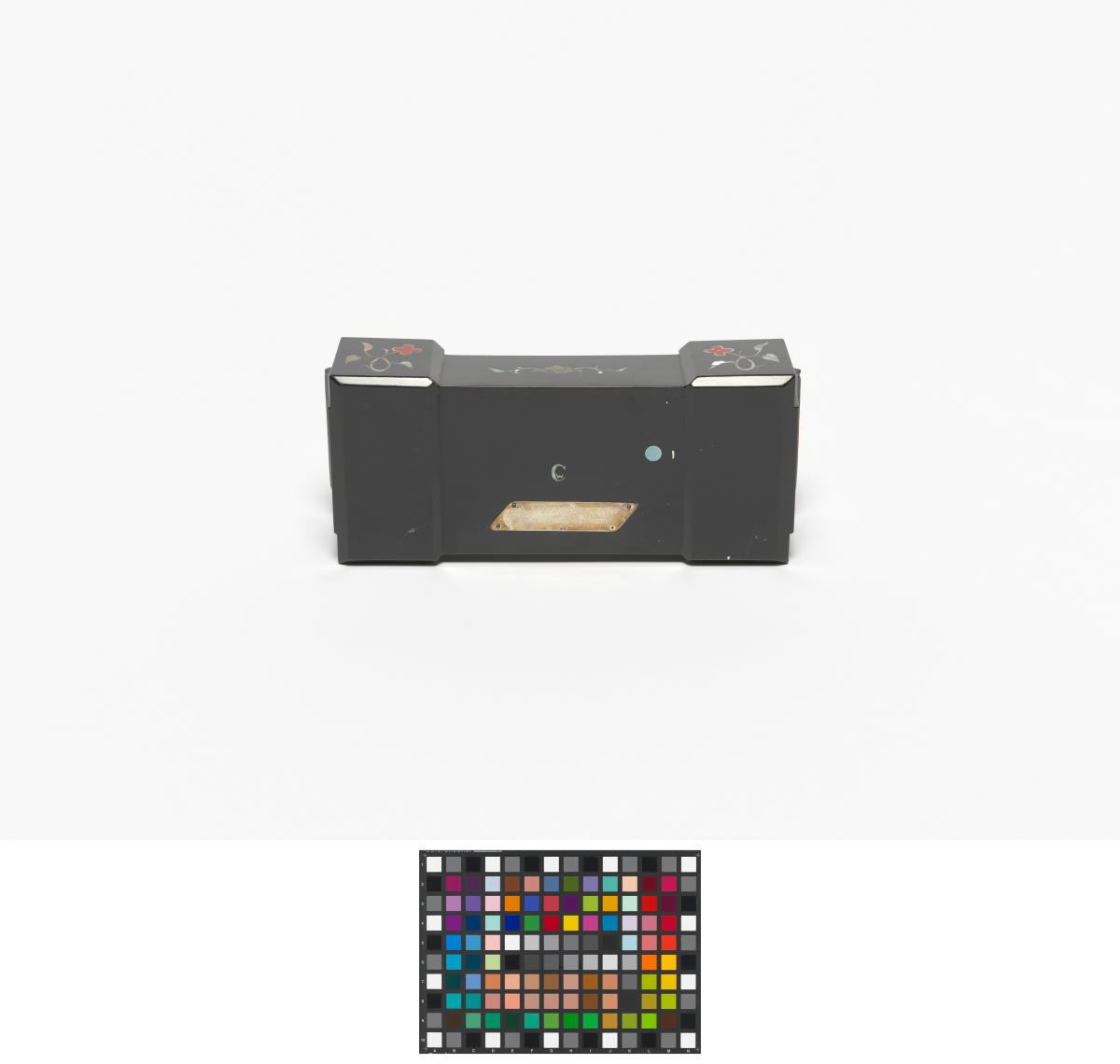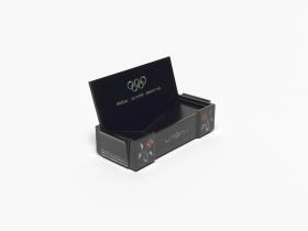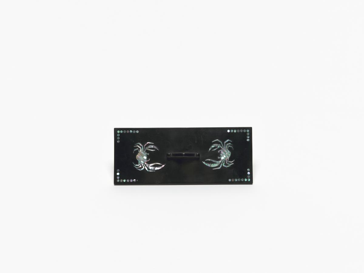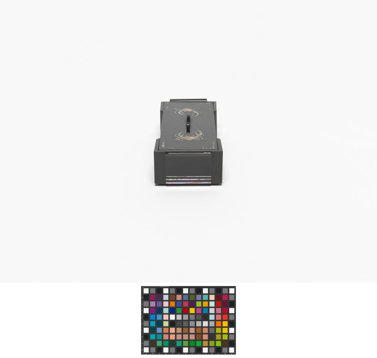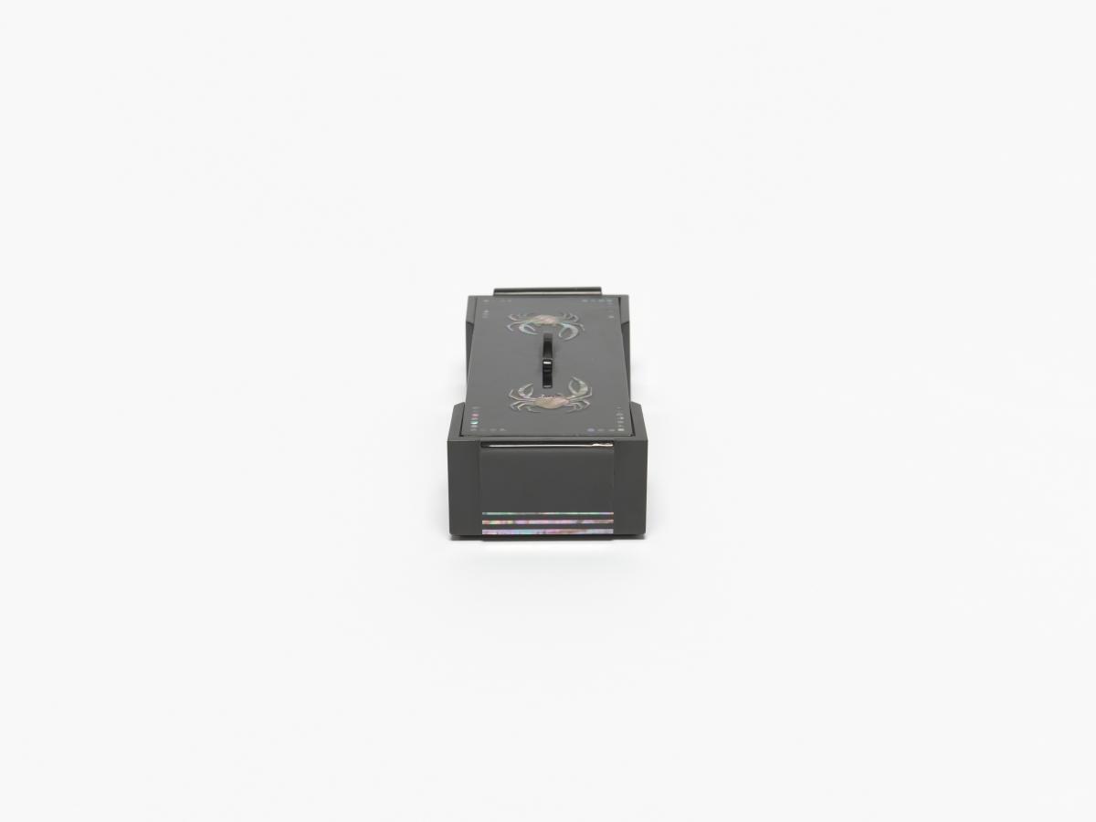 Box in black lacquer with mother-of-pearl inlays representing crabs and floral motives. Olympic Symbol and caption: "KOREAN OLYMPIC COMMITTEE" on the back of the cover.