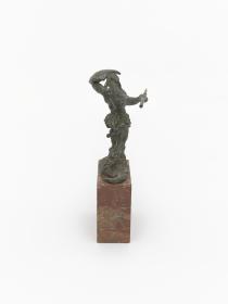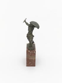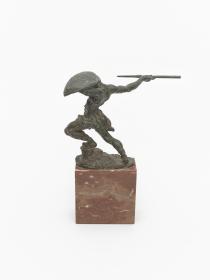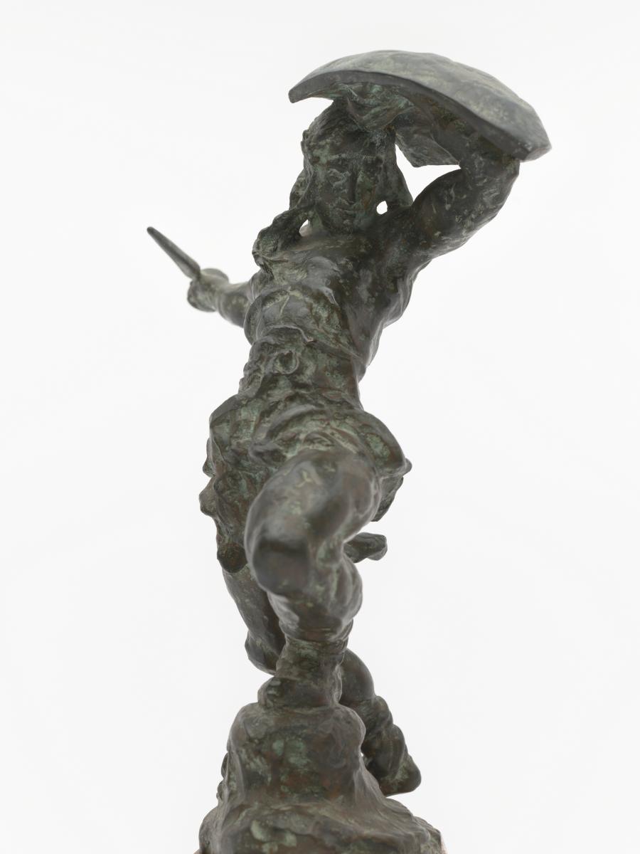 Naked athlete throwing a spear and protecting himself with a shield. Bronze on marble piedestal. Signed J. Novók or Novak (?).