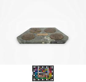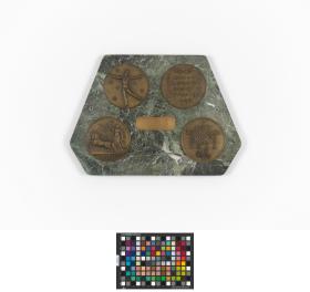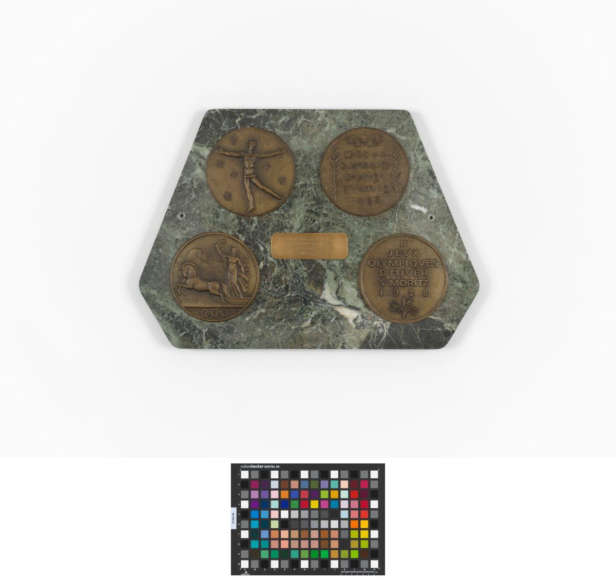 Green marble plate with bronze reproduction of the winner's and the participation medal. In the middle, plate with caption: "Le COS au CIO en souvenir des IIèmes Jeux Olympiques d'Hiver, St Moritz 1928".