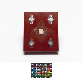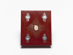 Box in red lacquer with mother-of-pearl inlays representing roses. In the middle, emblem of the North Korea National Olympic Committee with an athlet running in the center of the star of the emblem.