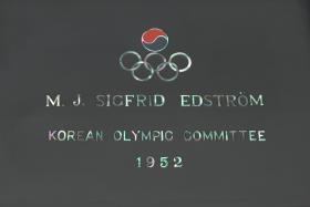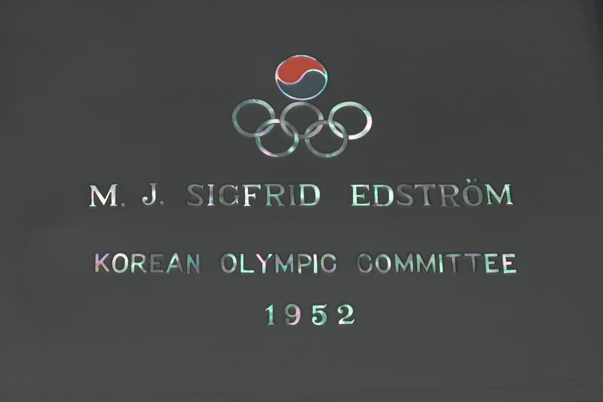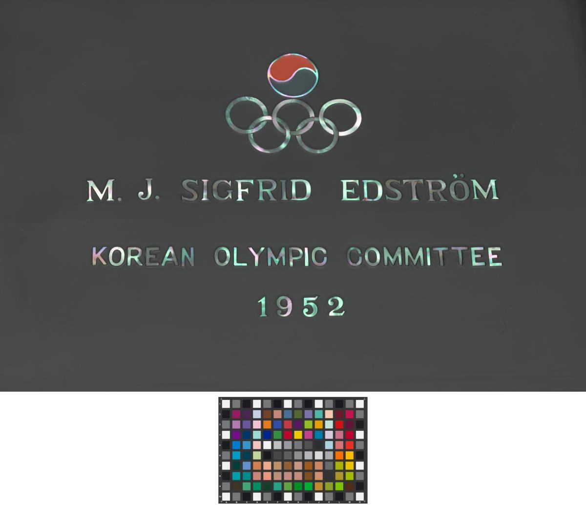 Box in red lacquer with mother-of-pearl inlays representing a bird and floral motives. Emblem of the Korean National Olympic Committee and caption: "M. J. SIGFRID EDSTRÖM / KOREAN OLYMPIC COMMITTEE / 1952" on the back of the cover.