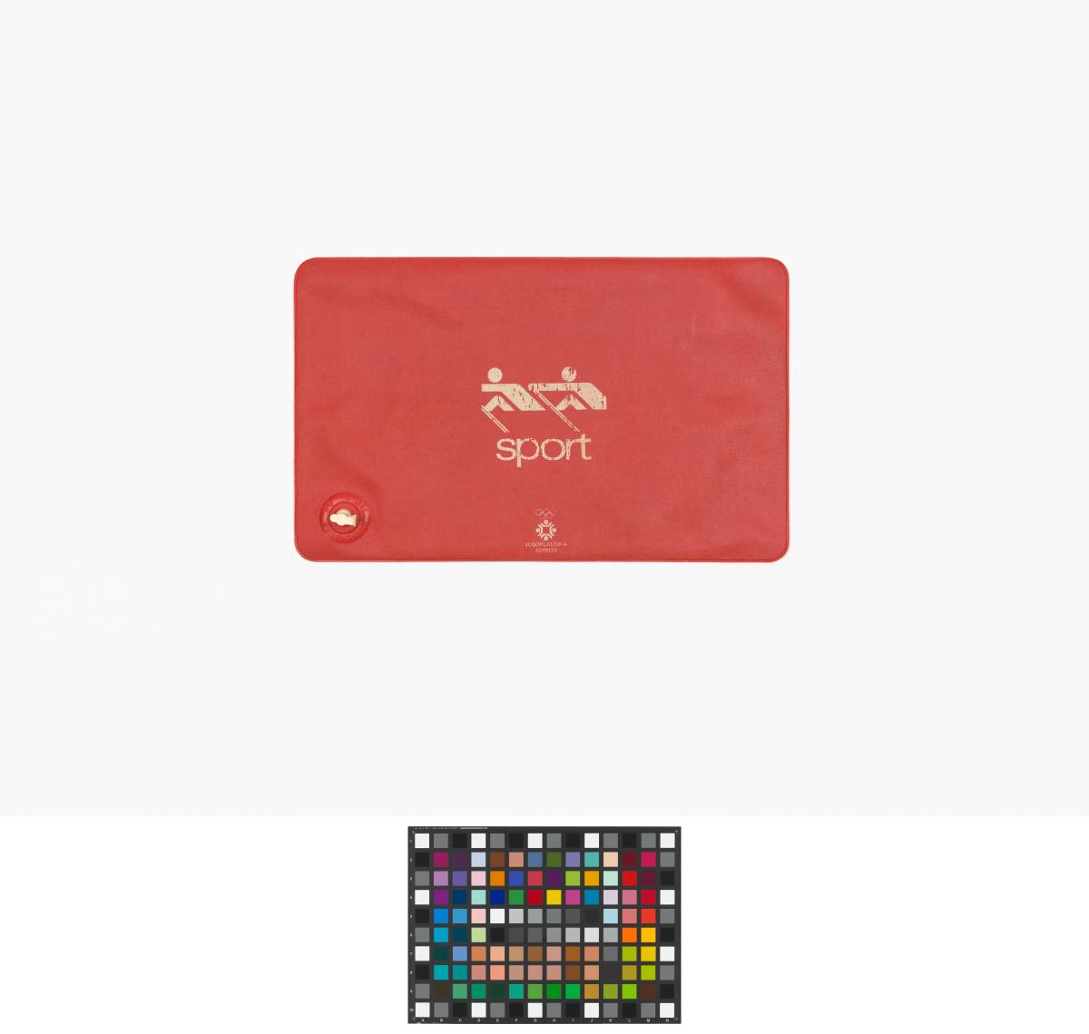 Red flat cushion with the Games' Emblem and a rowing pictogram.Caption: "Sport".