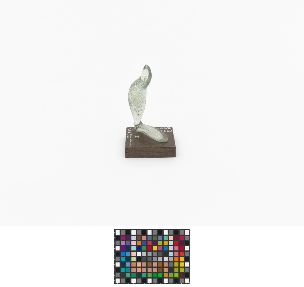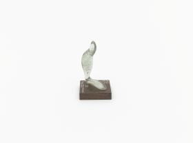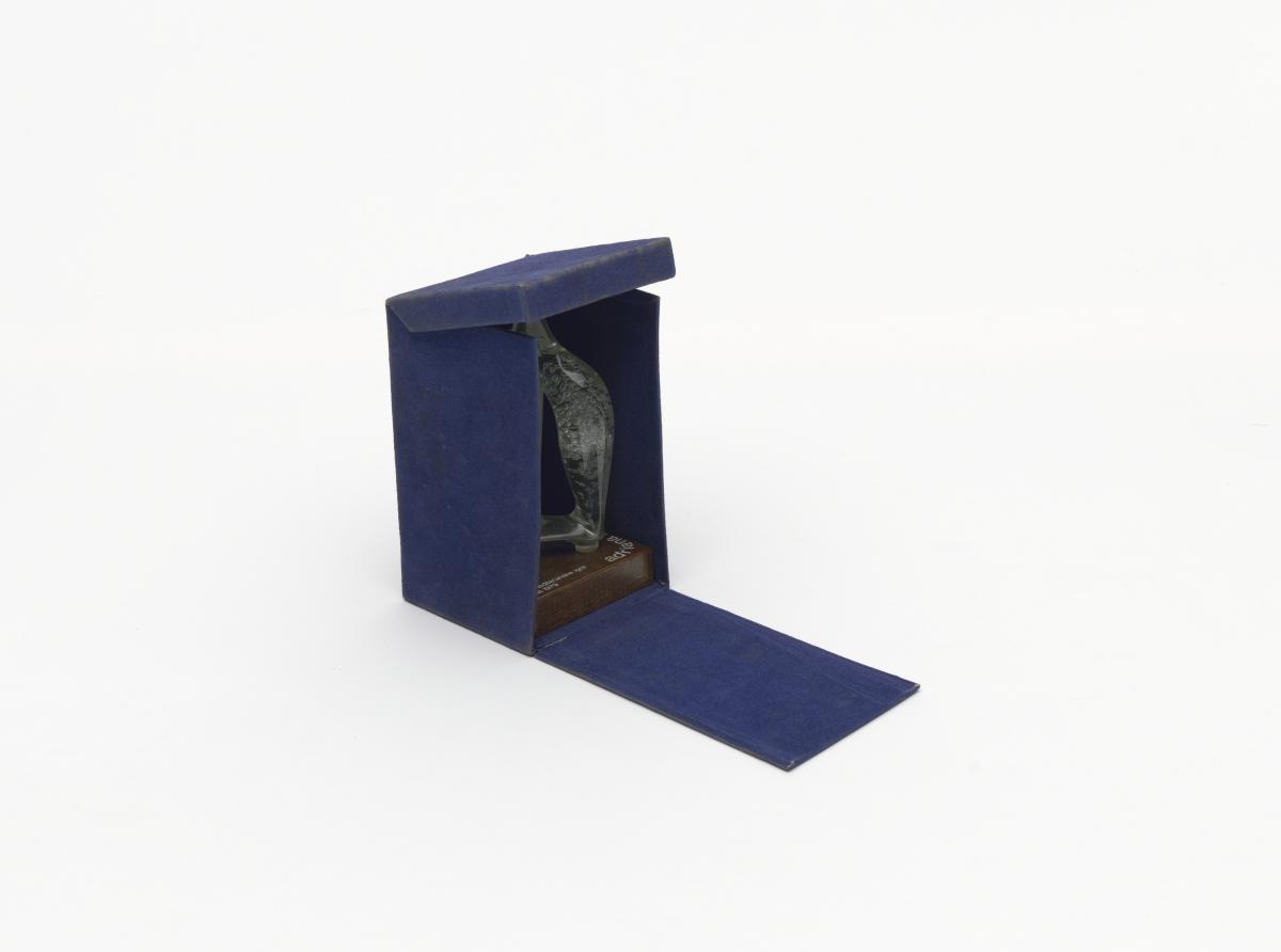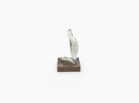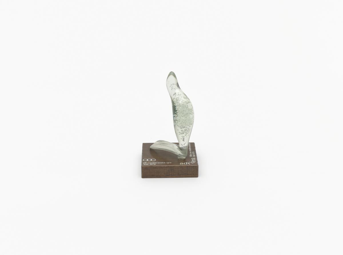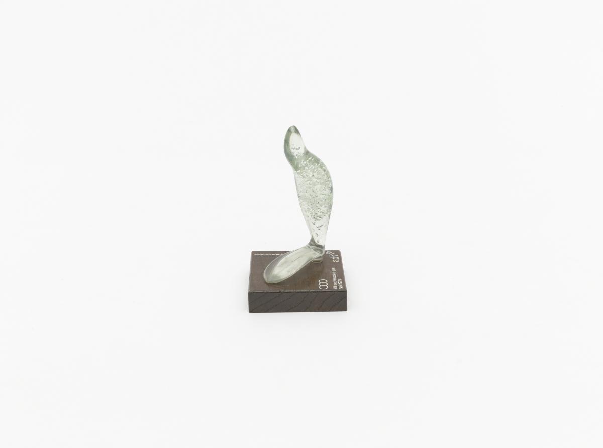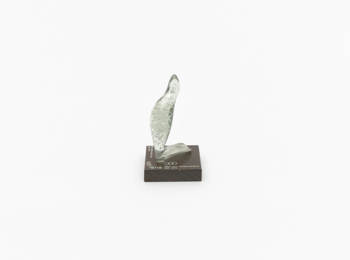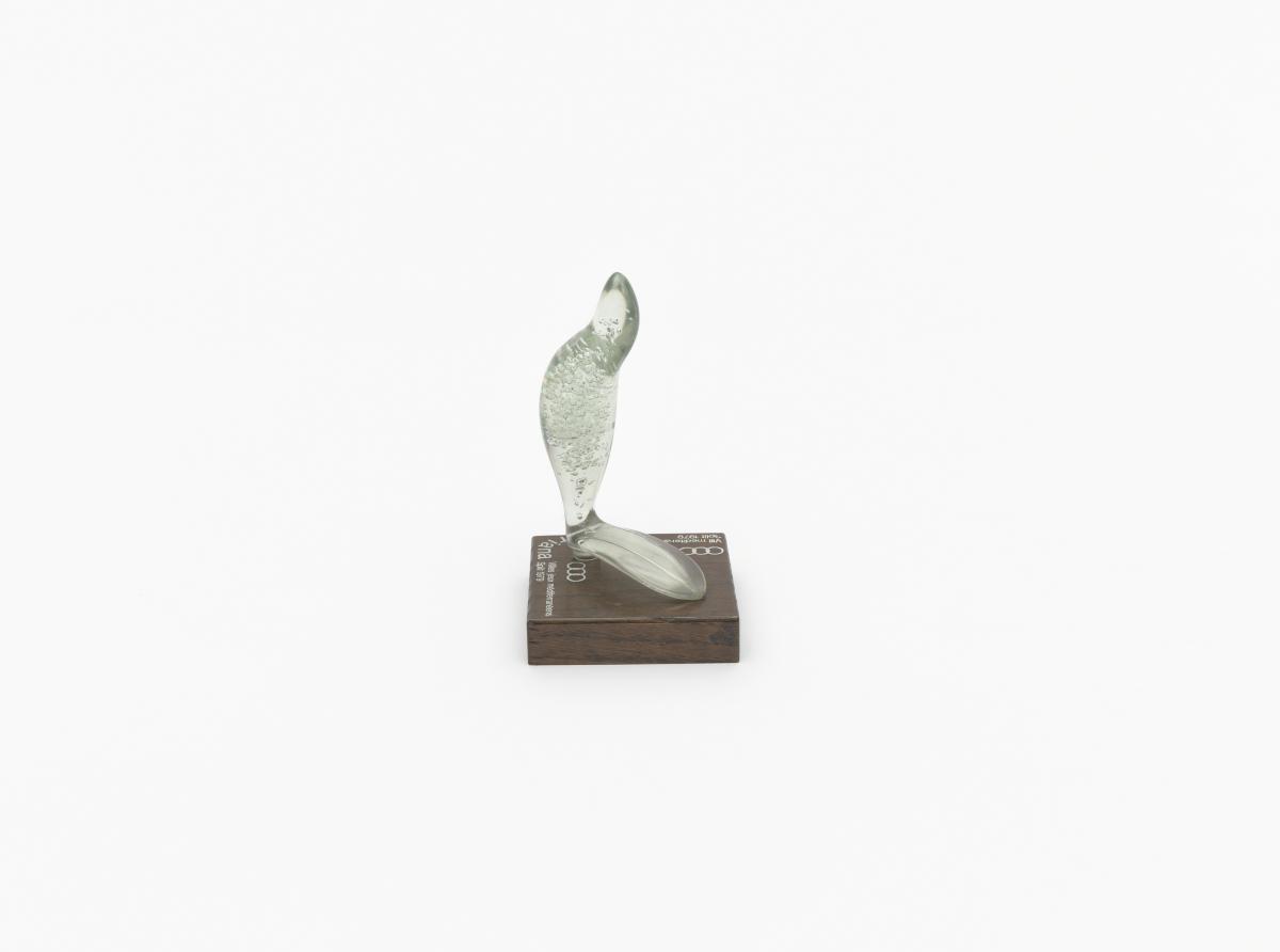 Glass sculpture featuring the mascot, a Mediterranean monk seal on a wooden base with the Mediterranean Games' emblem and the caption: "Adriana, VIII mediteranske igre Split 1979, VIIIes jeux méditerranéens Split 1979".