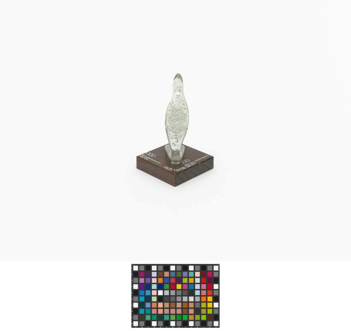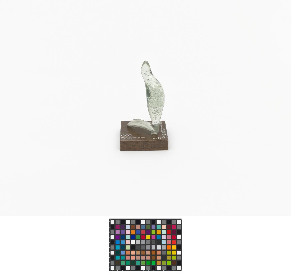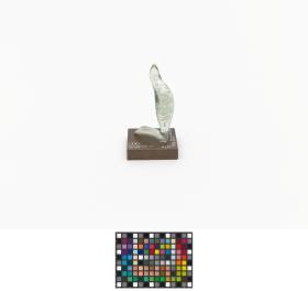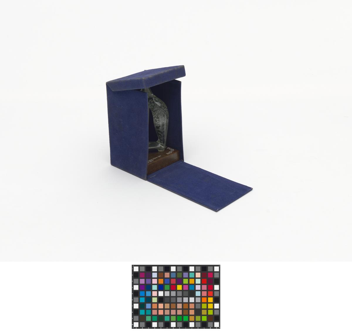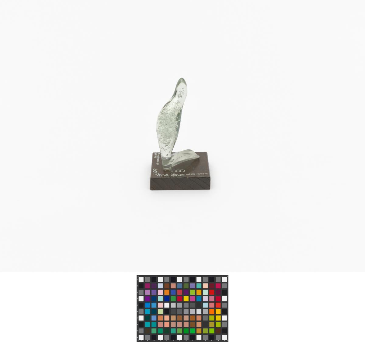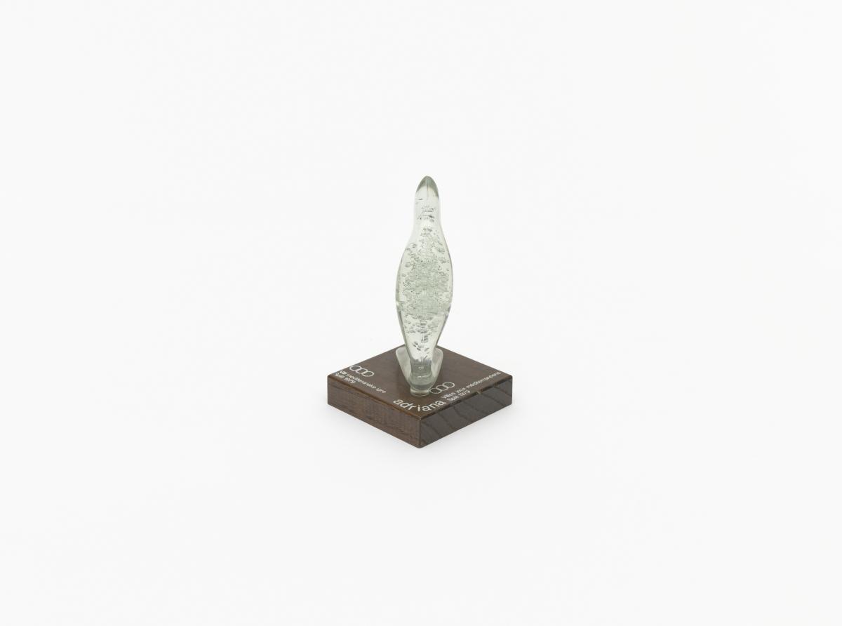 Glass sculpture featuring the mascot, a Mediterranean monk seal on a wooden base with the Mediterranean Games' emblem and the caption: "Adriana, VIII mediteranske igre Split 1979, VIIIes jeux méditerranéens Split 1979".