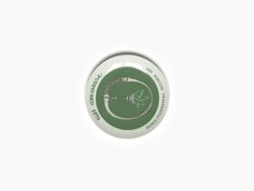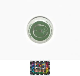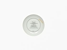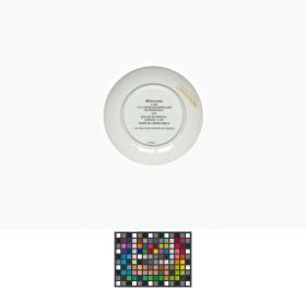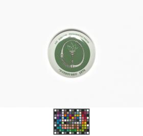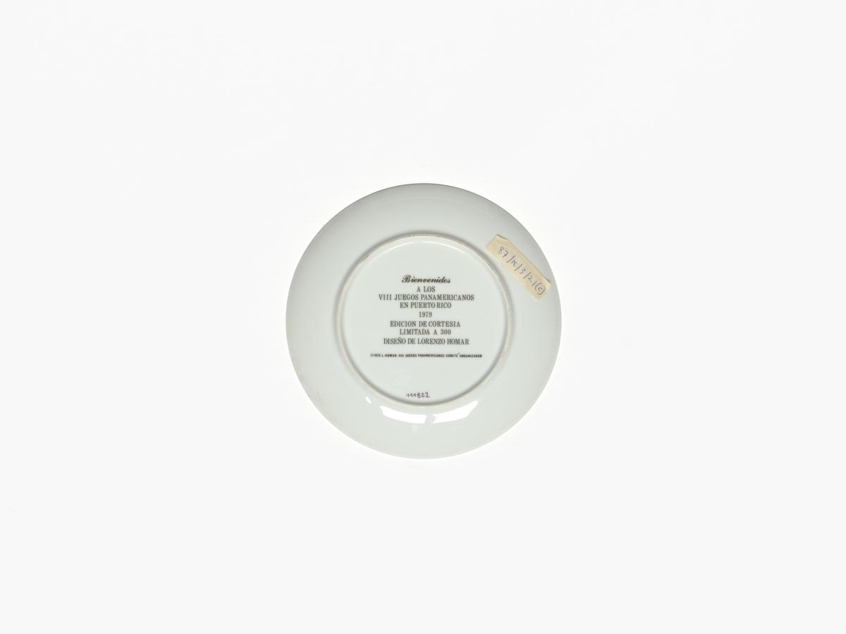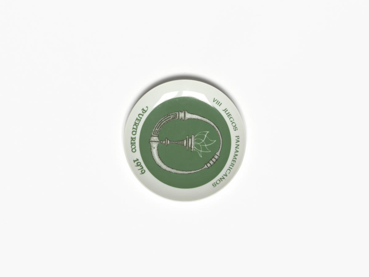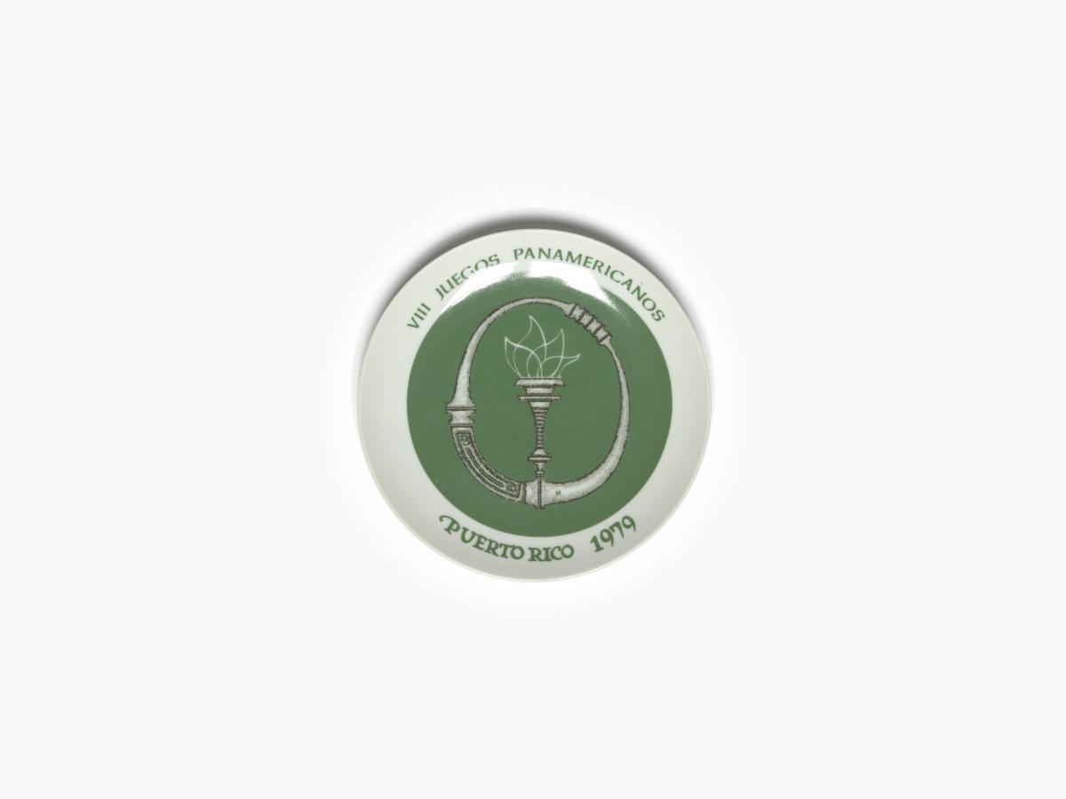 Green and white plate. In the middle, drawing representing a torch and a stone collard of the Taino Indians. Caption: "VIII JUEGOS PANAMERICANOS ; PUERTO RICO 1979". On the back, caption: "Bienvenidos / A LOS / VIII JUEGOS PANAMERICANOS / EN PUERTO RICO / 1979 / EDICION DE CORTESIA / LIMITADA A 300 / DISENO DE LORENZO HOMAR / 1975 L. HOMAR. VIII JUEGOS PANAMERICANOS COMITE ORGANIZADOR".