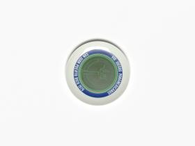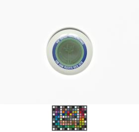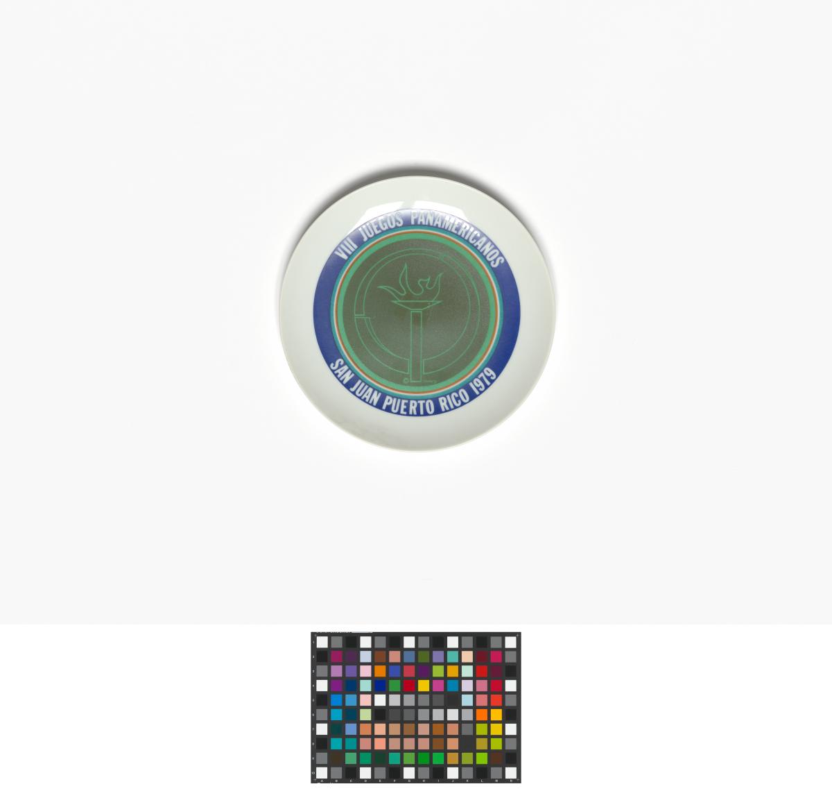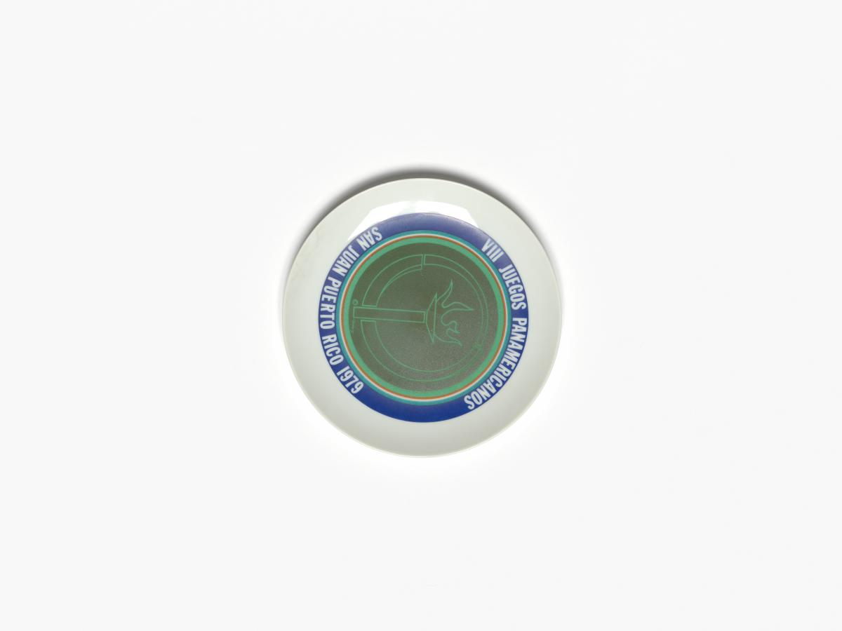 Plate with a torch and a stone collard of the Taino Indians. Caption: "VIII JUEGOS PANAMERICANOS ; SAN JUAN PUERTO RICO 1979". On the back, manufacturer's name.