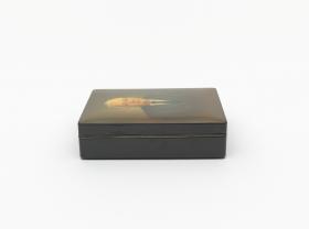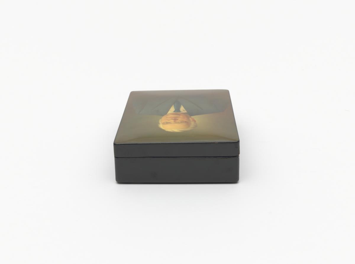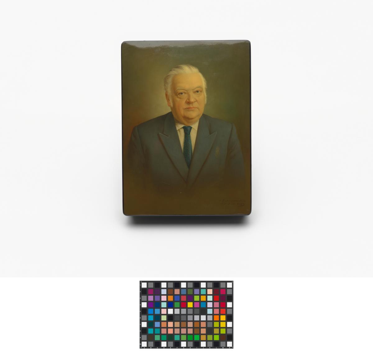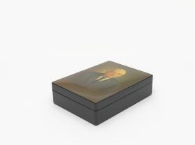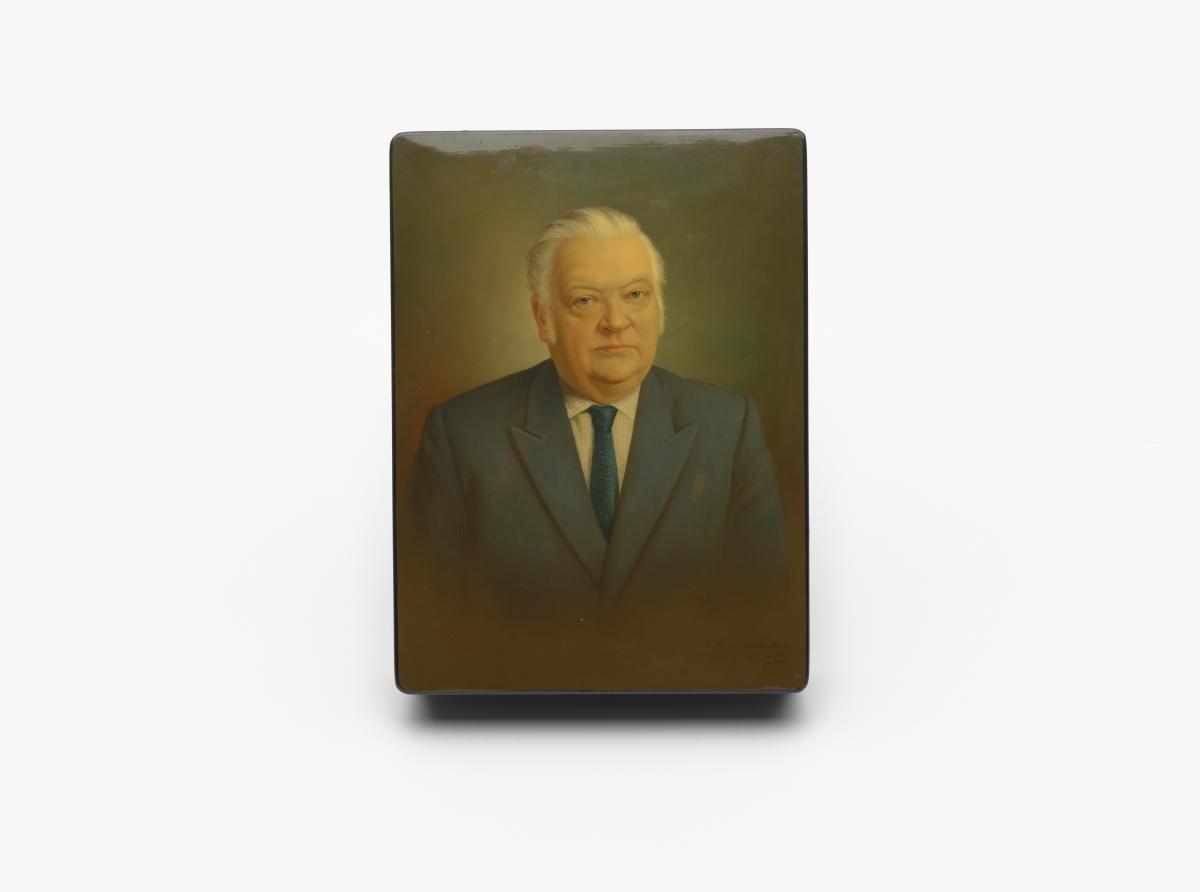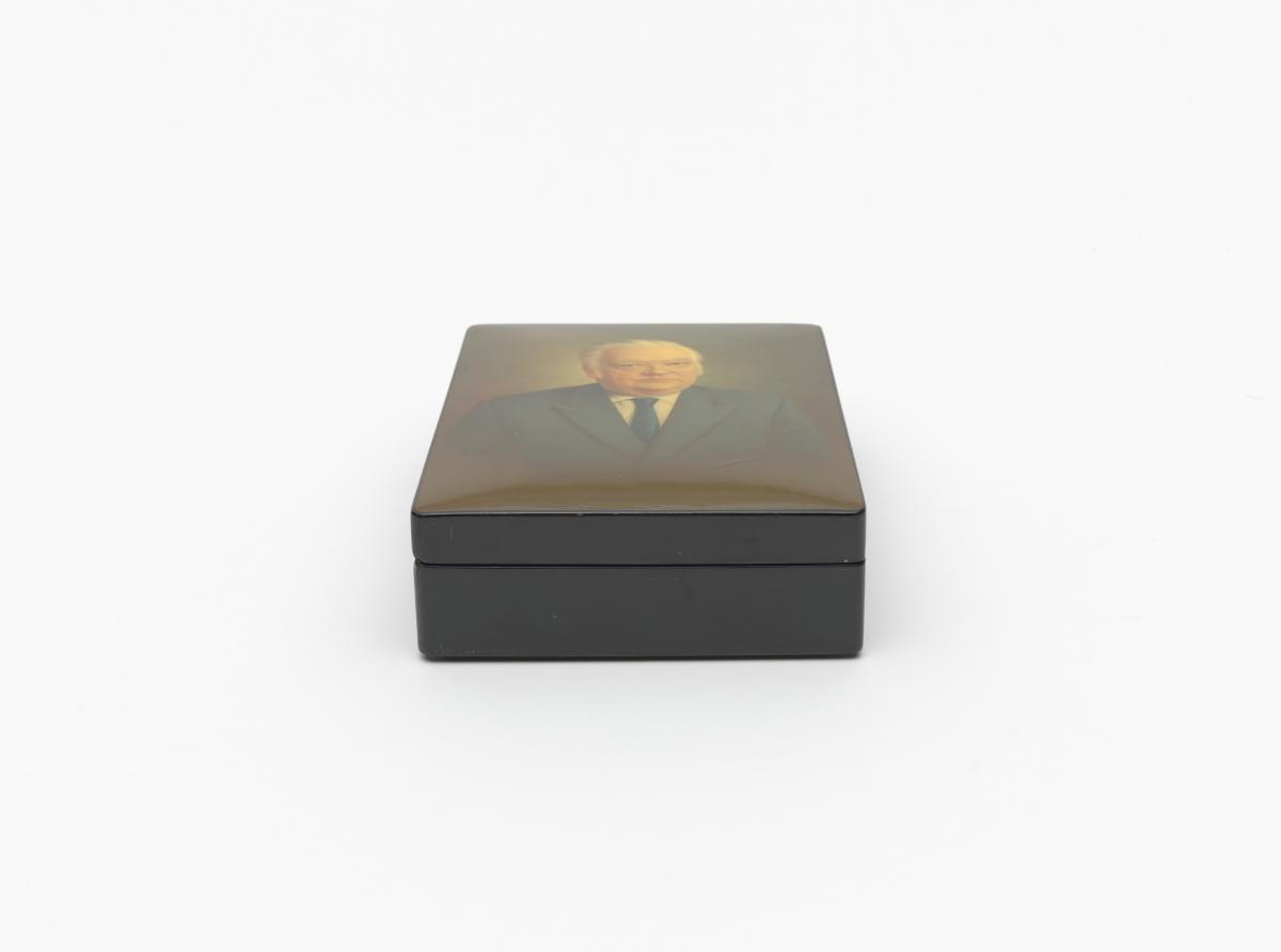 Box with Lord Killanin's portrait with the date 1974 and a signature with Cyrillic letters.