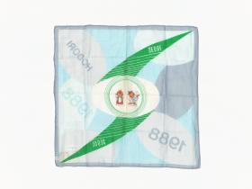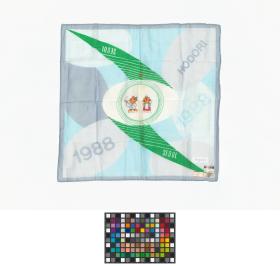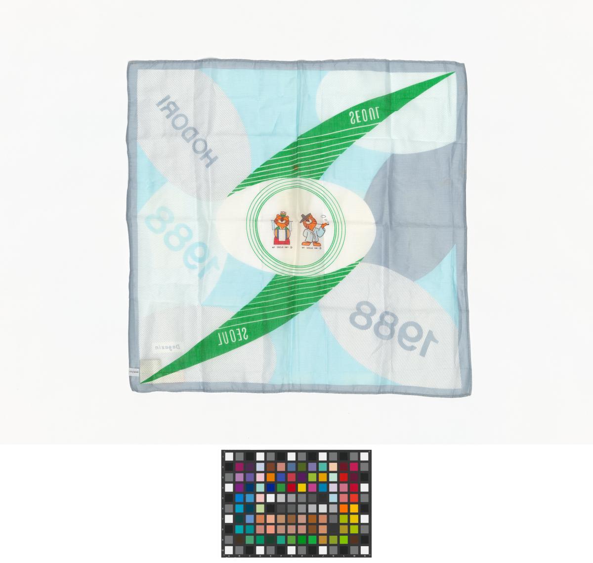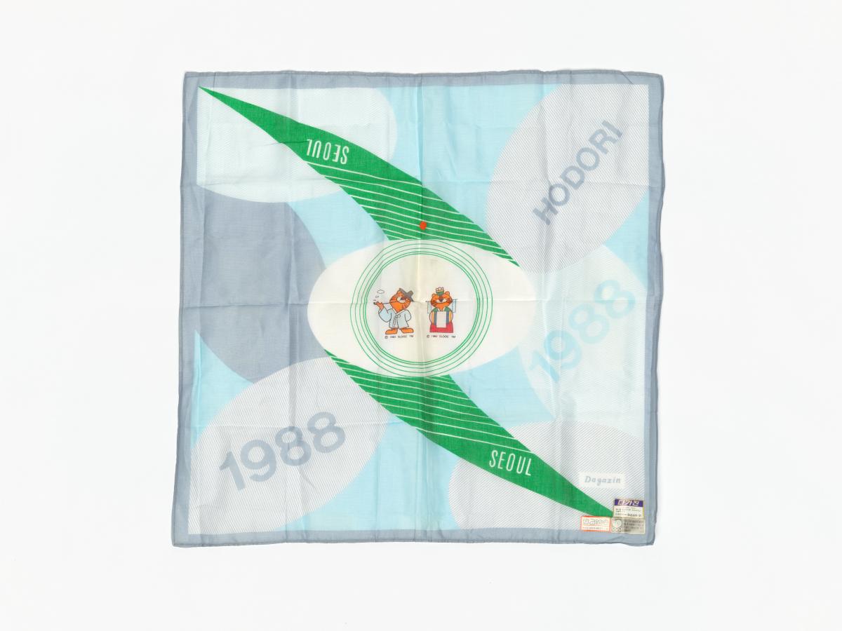 Handkerchief with geometrical motives and Hodori and his wife Hosumi in traditional feminine and masculine Korean cloths. Caption "Seoul Hodori 1988".