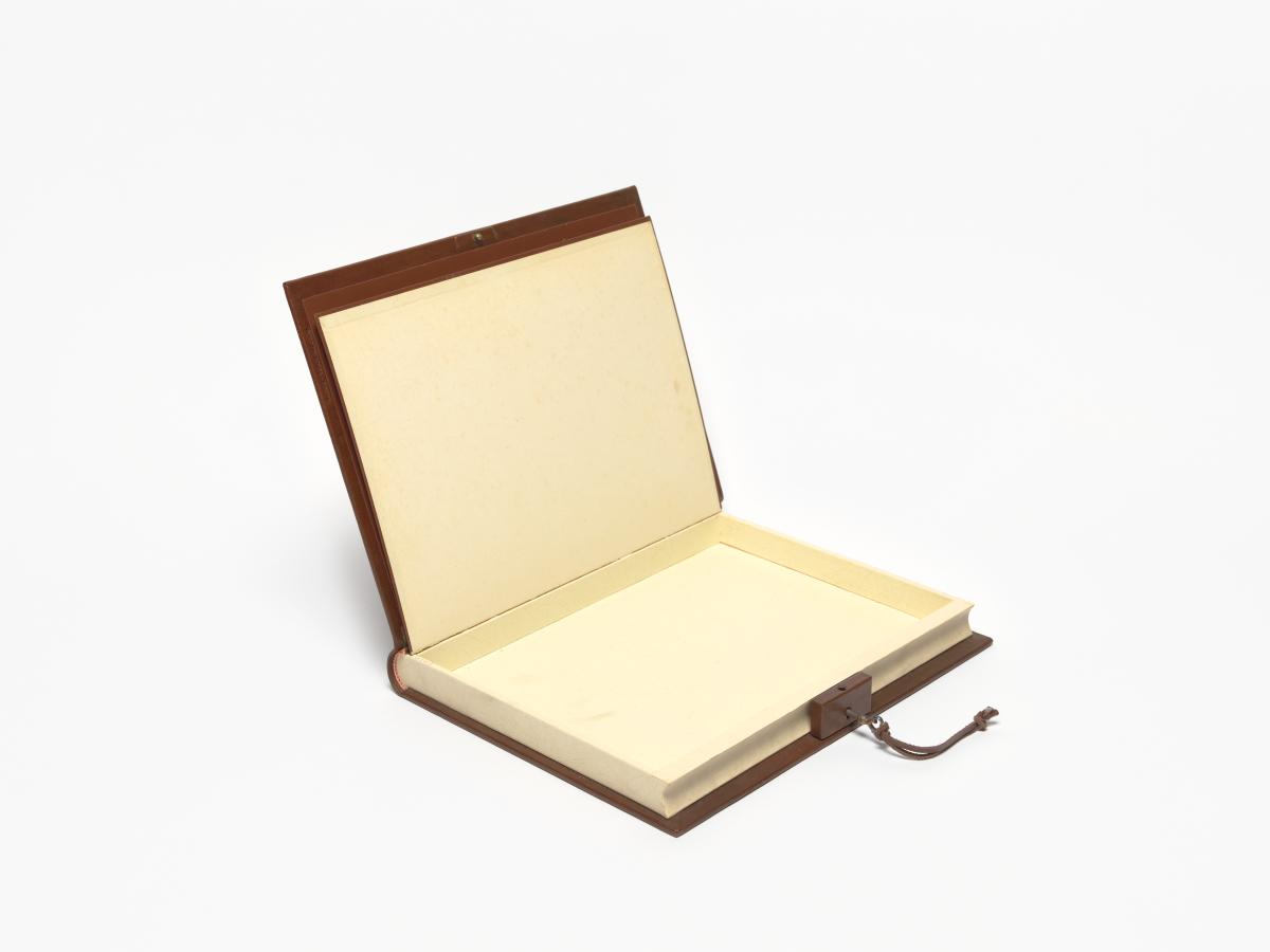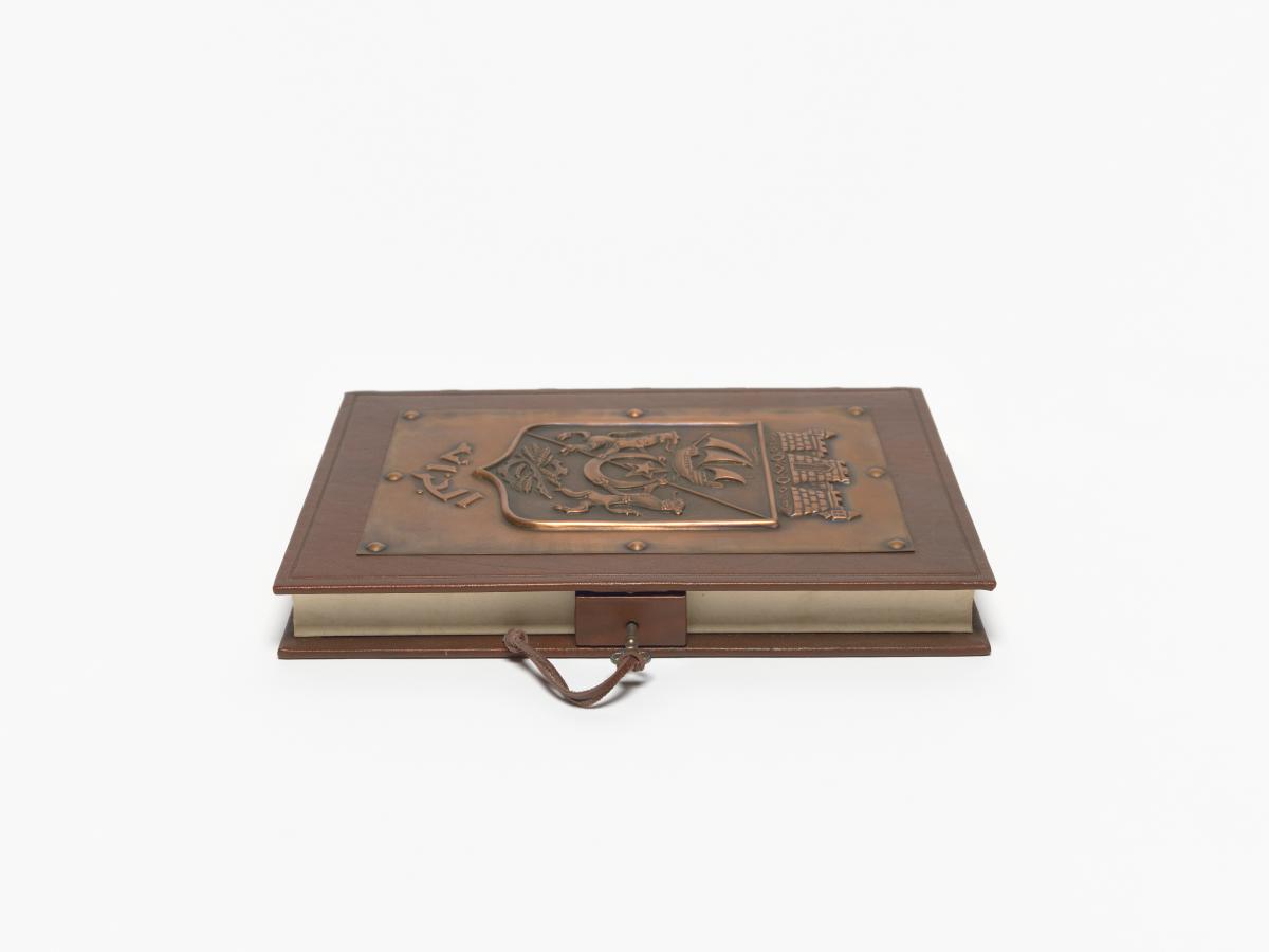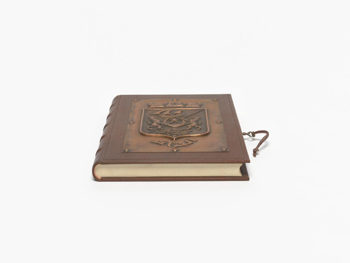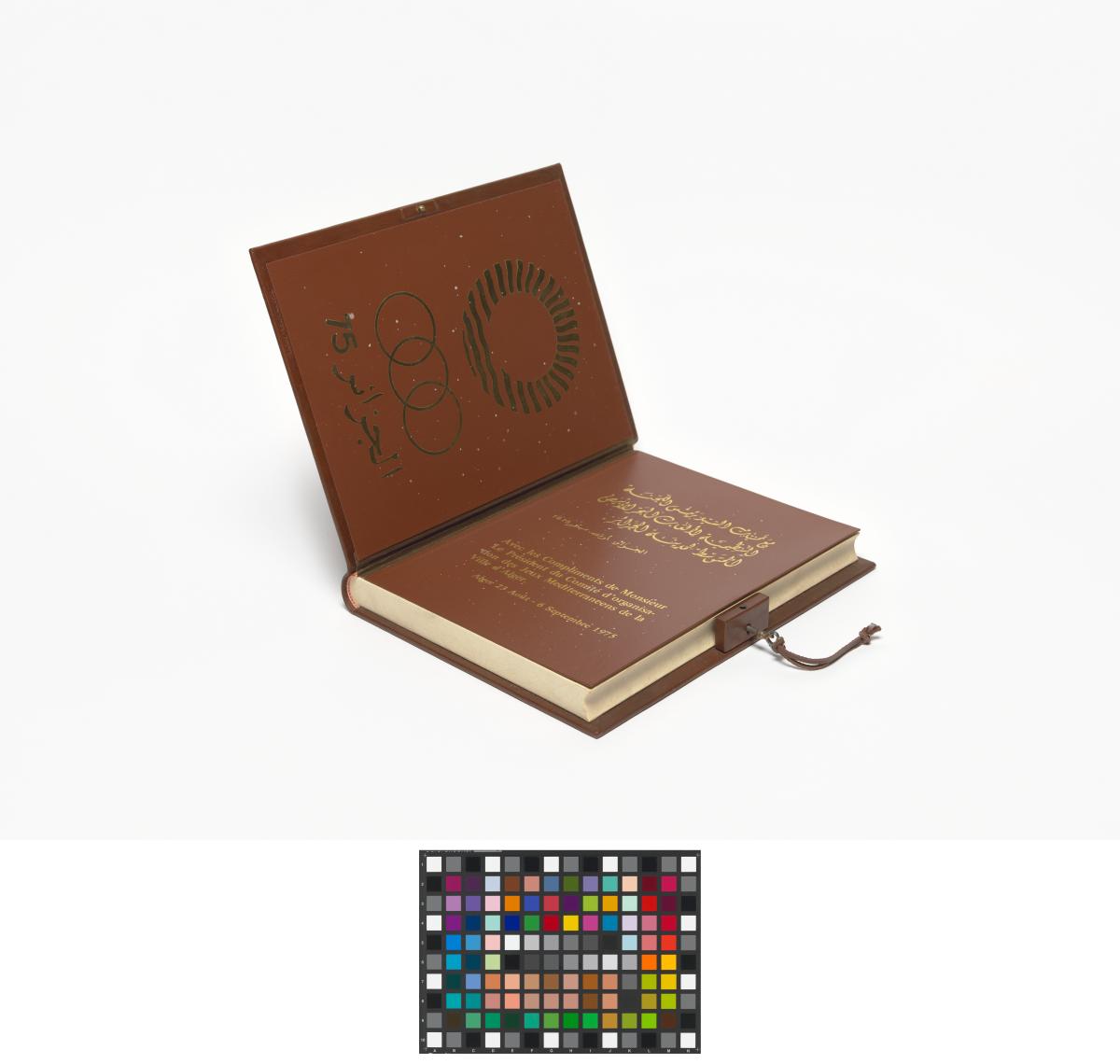 Book-shaped box, closing with a key and with the coat of arms of Algiers on the cover. Inside with the emblem of the Mediterranean Games and a caption in arabic and french: "Avec les compliments de Monsieur le Président du Comité Organisateur des Jeux Méditerranéens de la Ville d'Alger. Alger 23 août-6 septembre 1975".