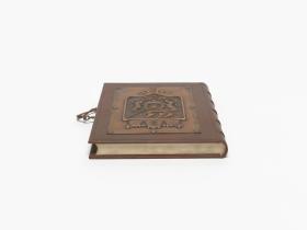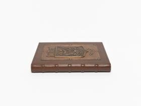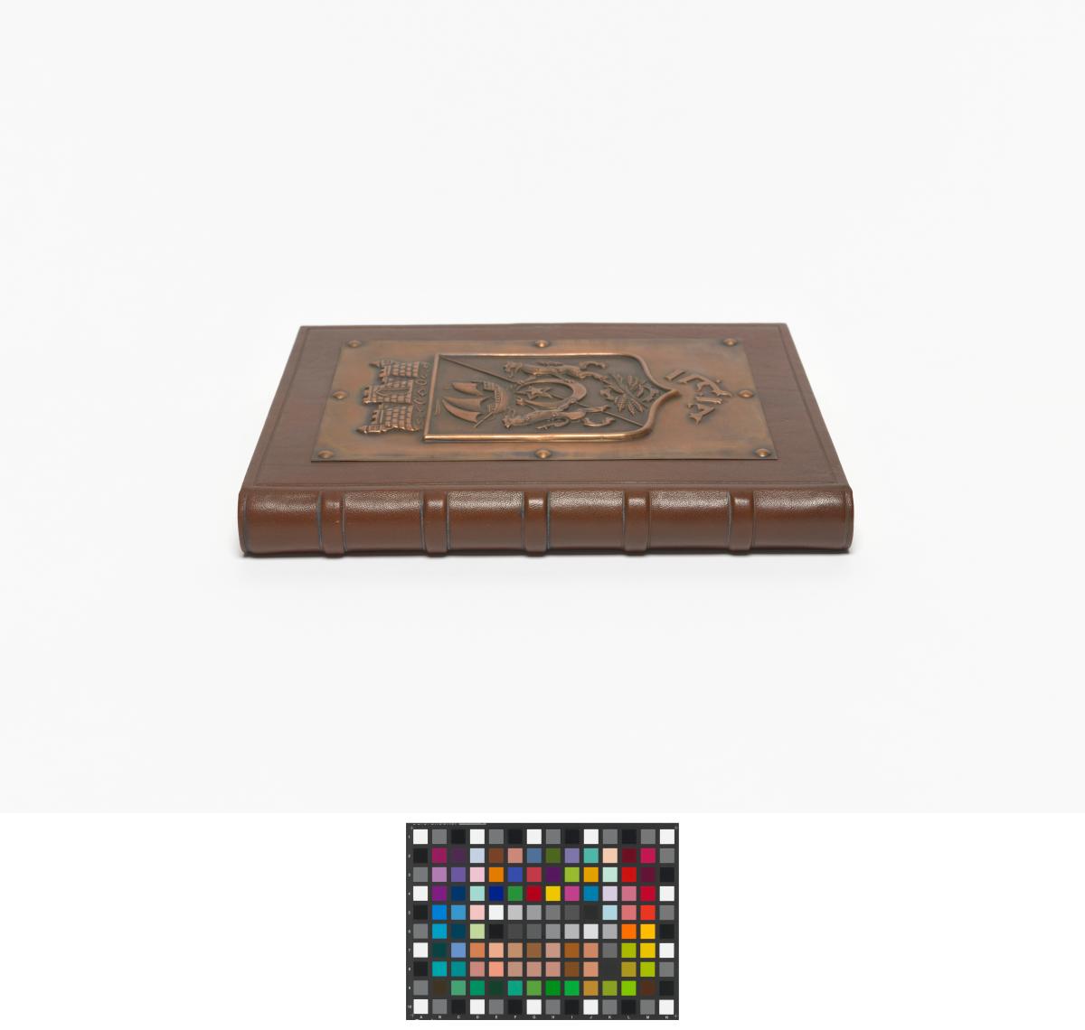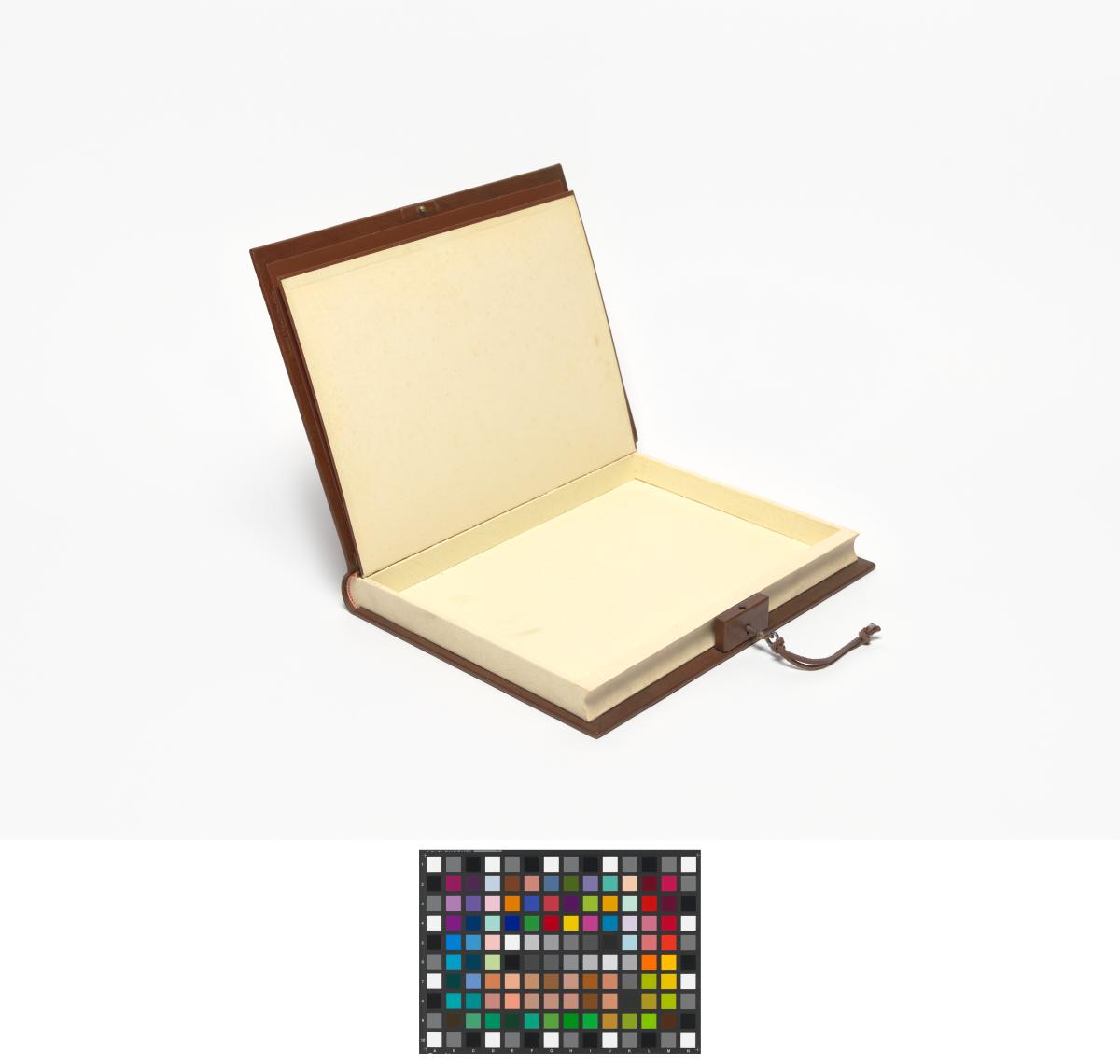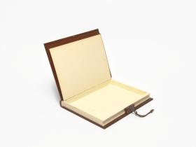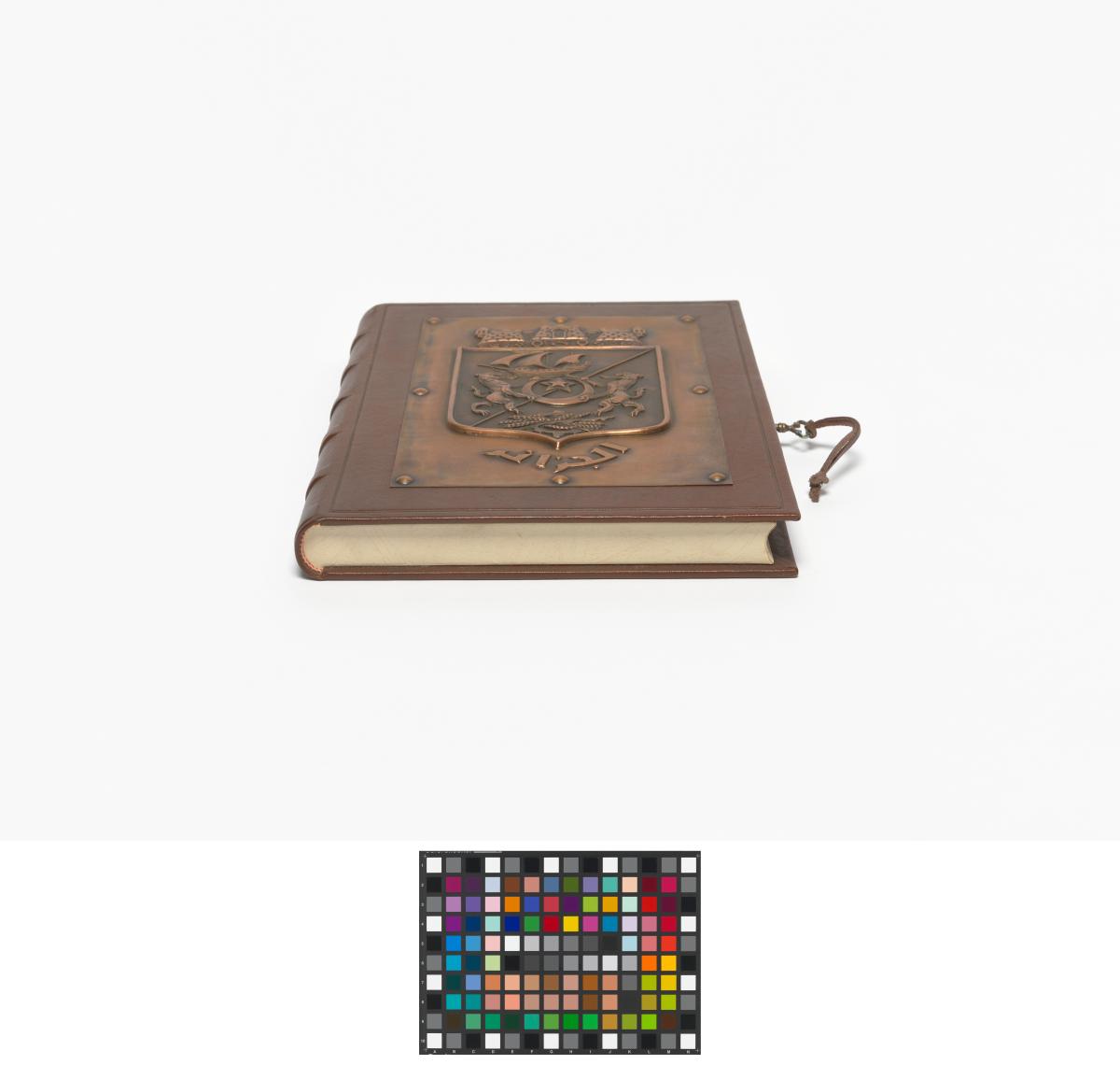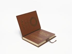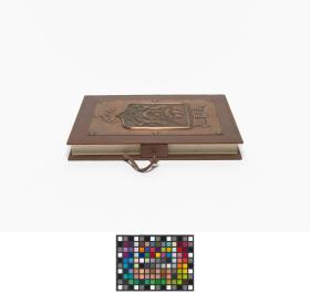 Book-shaped box, closing with a key and with the coat of arms of Algiers on the cover. Inside with the emblem of the Mediterranean Games and a caption in arabic and french: "Avec les compliments de Monsieur le Président du Comité Organisateur des Jeux Méditerranéens de la Ville d'Alger. Alger 23 août-6 septembre 1975".