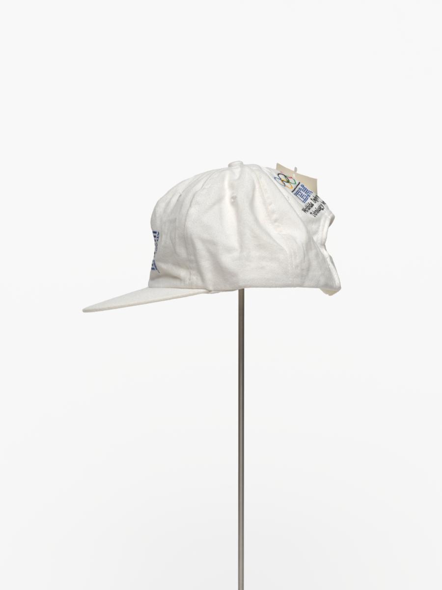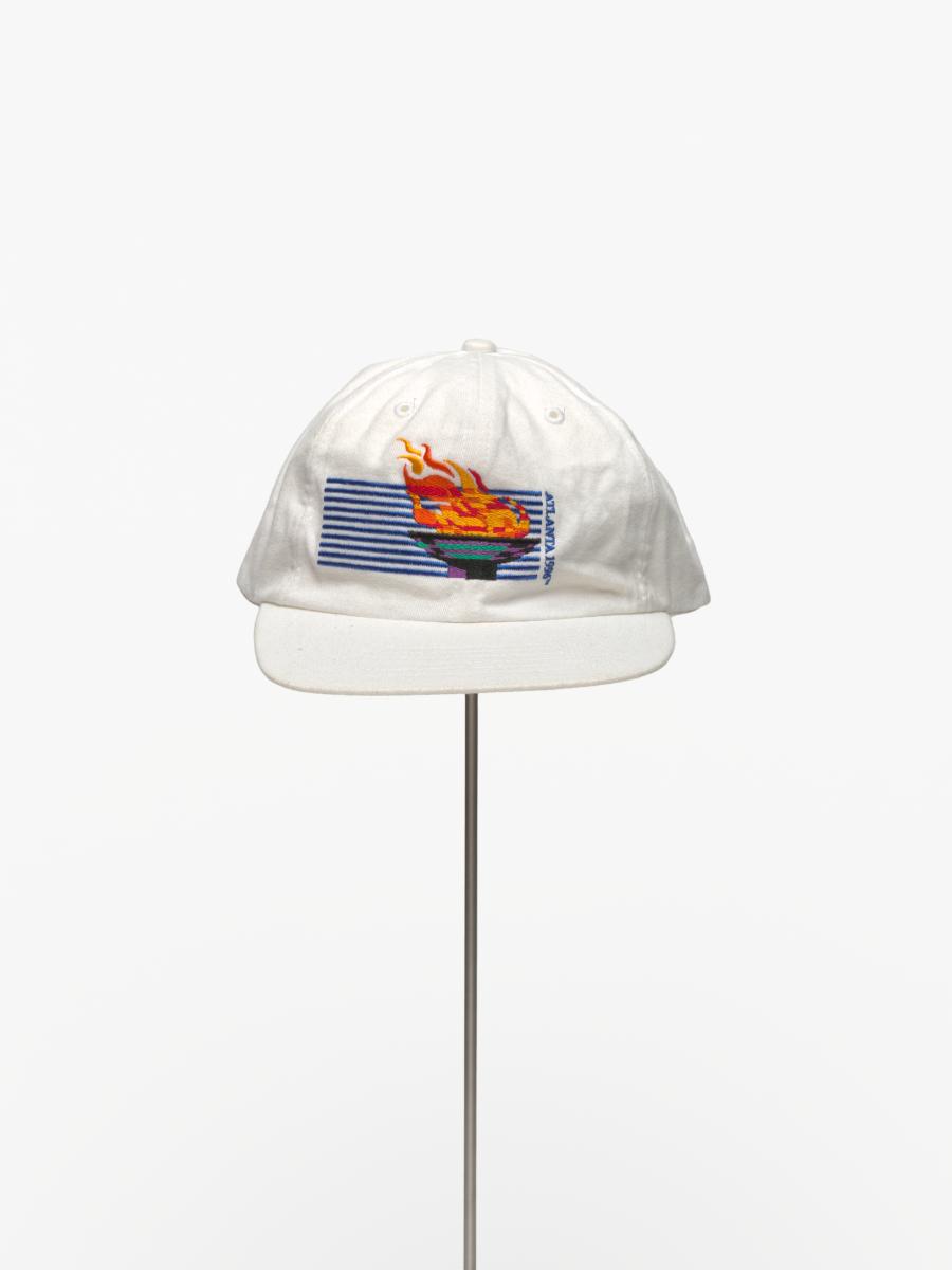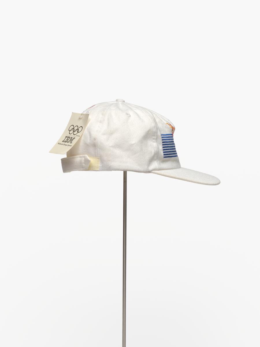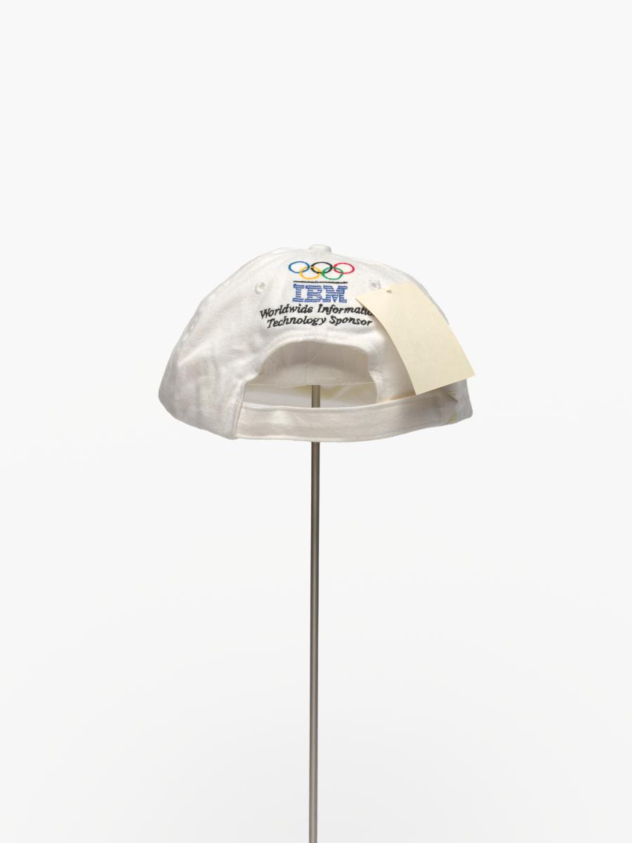 White cap with the cauldron containing the olympic flame, in the background are the blue lines of IBM, caption: "Atlanta 1996". On the back: Olympic symbol, logo of IBM and caption: "Worldwide Information / Tecnology Sponsor".