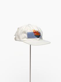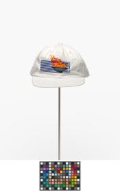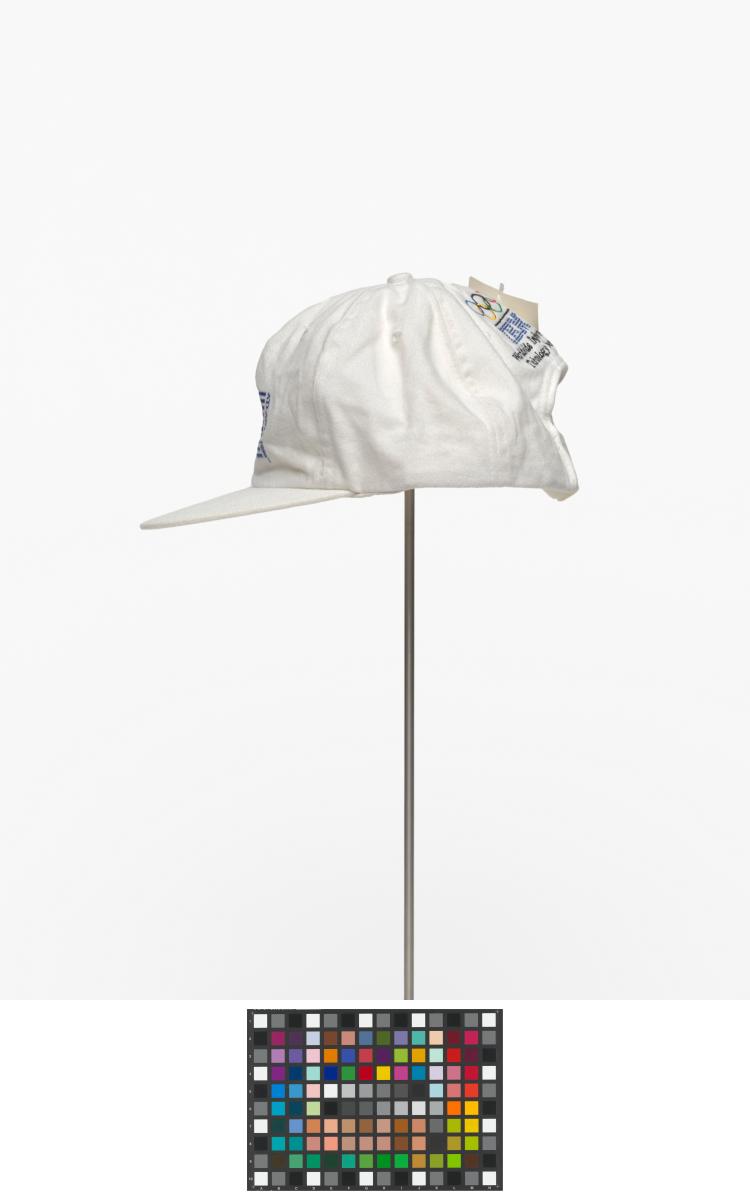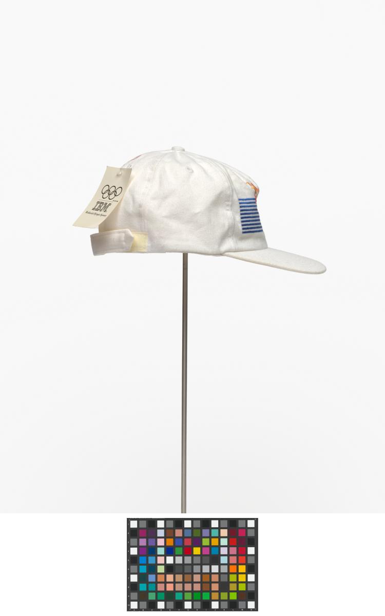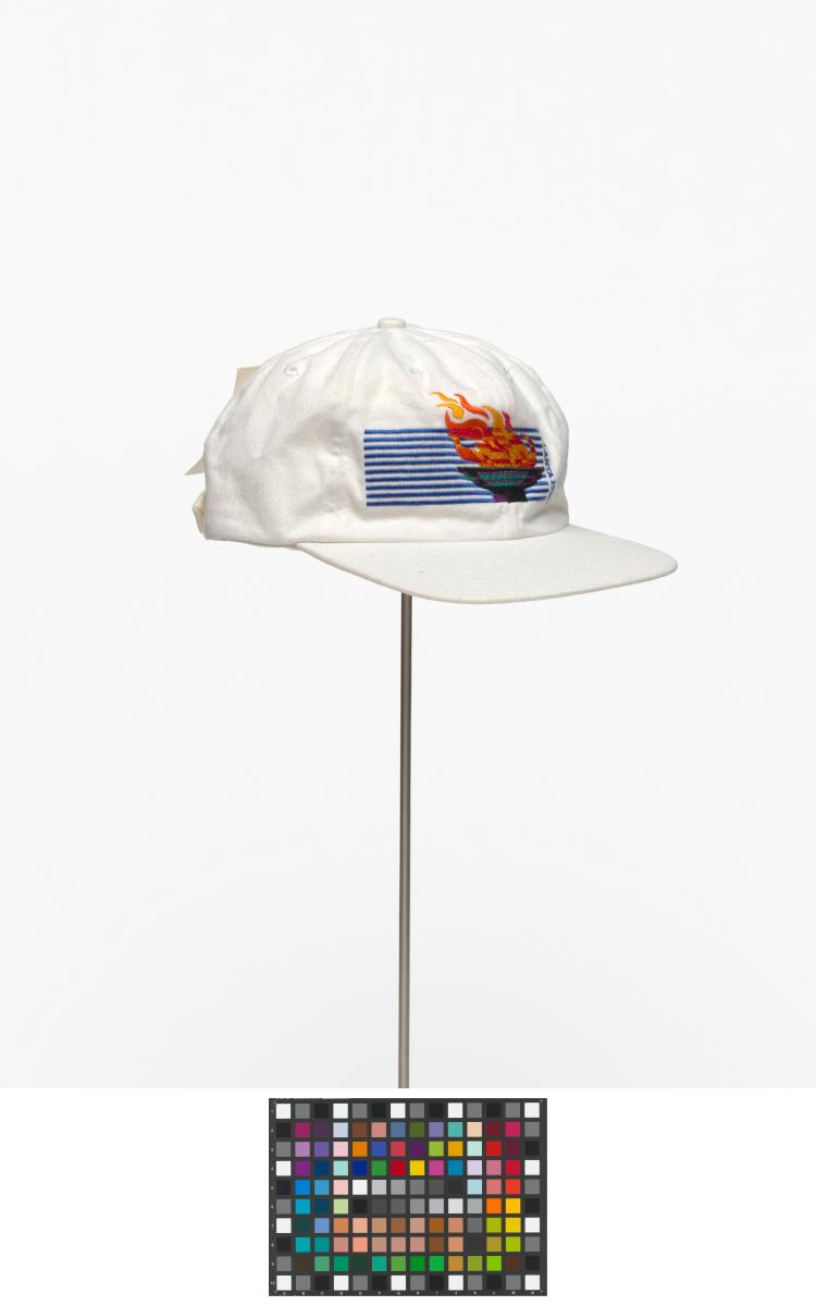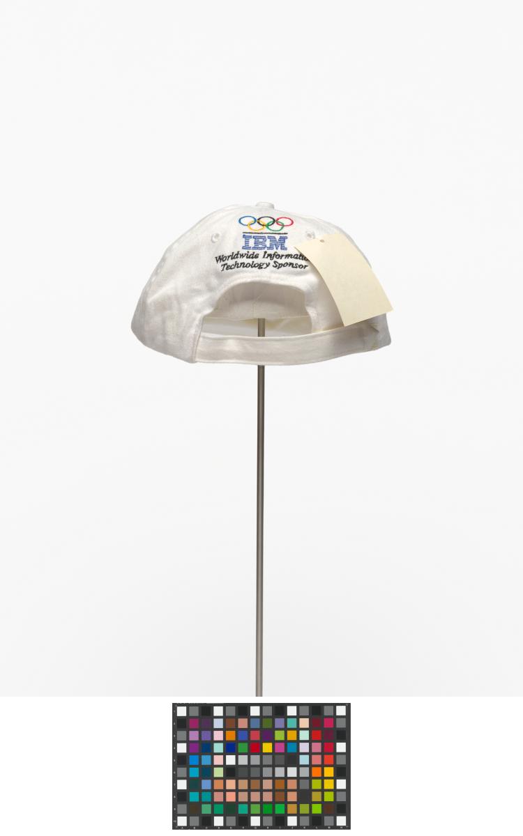 White cap with the cauldron containing the olympic flame, in the background are the blue lines of IBM, caption: "Atlanta 1996". On the back: Olympic symbol, logo of IBM and caption: "Worldwide Information / Tecnology Sponsor".