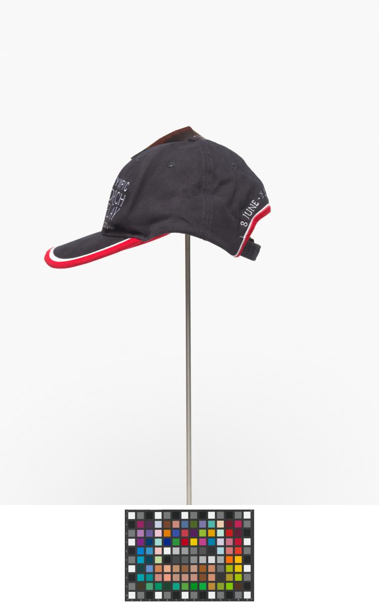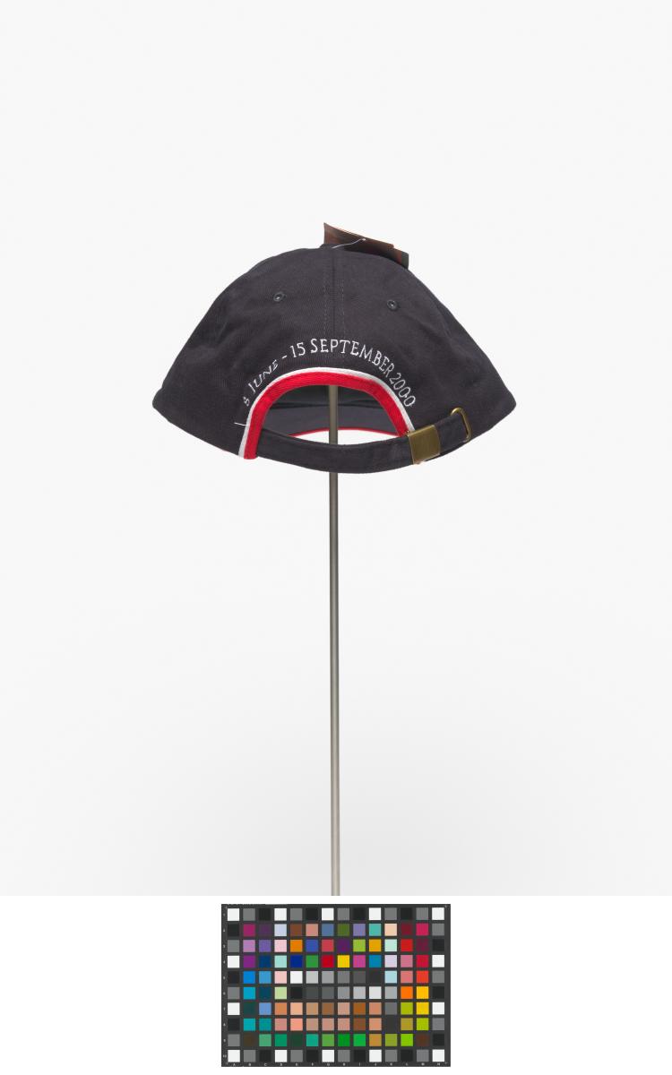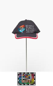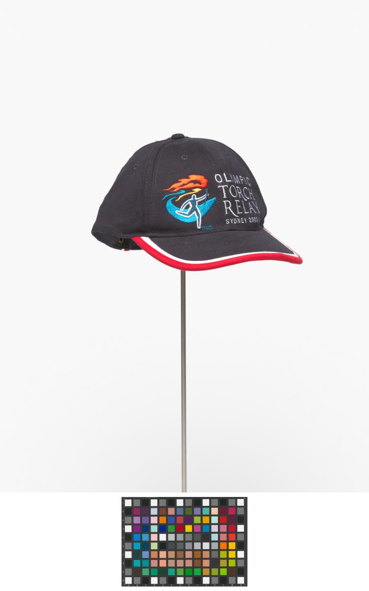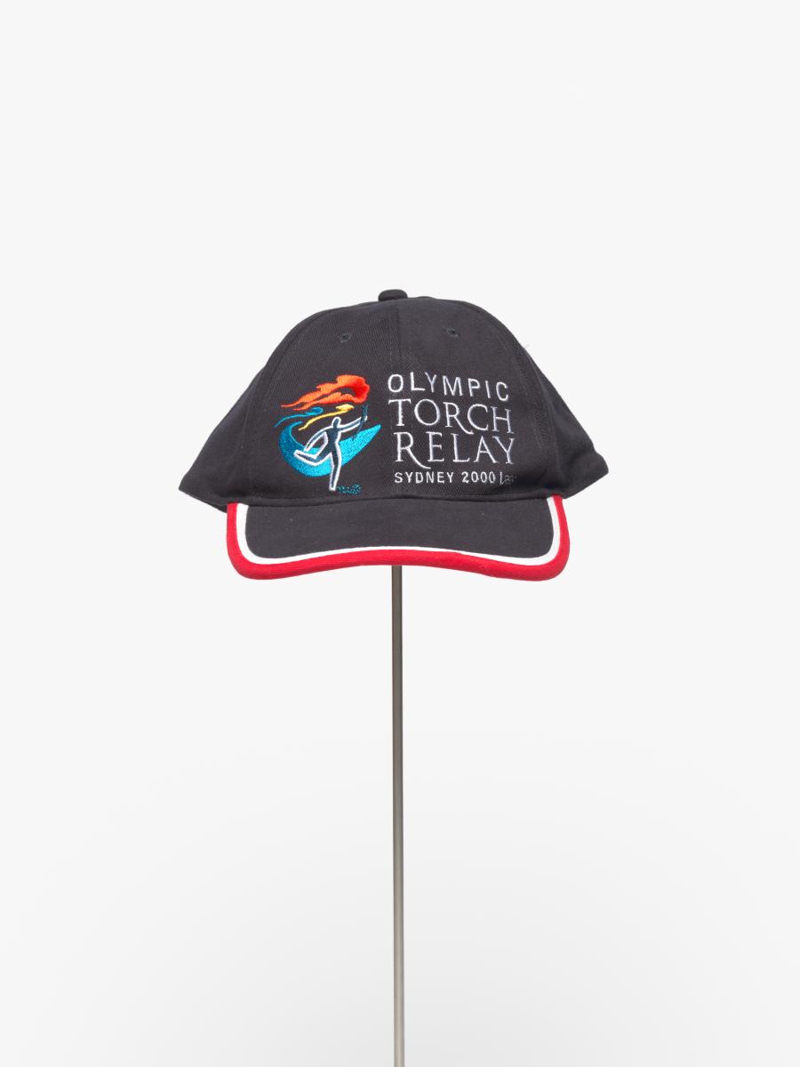 Black cap with the pictogram of the torch relay and the caption: "Olympic / Torch / Relay / Sydney 2000" with the Olympic Rings. On the back the is the caption: "8 June - 15 September 2000".