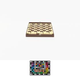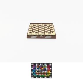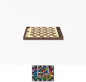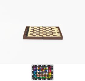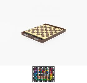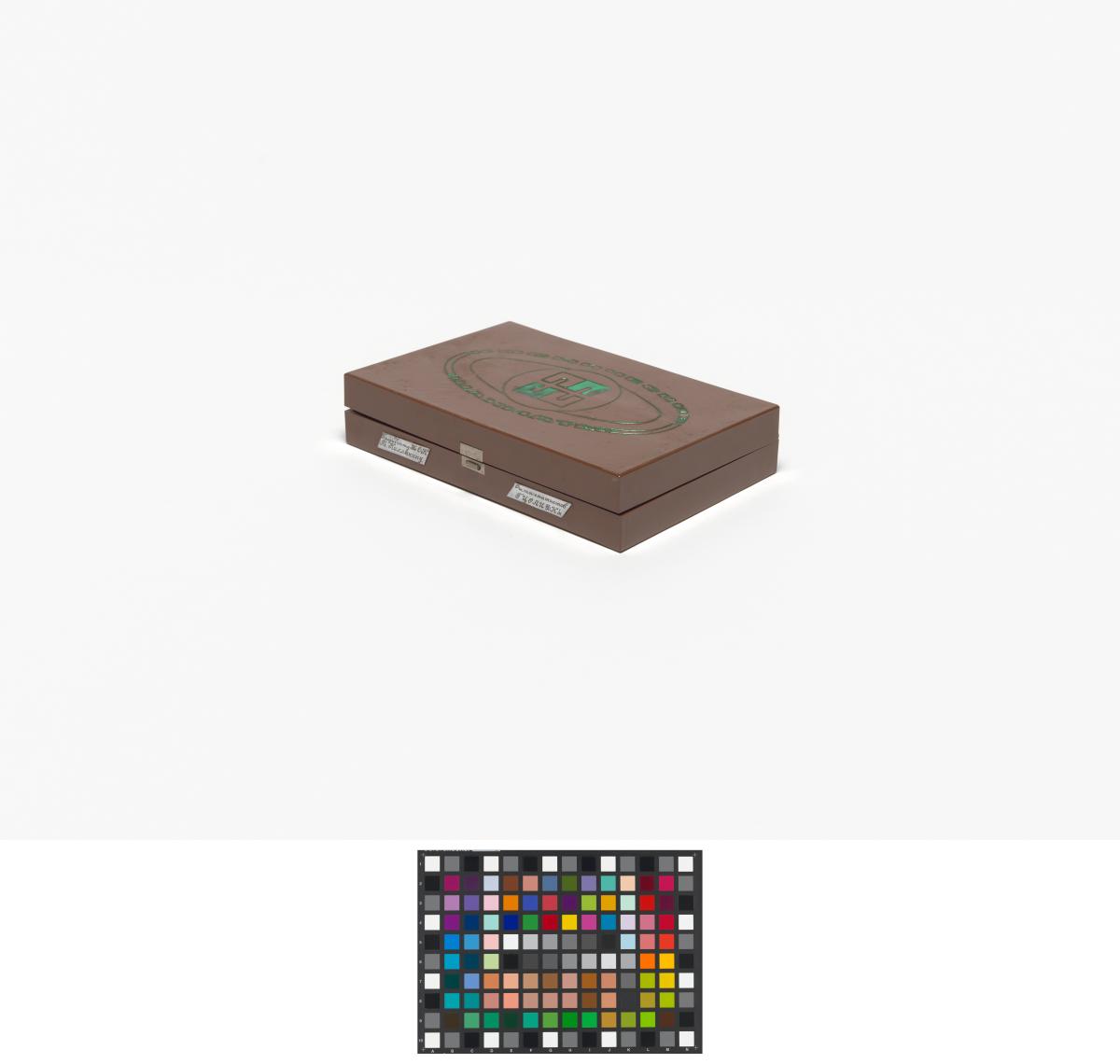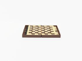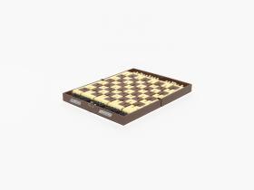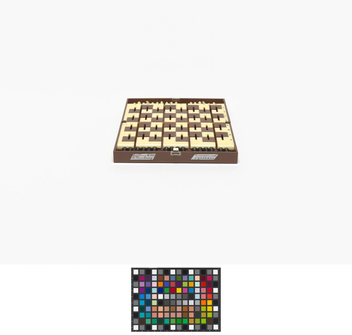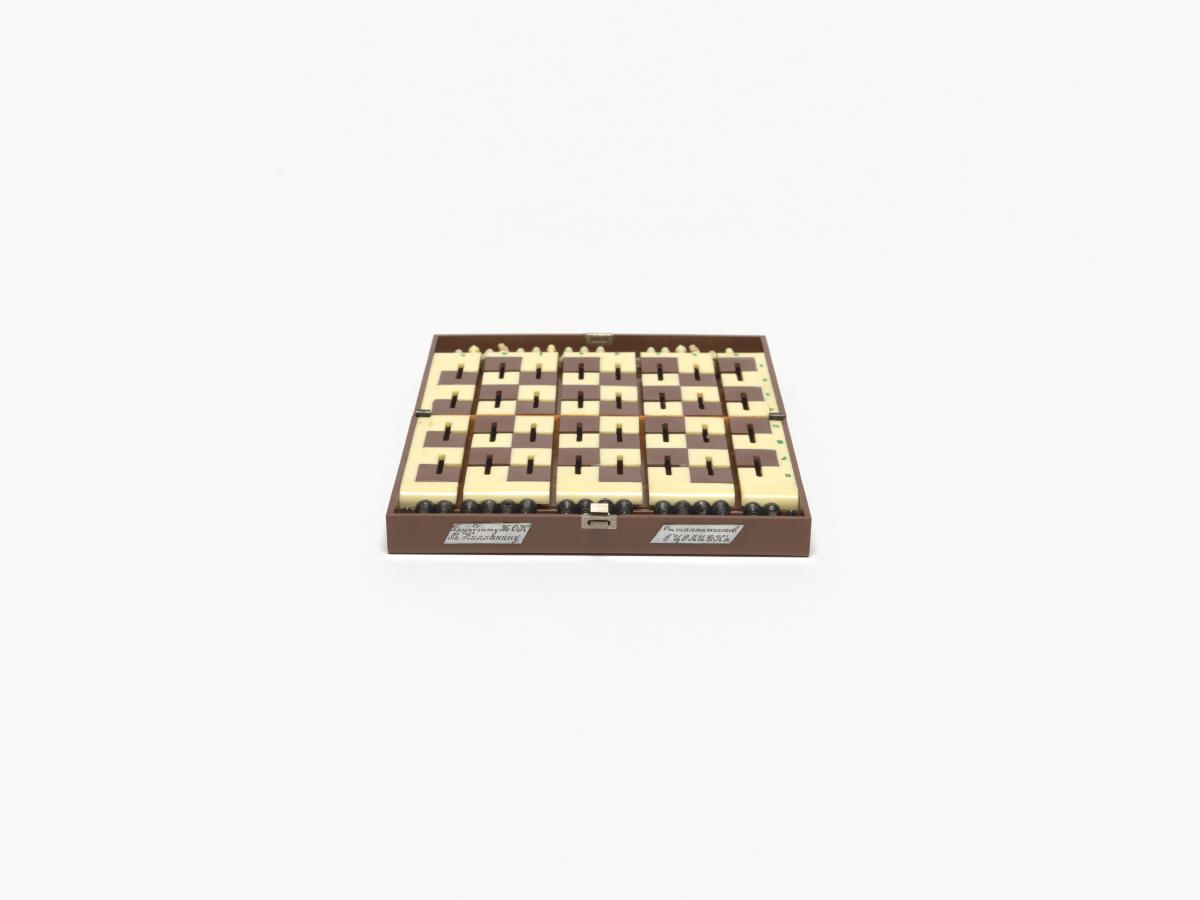 Box with stylized planet and cap. in russian: "Space chess game", metal plaques with illegible caption in russian. Inside: Chess game.