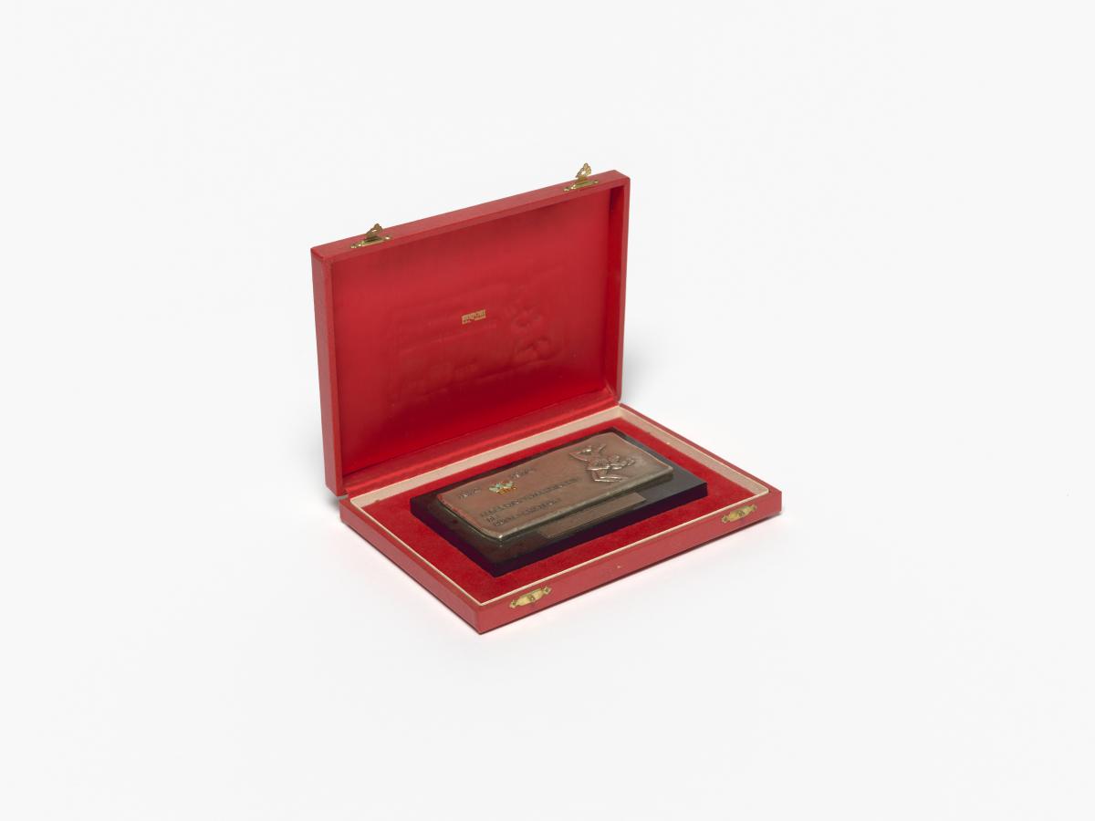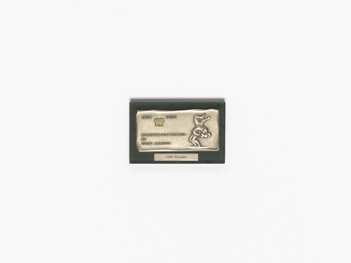 Glass plaque with metal plaque with two wrestlers and logo of the FILA, captions: "1912-1972 / FILA / Fédération Internationale / de / Lutte Amateur" and "Lord Killanin".