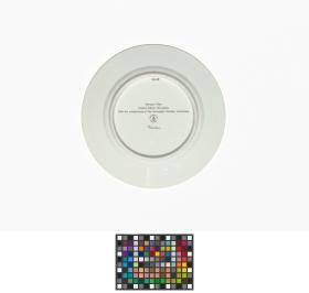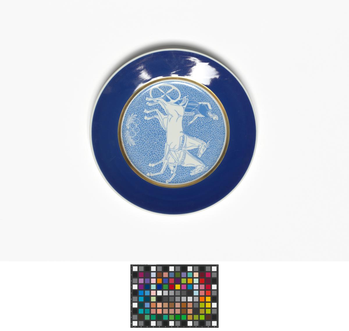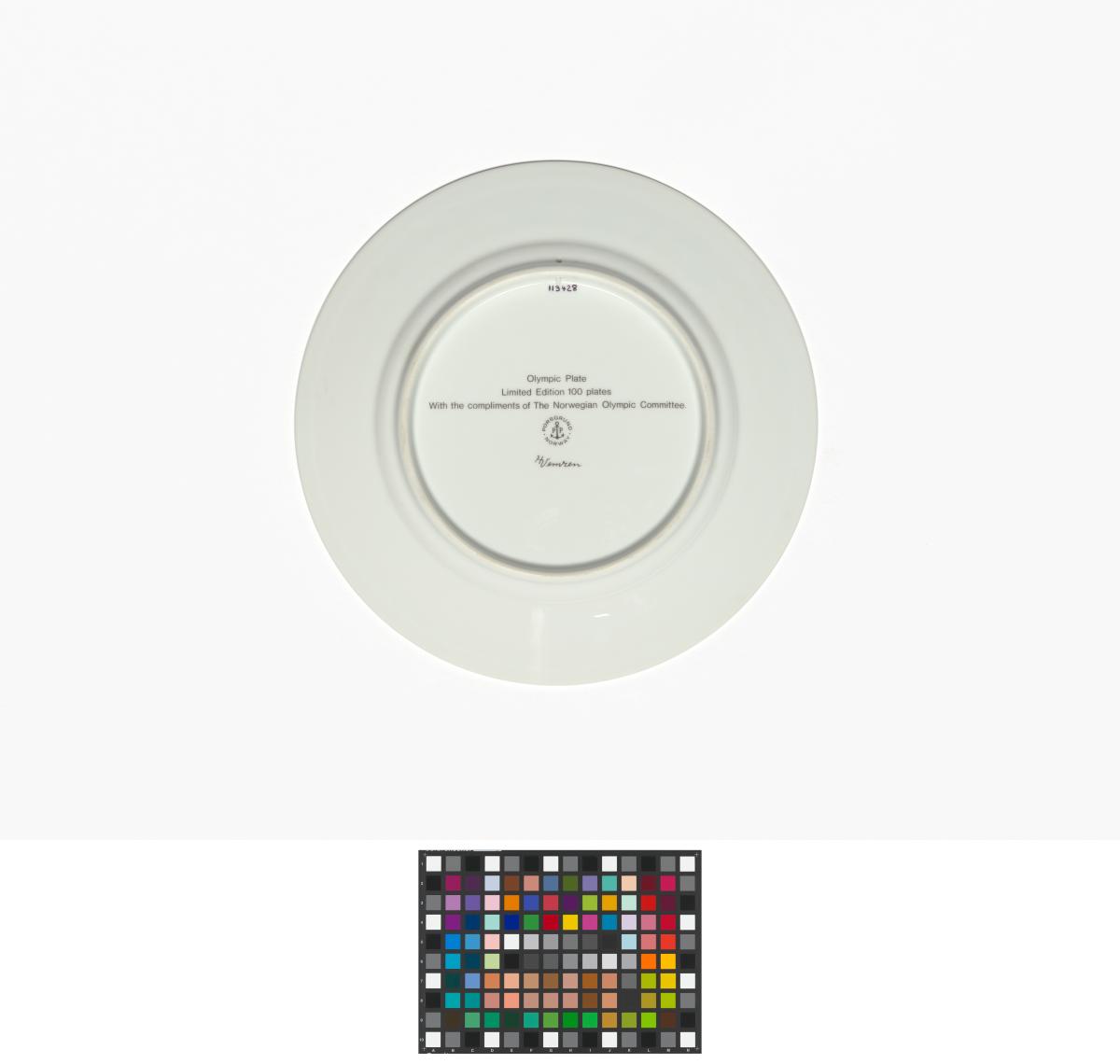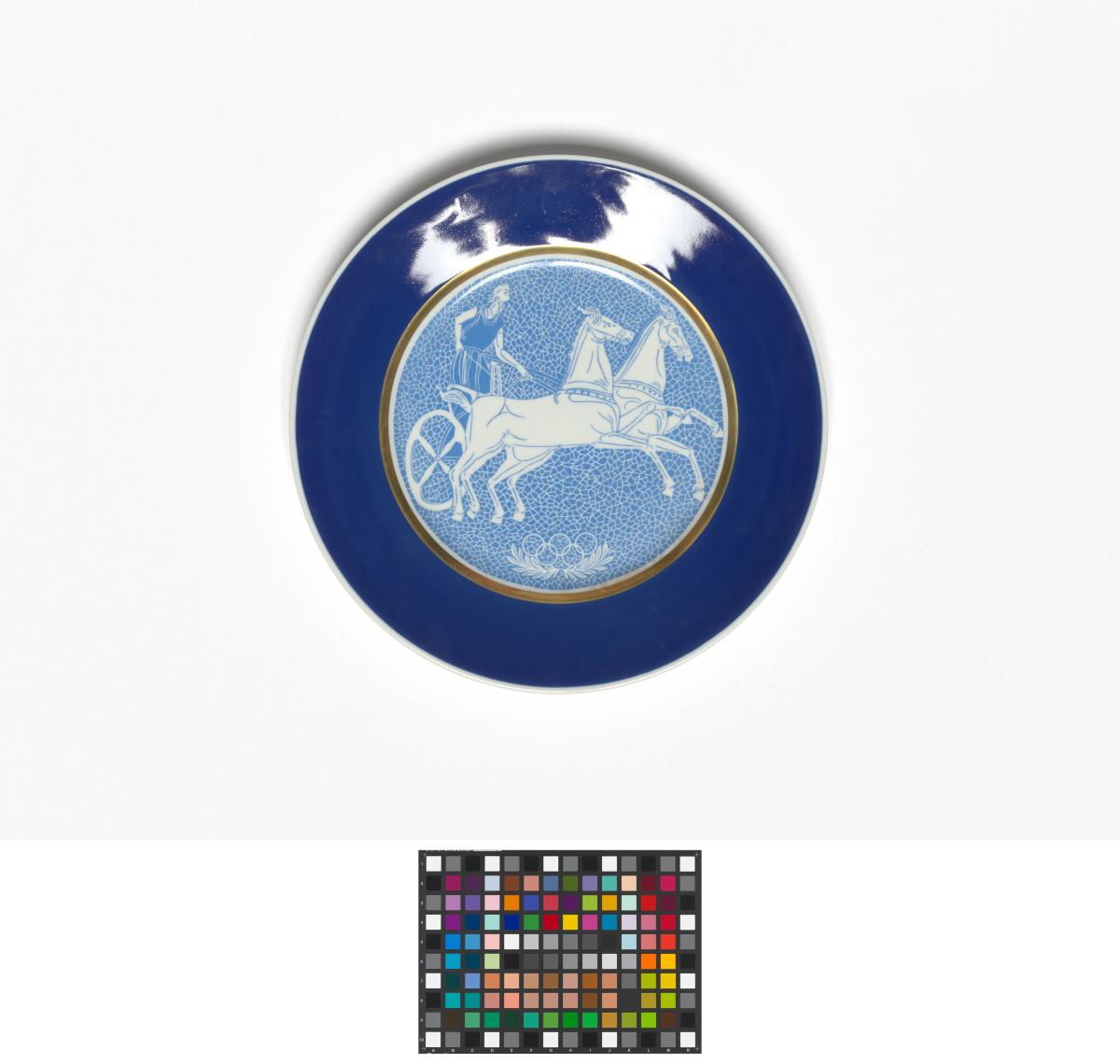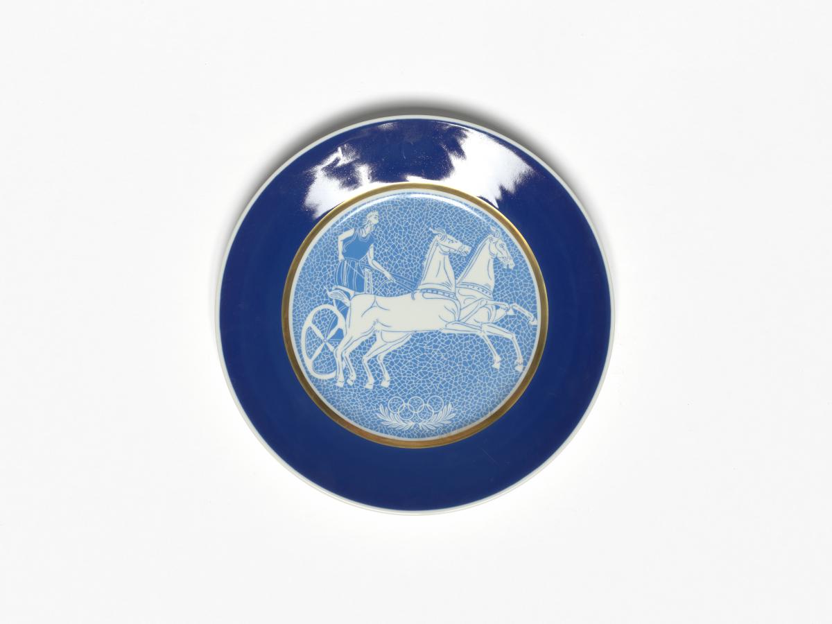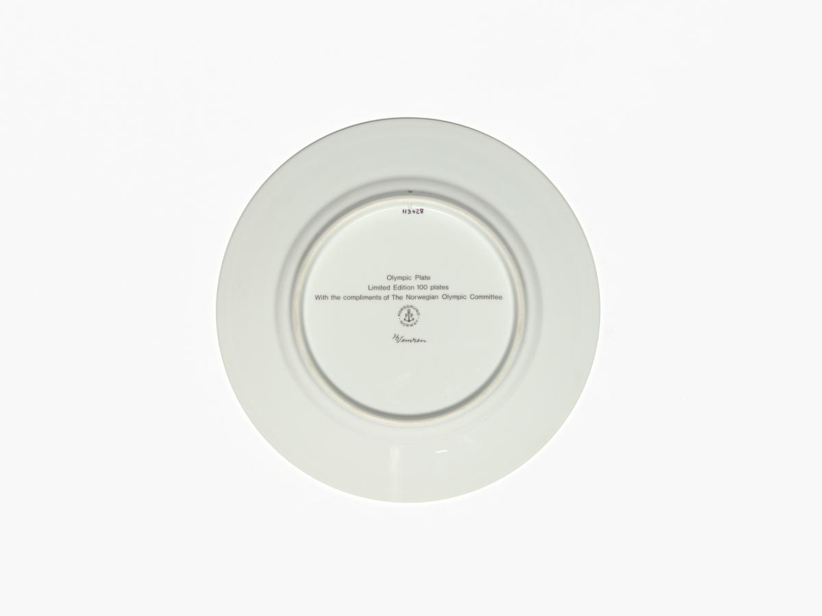 Plate with biga, Olympic symbol and laurel branches. On the back: Caption "Olympic Plate Limited Edition 100 plates With the compliments of the Norwegian Olympic Committee", manufacturer's and author's name