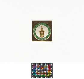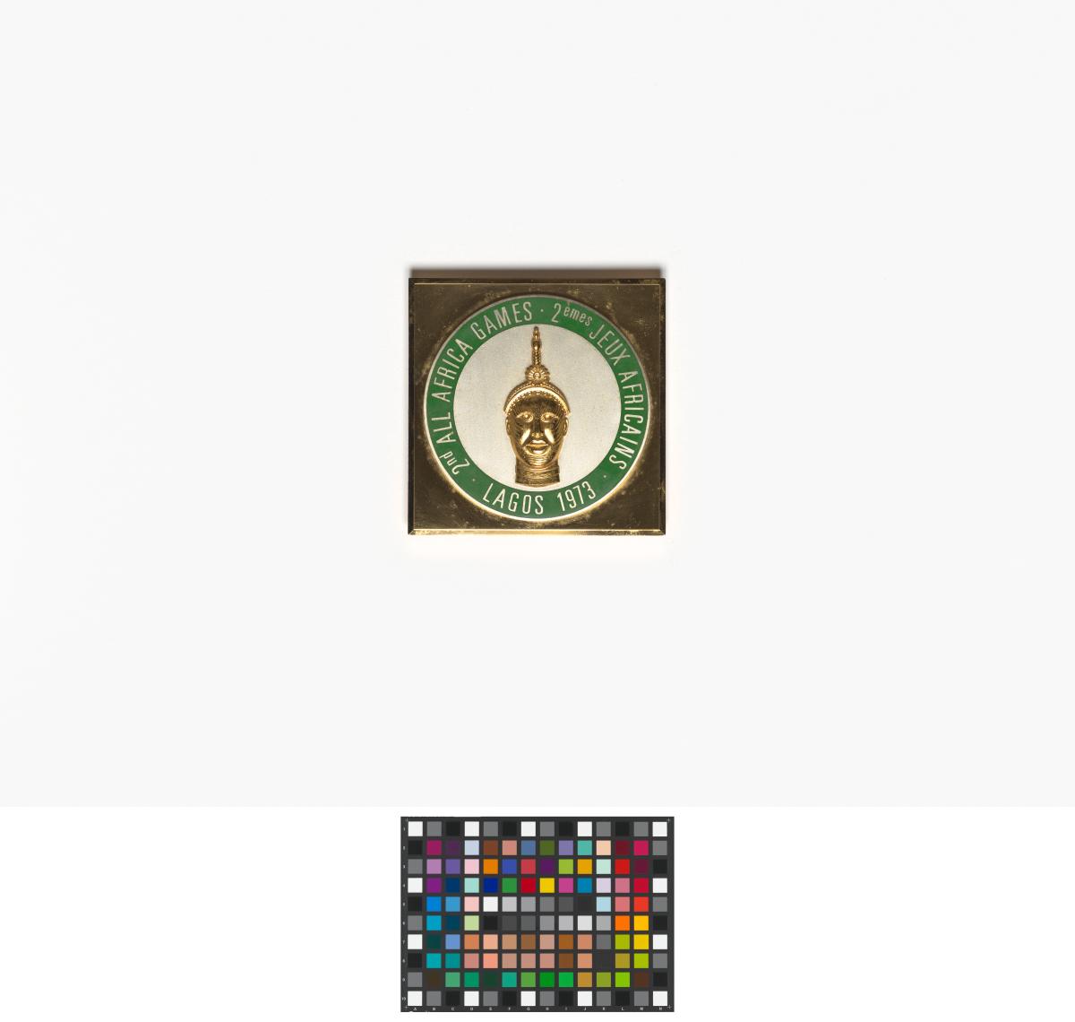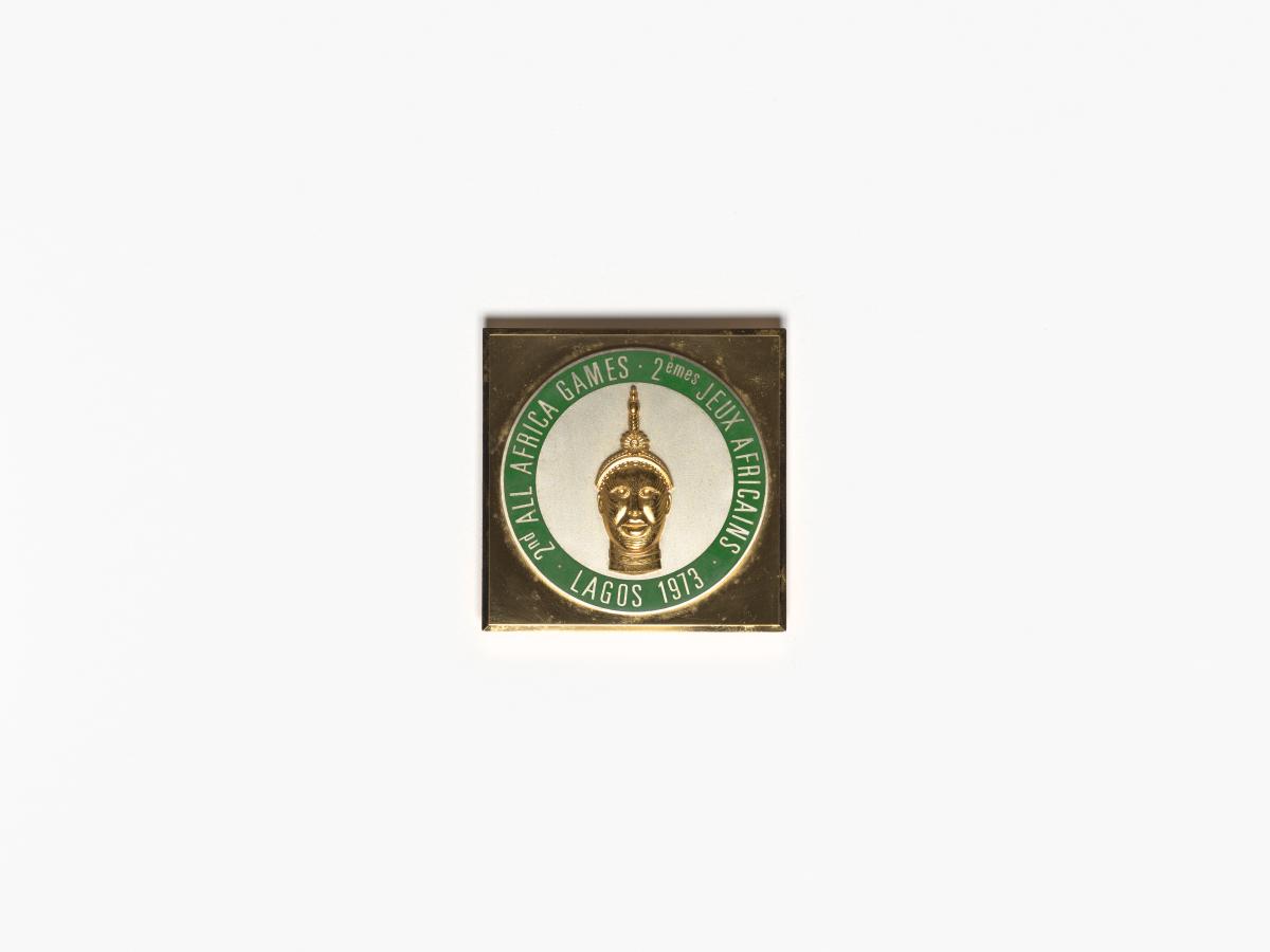 Plaque with stand, depicting the Games' emblem including the ‘Ori Olokun’ head, inscription.: "2nd All Africa Games Lagos 1973".