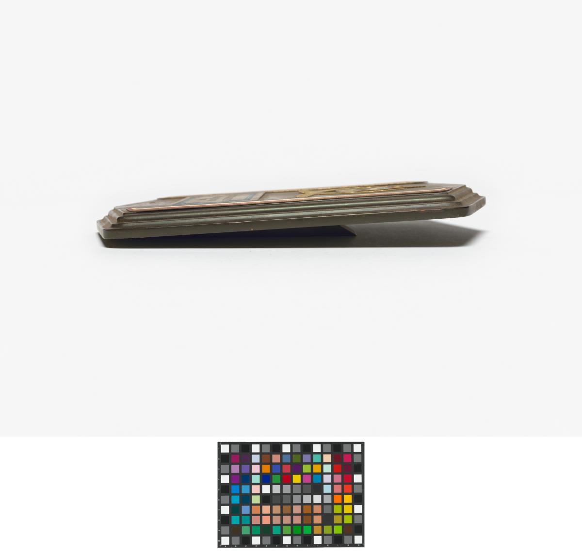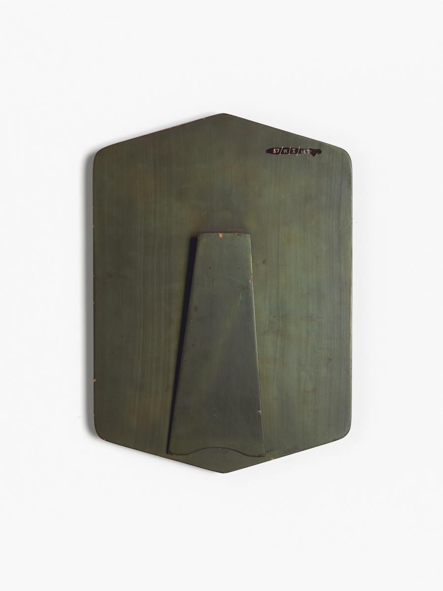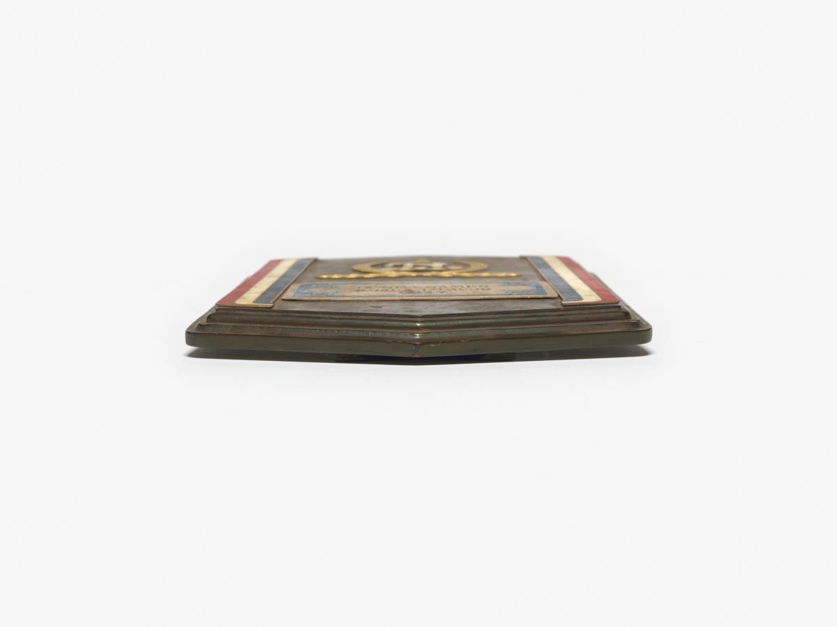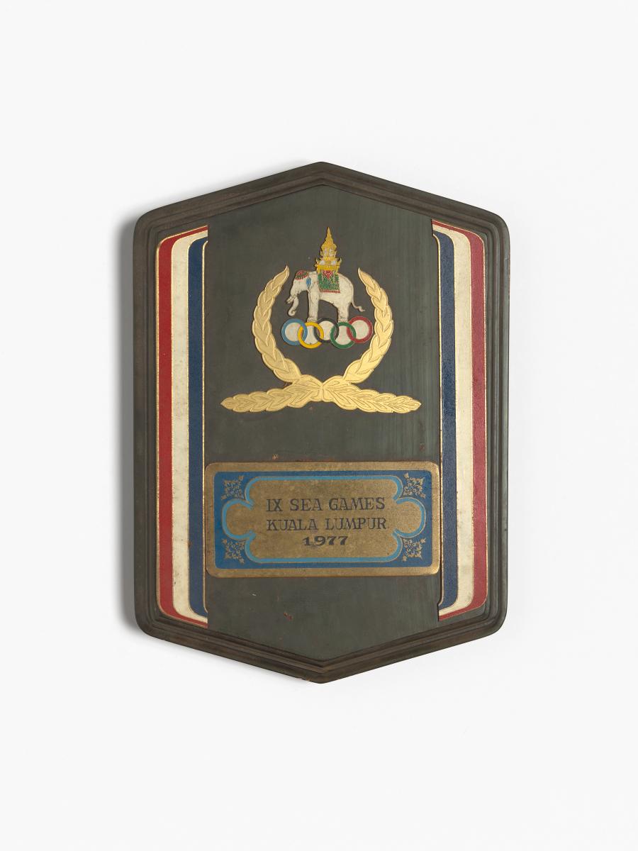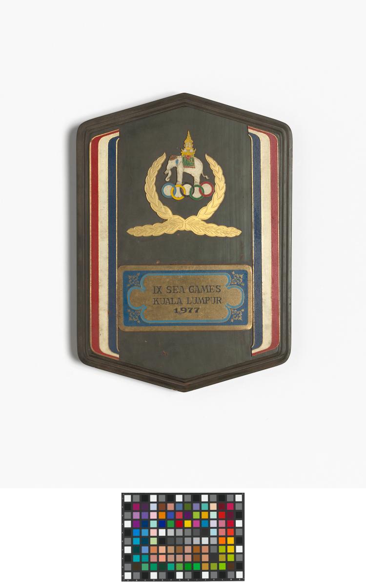 Plaque with Games' emblem, colors of the Malaysian flag and caption: "IX SEA Games / Kuala Lumpur / 1977". With stand.