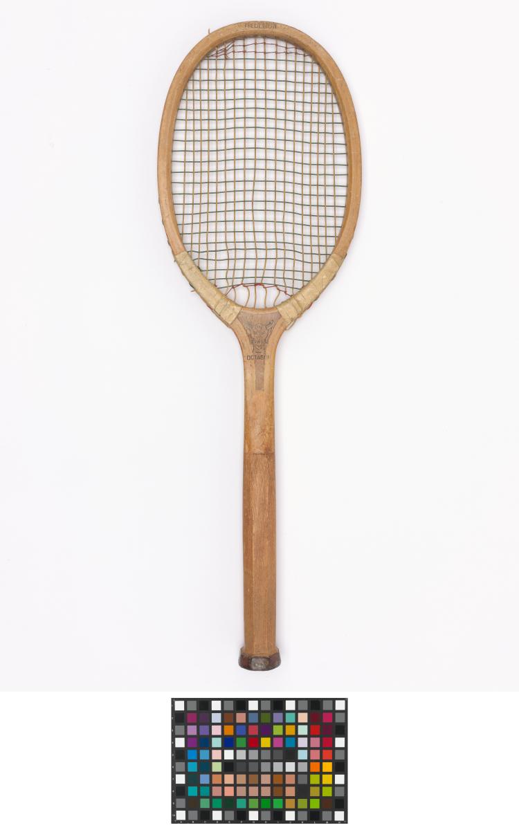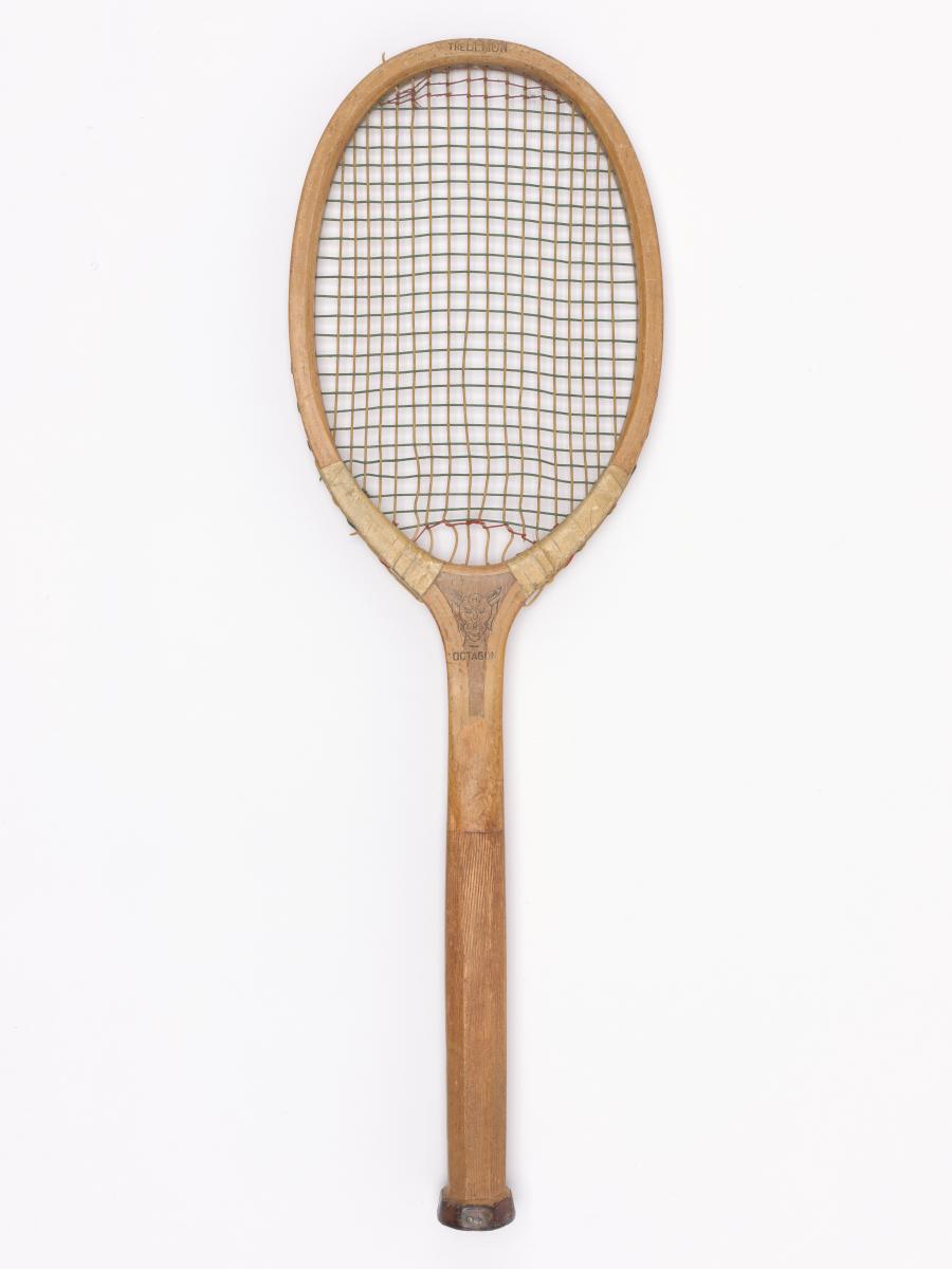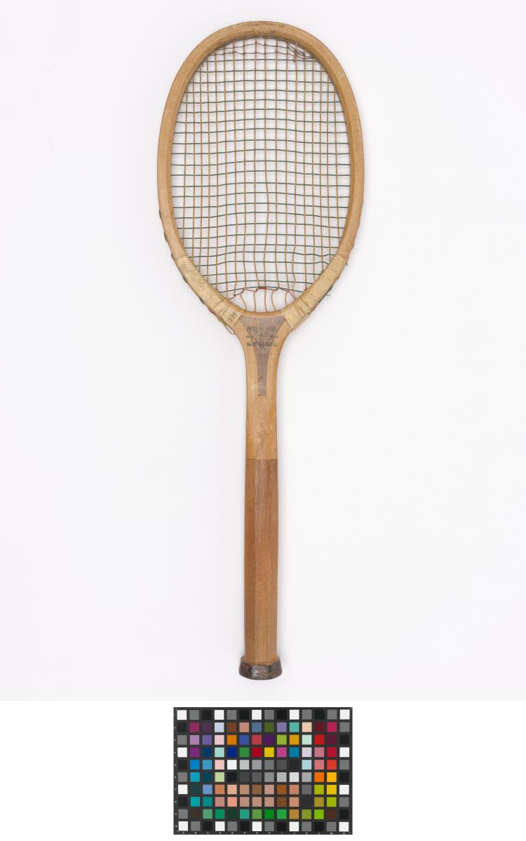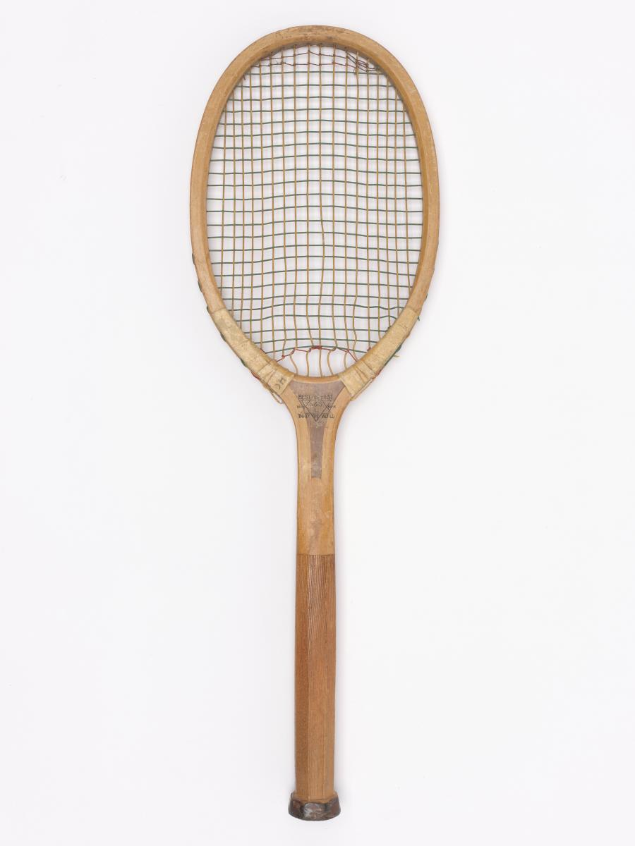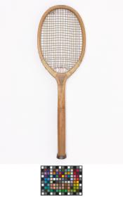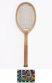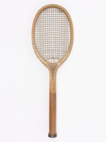 Oval frame with concave wedge. Fine-grooved octagonal handle. Leather butt cap. Horizontal strings with a few rows of additional cross strings at the upper and lower end of the string bed.