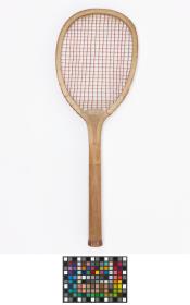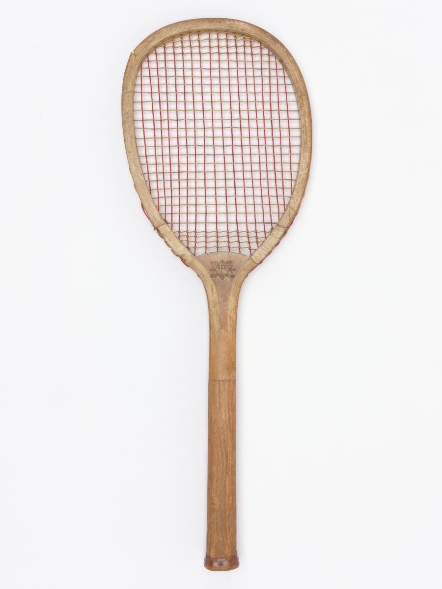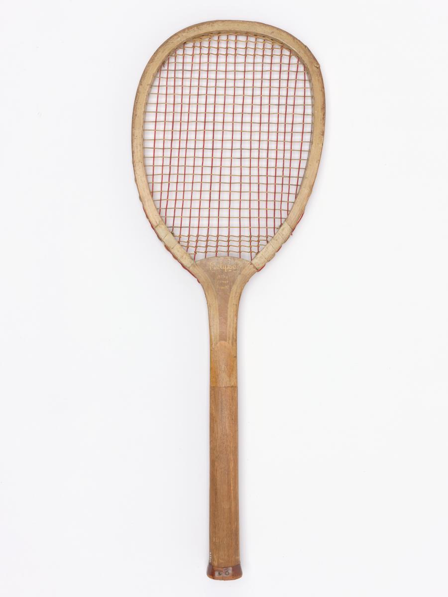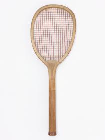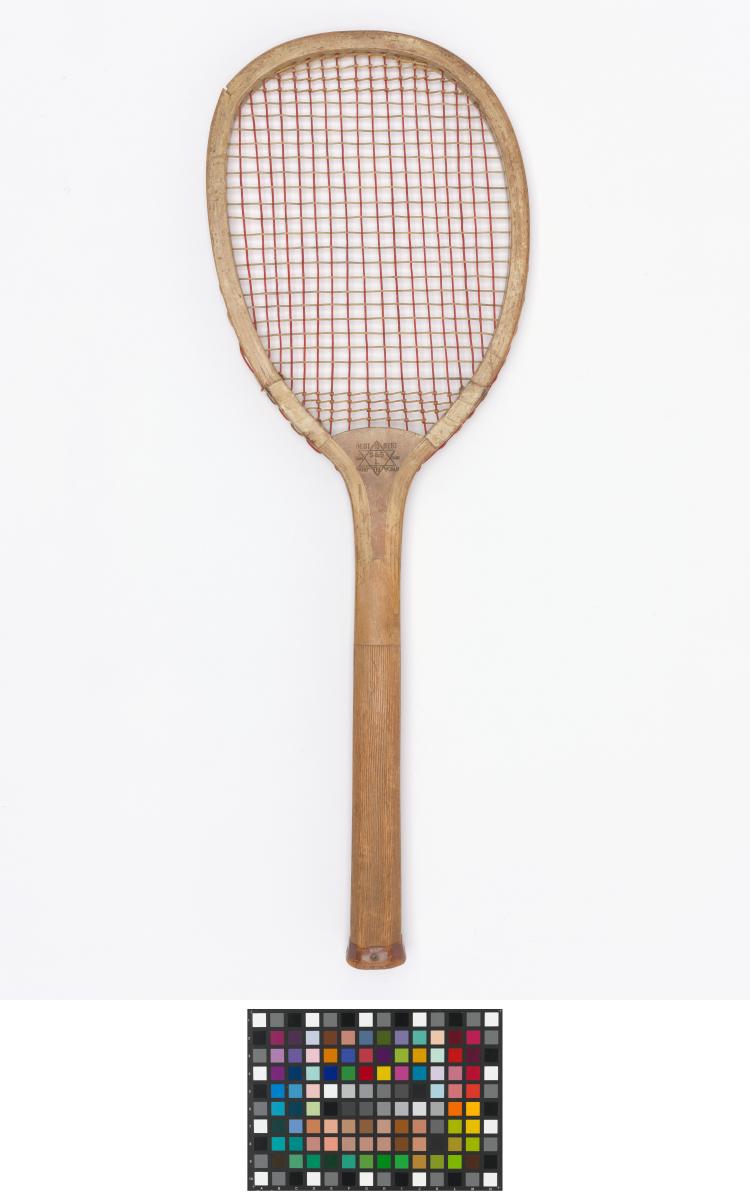 Pear-shaped frame with convex wedge. Fine-grooved octagonal handle with leather butt cap. Horizontal strings with a few rows of additional cross strings at the upper and lower end of the string bed.