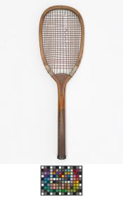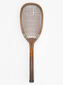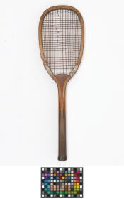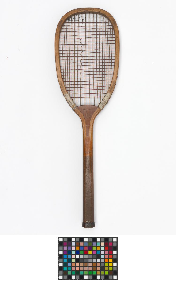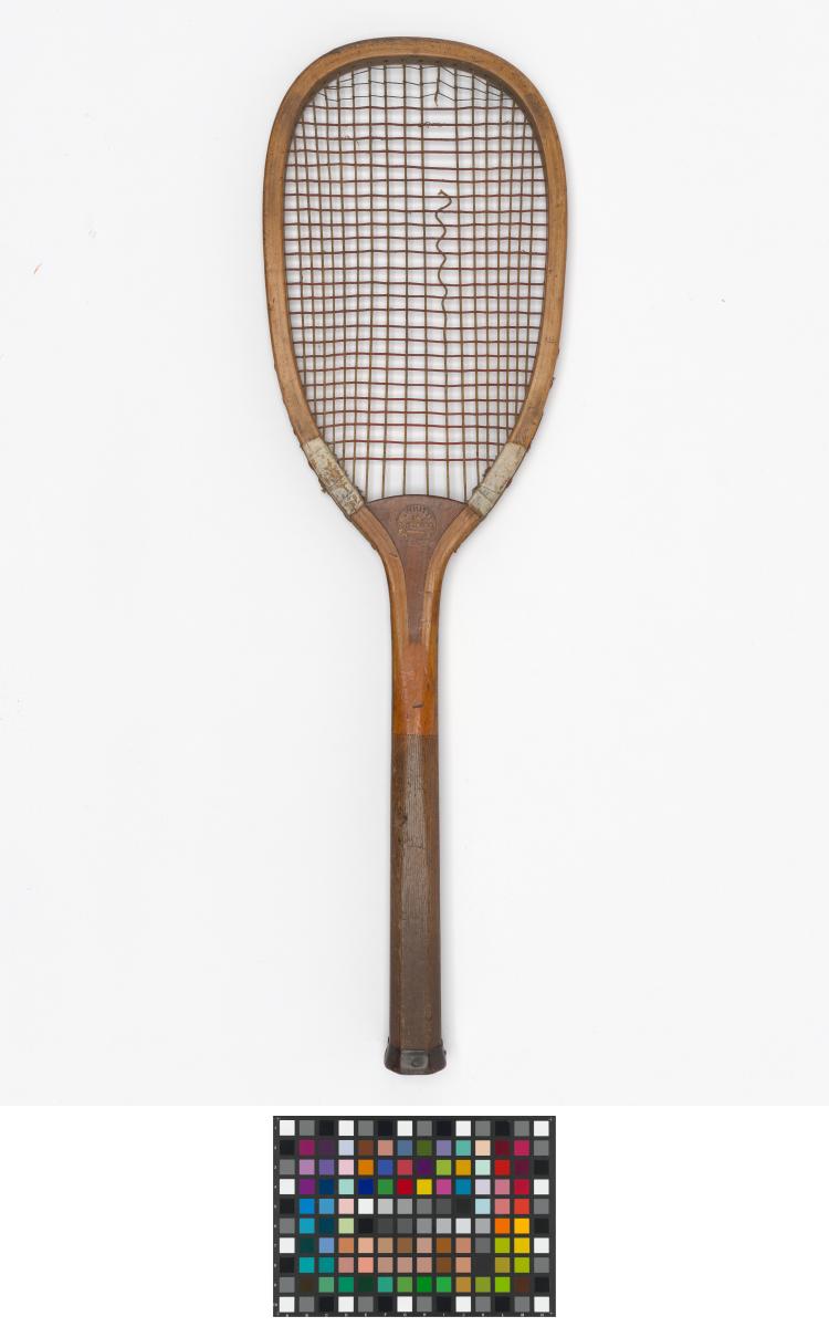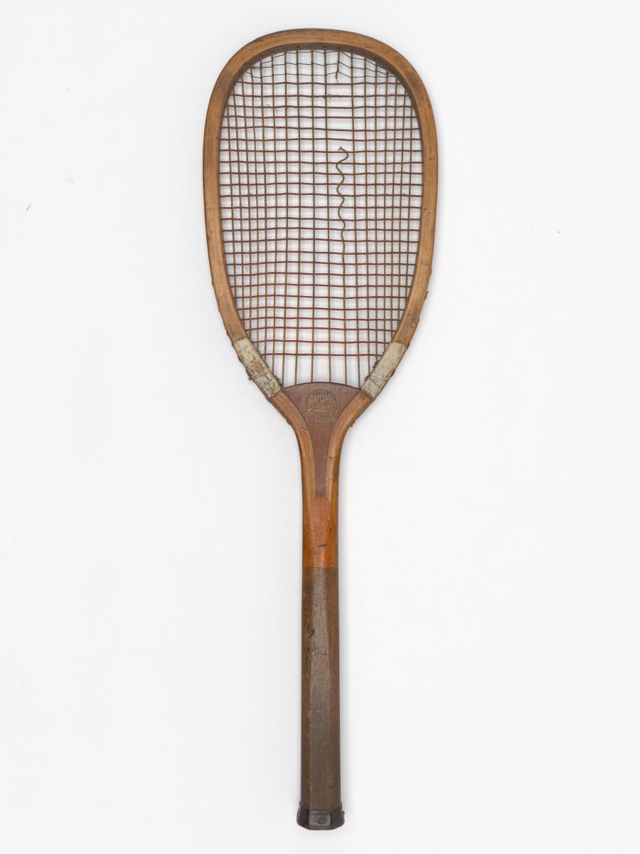 Solid ash flat top frame with convex wedge. Fine-grooved octagonal handle. Leather butt cap. Horizontal strings with a few rows of additional cross strings at the upper end of the string bed.